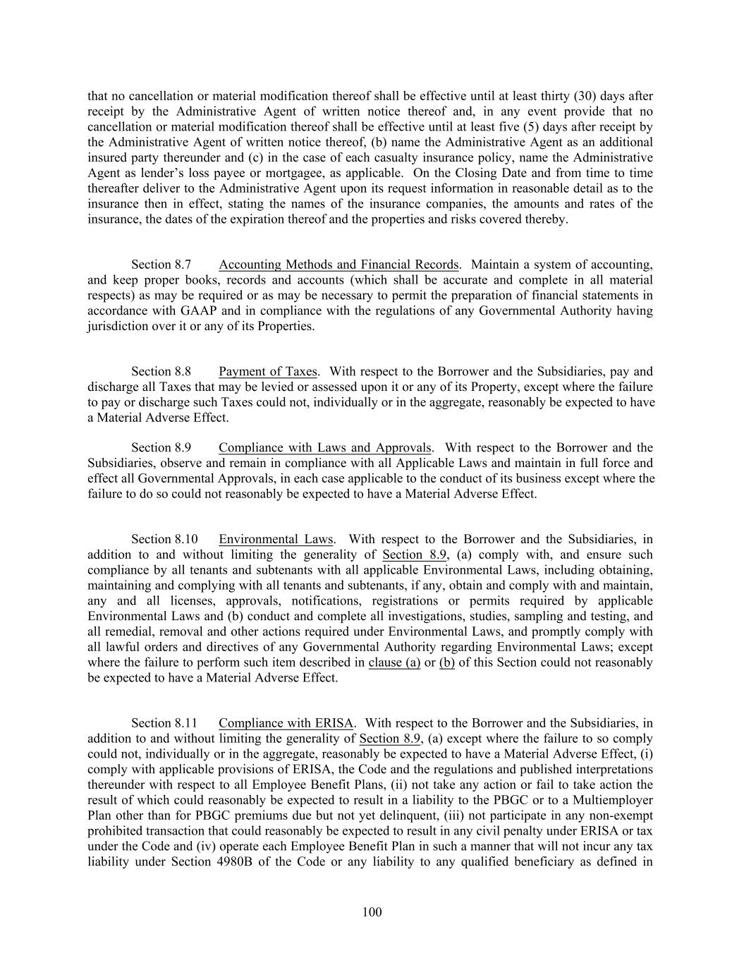 that no cancellation or material modification thereof shall be effective until at least thirty (30) days afterreceipt by the Administrative Agent of written notice thereof and, in any event provide that nocancellation or material modification thereof shall be effective until at least five (5) days after receipt bythe Administrative Agent of written notice thereof, (b) name the Administrative Agent as an additionalinsured party thereunder and (c) in the case of each casualty insurance policy, name the AdministrativeAgent as lender’s loss payee or mortgagee, as applicable. On the Closing Date and from time to timethereafter deliver to the Administrative Agent upon its request information in reasonable detail as to theinsurance then in effect, stating the names of the insurance companies, the amounts and rates of theinsurance, the dates of the expiration thereof and the properties and risks covered thereby.Section 8.7 Accounting Methods and Financial Records. Maintain a system of accounting,and keep proper books, records and accounts (which shall be accurate and complete in all materialrespects) as may be required or as may be necessary to permit the preparation of financial statements inaccordance with GAAP and in compliance with the regulations of any Governmental Authority havingjurisdiction over it or any of its Properties.Section 8.8 Payment of Taxes. With respect to the Borrower and the Subsidiaries, pay anddischarge all Taxes that may be levied or assessed upon it or any of its Property, except where the failureto pay or discharge such Taxes could not, individually or in the aggregate, reasonably be expected to havea Material Adverse Effect.Section 8.9 Compliance with Laws and Approvals. With respect to the Borrower and theSubsidiaries, observe and remain in compliance with all Applicable Laws and maintain in full force andeffect all Governmental Approvals, in each case applicable to the conduct of its business except where thefailure to do so could not reasonably be expected to have a Material Adverse Effect.Section 8.10 Environmental Laws. With respect to the Borrower and the Subsidiaries, inaddition to and without limiting the generality of Section 8.9, (a) comply with, and ensure suchcompliance by all tenants and subtenants with all applicable Environmental Laws, including obtaining,maintaining and complying with all tenants and subtenants, if any, obtain and comply with and maintain,any and all licenses, approvals, notifications, registrations or permits required by applicableEnvironmental Laws and (b) conduct and complete all investigations, studies, sampling and testing, andall remedial, removal and other actions required under Environmental Laws, and promptly comply withall lawful orders and directives of any Governmental Authority regarding Environmental Laws; exceptwhere the failure to perform such item described in clause (a) or (b) of this Section could not reasonablybe expected to have a Material Adverse Effect.Section 8.11 Compliance with ERISA. With respect to the Borrower and the Subsidiaries, inaddition to and without limiting the generality of Section 8.9, (a) except where the failure to so complycould not, individually or in the aggregate, reasonably be expected to have a Material Adverse Effect, (i)comply with applicable provisions of ERISA, the Code and the regulations and published interpretationsthereunder with respect to all Employee Benefit Plans, (ii) not take any action or fail to take action theresult of which could reasonably be expected to result in a liability to the PBGC or to a MultiemployerPlan other than for PBGC premiums due but not yet delinquent, (iii) not participate in any non-exemptprohibited transaction that could reasonably be expected to result in any civil penalty under ERISA or taxunder the Code and (iv) operate each Employee Benefit Plan in such a manner that will not incur any taxliability under Section 4980B of the Code or any liability to any qualified beneficiary as defined in100