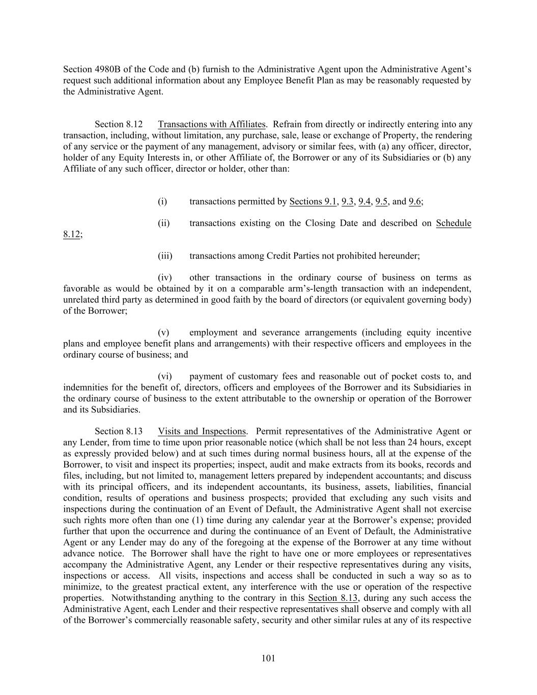 Section 4980B of the Code and (b) furnish to the Administrative Agent upon the Administrative Agent’srequest such additional information about any Employee Benefit Plan as may be reasonably requested bythe Administrative Agent.Section 8.12 Transactions with Affiliates. Refrain from directly or indirectly entering into anytransaction, including, without limitation, any purchase, sale, lease or exchange of Property, the renderingof any service or the payment of any management, advisory or similar fees, with (a) any officer, director,holder of any Equity Interests in, or other Affiliate of, the Borrower or any of its Subsidiaries or (b) anyAffiliate of any such officer, director or holder, other than:(i) transactions permitted by Sections 9.1, 9.3, 9.4, 9.5, and 9.6;(ii) transactions existing on the Closing Date and described on Schedule8.12; (iii) transactions among Credit Parties not prohibited hereunder;(iv) other transactions in the ordinary course of business on terms asfavorable as would be obtained by it on a comparable arm’s-length transaction with an independent,unrelated third party as determined in good faith by the board of directors (or equivalent governing body)of the Borrower; (v) employment and severance arrangements (including equity incentiveplans and employee benefit plans and arrangements) with their respective officers and employees in theordinary course of business; and(vi) payment of customary fees and reasonable out of pocket costs to, andindemnities for the benefit of, directors, officers and employees of the Borrower and its Subsidiaries inthe ordinary course of business to the extent attributable to the ownership or operation of the Borrowerand its Subsidiaries.Section 8.13 Visits and Inspections. Permit representatives of the Administrative Agent orany Lender, from time to time upon prior reasonable notice (which shall be not less than 24 hours, exceptas expressly provided below) and at such times during normal business hours, all at the expense of theBorrower, to visit and inspect its properties; inspect, audit and make extracts from its books, records andfiles, including, but not limited to, management letters prepared by independent accountants; and discusswith its principal officers, and its independent accountants, its business, assets, liabilities, financialcondition, results of operations and business prospects; provided that excluding any such visits andinspections during the continuation of an Event of Default, the Administrative Agent shall not exercisesuch rights more often than one (1) time during any calendar year at the Borrower’s expense; providedfurther that upon the occurrence and during the continuance of an Event of Default, the AdministrativeAgent or any Lender may do any of the foregoing at the expense of the Borrower at any time withoutadvance notice. The Borrower shall have the right to have one or more employees or representativesaccompany the Administrative Agent, any Lender or their respective representatives during any visits,inspections or access. All visits, inspections and access shall be conducted in such a way so as tominimize, to the greatest practical extent, any interference with the use or operation of the respectiveproperties. Notwithstanding anything to the contrary in this Section 8.13, during any such access theAdministrative Agent, each Lender and their respective representatives shall observe and comply with allof the Borrower’s commercially reasonable safety, security and other similar rules at any of its respective101