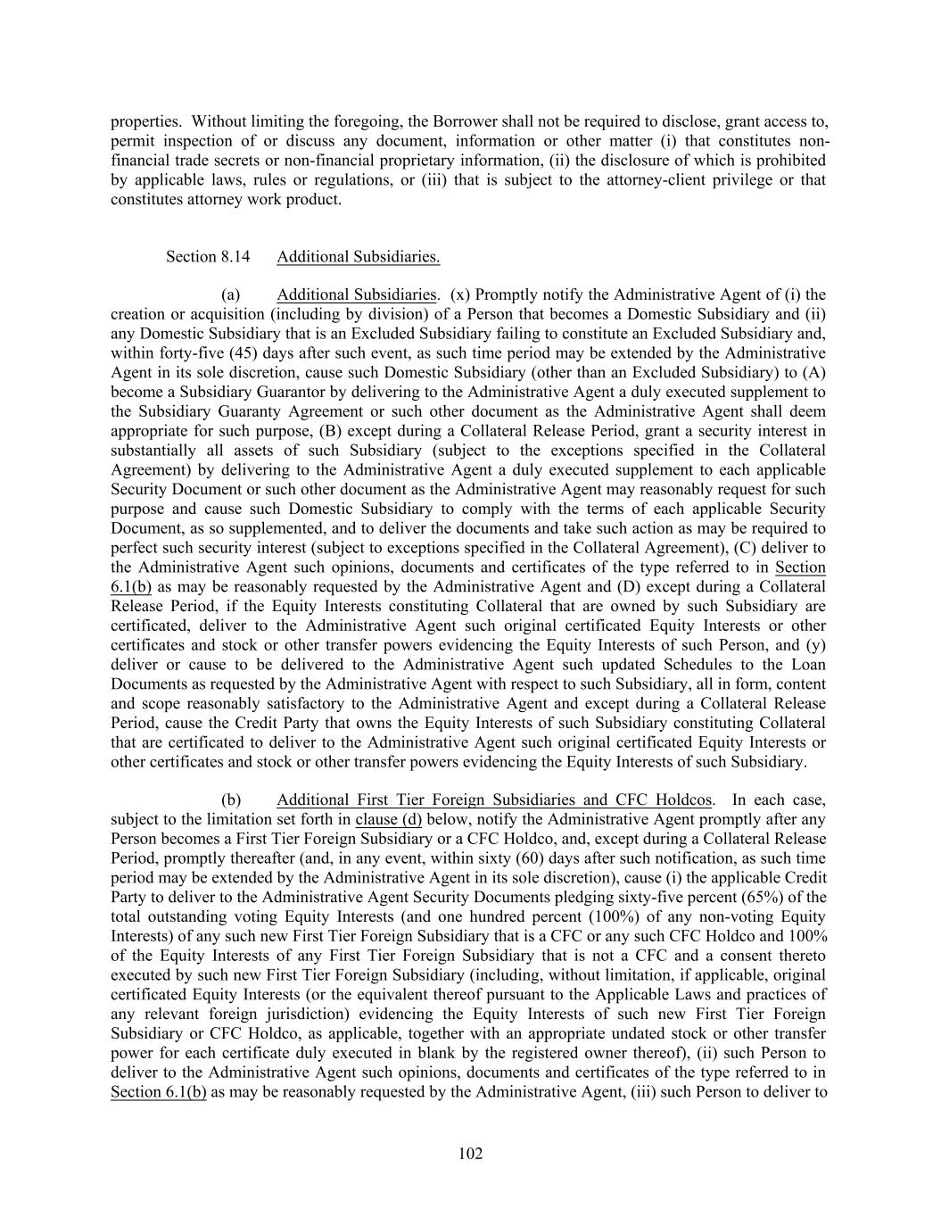 properties. Without limiting the foregoing, the Borrower shall not be required to disclose, grant access to,permit inspection of or discuss any document, information or other matter (i) that constitutes non-financial trade secrets or non-financial proprietary information, (ii) the disclosure of which is prohibitedby applicable laws, rules or regulations, or (iii) that is subject to the attorney-client privilege or thatconstitutes attorney work product.Section 8.14 Additional Subsidiaries.(a) Additional Subsidiaries. (x) Promptly notify the Administrative Agent of (i) thecreation or acquisition (including by division) of a Person that becomes a Domestic Subsidiary and (ii)any Domestic Subsidiary that is an Excluded Subsidiary failing to constitute an Excluded Subsidiary and,within forty-five (45) days after such event, as such time period may be extended by the AdministrativeAgent in its sole discretion, cause such Domestic Subsidiary (other than an Excluded Subsidiary) to (A)become a Subsidiary Guarantor by delivering to the Administrative Agent a duly executed supplement tothe Subsidiary Guaranty Agreement or such other document as the Administrative Agent shall deemappropriate for such purpose, (B) except during a Collateral Release Period, grant a security interest insubstantially all assets of such Subsidiary (subject to the exceptions specified in the CollateralAgreement) by delivering to the Administrative Agent a duly executed supplement to each applicableSecurity Document or such other document as the Administrative Agent may reasonably request for suchpurpose and cause such Domestic Subsidiary to comply with the terms of each applicable SecurityDocument, as so supplemented, and to deliver the documents and take such action as may be required toperfect such security interest (subject to exceptions specified in the Collateral Agreement), (C) deliver tothe Administrative Agent such opinions, documents and certificates of the type referred to in Section6.1(b) as may be reasonably requested by the Administrative Agent and (D) except during a CollateralRelease Period, if the Equity Interests constituting Collateral that are owned by such Subsidiary arecertificated, deliver to the Administrative Agent such original certificated Equity Interests or othercertificates and stock or other transfer powers evidencing the Equity Interests of such Person, and (y)deliver or cause to be delivered to the Administrative Agent such updated Schedules to the LoanDocuments as requested by the Administrative Agent with respect to such Subsidiary, all in form, contentand scope reasonably satisfactory to the Administrative Agent and except during a Collateral ReleasePeriod, cause the Credit Party that owns the Equity Interests of such Subsidiary constituting Collateralthat are certificated to deliver to the Administrative Agent such original certificated Equity Interests orother certificates and stock or other transfer powers evidencing the Equity Interests of such Subsidiary.(b) Additional First Tier Foreign Subsidiaries and CFC Holdcos. In each case,subject to the limitation set forth in clause (d) below, notify the Administrative Agent promptly after anyPerson becomes a First Tier Foreign Subsidiary or a CFC Holdco, and, except during a Collateral ReleasePeriod, promptly thereafter (and, in any event, within sixty (60) days after such notification, as such timeperiod may be extended by the Administrative Agent in its sole discretion), cause (i) the applicable CreditParty to deliver to the Administrative Agent Security Documents pledging sixty-five percent (65%) of thetotal outstanding voting Equity Interests (and one hundred percent (100%) of any non-voting EquityInterests) of any such new First Tier Foreign Subsidiary that is a CFC or any such CFC Holdco and 100%of the Equity Interests of any First Tier Foreign Subsidiary that is not a CFC and a consent theretoexecuted by such new First Tier Foreign Subsidiary (including, without limitation, if applicable, originalcertificated Equity Interests (or the equivalent thereof pursuant to the Applicable Laws and practices ofany relevant foreign jurisdiction) evidencing the Equity Interests of such new First Tier ForeignSubsidiary or CFC Holdco, as applicable, together with an appropriate undated stock or other transferpower for each certificate duly executed in blank by the registered owner thereof), (ii) such Person todeliver to the Administrative Agent such opinions, documents and certificates of the type referred to inSection 6.1(b) as may be reasonably requested by the Administrative Agent, (iii) such Person to deliver to102