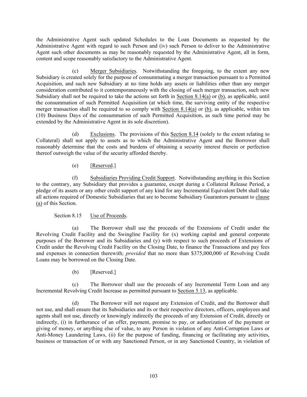 the Administrative Agent such updated Schedules to the Loan Documents as requested by theAdministrative Agent with regard to such Person and (iv) such Person to deliver to the AdministrativeAgent such other documents as may be reasonably requested by the Administrative Agent, all in form,content and scope reasonably satisfactory to the Administrative Agent.(c) Merger Subsidiaries. Notwithstanding the foregoing, to the extent any newSubsidiary is created solely for the purpose of consummating a merger transaction pursuant to a PermittedAcquisition, and such new Subsidiary at no time holds any assets or liabilities other than any mergerconsideration contributed to it contemporaneously with the closing of such merger transaction, such newSubsidiary shall not be required to take the actions set forth in Section 8.14(a) or (b), as applicable, untilthe consummation of such Permitted Acquisition (at which time, the surviving entity of the respectivemerger transaction shall be required to so comply with Section 8.14(a) or (b), as applicable, within ten(10) Business Days of the consummation of such Permitted Acquisition, as such time period may beextended by the Administrative Agent in its sole discretion).(d) Exclusions. The provisions of this Section 8.14 (solely to the extent relating toCollateral) shall not apply to assets as to which the Administrative Agent and the Borrower shallreasonably determine that the costs and burdens of obtaining a security interest therein or perfectionthereof outweigh the value of the security afforded thereby.(e) [Reserved.](f) Subsidiaries Providing Credit Support. Notwithstanding anything in this Sectionto the contrary, any Subsidiary that provides a guarantee, except during a Collateral Release Period, apledge of its assets or any other credit support of any kind for any Incremental Equivalent Debt shall takeall actions required of Domestic Subsidiaries that are to become Subsidiary Guarantors pursuant to clause(a) of this Section.Section 8.15 Use of Proceeds.(a) The Borrower shall use the proceeds of the Extensions of Credit under theRevolving Credit Facility and the Swingline Facility for (x) working capital and general corporatepurposes of the Borrower and its Subsidiaries and (y) with respect to such proceeds of Extensions ofCredit under the Revolving Credit Facility on the Closing Date, to finance the Transactions and pay feesand expenses in connection therewith; provided that no more than $375,000,000 of Revolving CreditLoans may be borrowed on the Closing Date.(b) [Reserved.](c) The Borrower shall use the proceeds of any Incremental Term Loan and anyIncremental Revolving Credit Increase as permitted pursuant to Section 5.13, as applicable.(d) The Borrower will not request any Extension of Credit, and the Borrower shallnot use, and shall ensure that its Subsidiaries and its or their respective directors, officers, employees andagents shall not use, directly or knowingly indirectly the proceeds of any Extension of Credit, directly orindirectly, (i) in furtherance of an offer, payment, promise to pay, or authorization of the payment orgiving of money, or anything else of value, to any Person in violation of any Anti-Corruption Laws orAnti-Money Laundering Laws, (ii) for the purpose of funding, financing or facilitating any activities,business or transaction of or with any Sanctioned Person, or in any Sanctioned Country, in violation of103