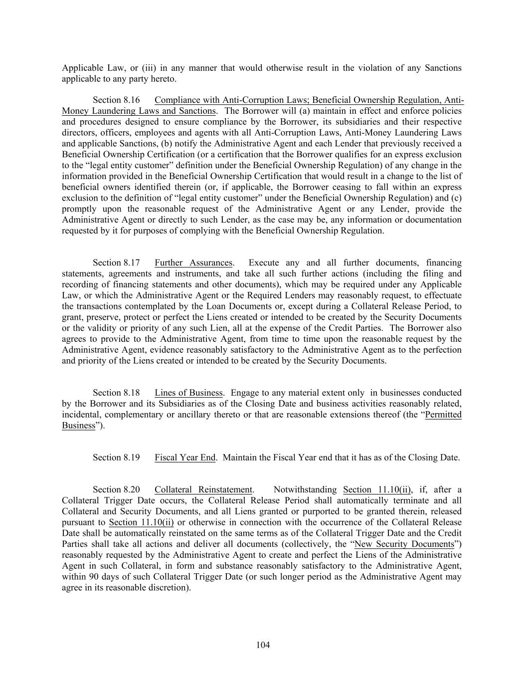 Applicable Law, or (iii) in any manner that would otherwise result in the violation of any Sanctionsapplicable to any party hereto.Section 8.16 Compliance with Anti-Corruption Laws; Beneficial Ownership Regulation, Anti-Money Laundering Laws and Sanctions. The Borrower will (a) maintain in effect and enforce policiesand procedures designed to ensure compliance by the Borrower, its subsidiaries and their respectivedirectors, officers, employees and agents with all Anti-Corruption Laws, Anti-Money Laundering Lawsand applicable Sanctions, (b) notify the Administrative Agent and each Lender that previously received aBeneficial Ownership Certification (or a certification that the Borrower qualifies for an express exclusionto the “legal entity customer” definition under the Beneficial Ownership Regulation) of any change in theinformation provided in the Beneficial Ownership Certification that would result in a change to the list ofbeneficial owners identified therein (or, if applicable, the Borrower ceasing to fall within an expressexclusion to the definition of “legal entity customer” under the Beneficial Ownership Regulation) and (c)promptly upon the reasonable request of the Administrative Agent or any Lender, provide theAdministrative Agent or directly to such Lender, as the case may be, any information or documentationrequested by it for purposes of complying with the Beneficial Ownership Regulation.Section 8.17 Further Assurances. Execute any and all further documents, financingstatements, agreements and instruments, and take all such further actions (including the filing andrecording of financing statements and other documents), which may be required under any ApplicableLaw, or which the Administrative Agent or the Required Lenders may reasonably request, to effectuatethe transactions contemplated by the Loan Documents or, except during a Collateral Release Period, togrant, preserve, protect or perfect the Liens created or intended to be created by the Security Documentsor the validity or priority of any such Lien, all at the expense of the Credit Parties. The Borrower alsoagrees to provide to the Administrative Agent, from time to time upon the reasonable request by theAdministrative Agent, evidence reasonably satisfactory to the Administrative Agent as to the perfectionand priority of the Liens created or intended to be created by the Security Documents.Section 8.18 Lines of Business. Engage to any material extent only in businesses conductedby the Borrower and its Subsidiaries as of the Closing Date and business activities reasonably related,incidental, complementary or ancillary thereto or that are reasonable extensions thereof (the “PermittedBusiness”).Section 8.19 Fiscal Year End. Maintain the Fiscal Year end that it has as of the Closing Date.Section 8.20 Collateral Reinstatement. Notwithstanding Section 11.10(ii), if, after aCollateral Trigger Date occurs, the Collateral Release Period shall automatically terminate and allCollateral and Security Documents, and all Liens granted or purported to be granted therein, releasedpursuant to Section 11.10(ii) or otherwise in connection with the occurrence of the Collateral ReleaseDate shall be automatically reinstated on the same terms as of the Collateral Trigger Date and the CreditParties shall take all actions and deliver all documents (collectively, the “New Security Documents”)reasonably requested by the Administrative Agent to create and perfect the Liens of the AdministrativeAgent in such Collateral, in form and substance reasonably satisfactory to the Administrative Agent,within 90 days of such Collateral Trigger Date (or such longer period as the Administrative Agent mayagree in its reasonable discretion). 104
