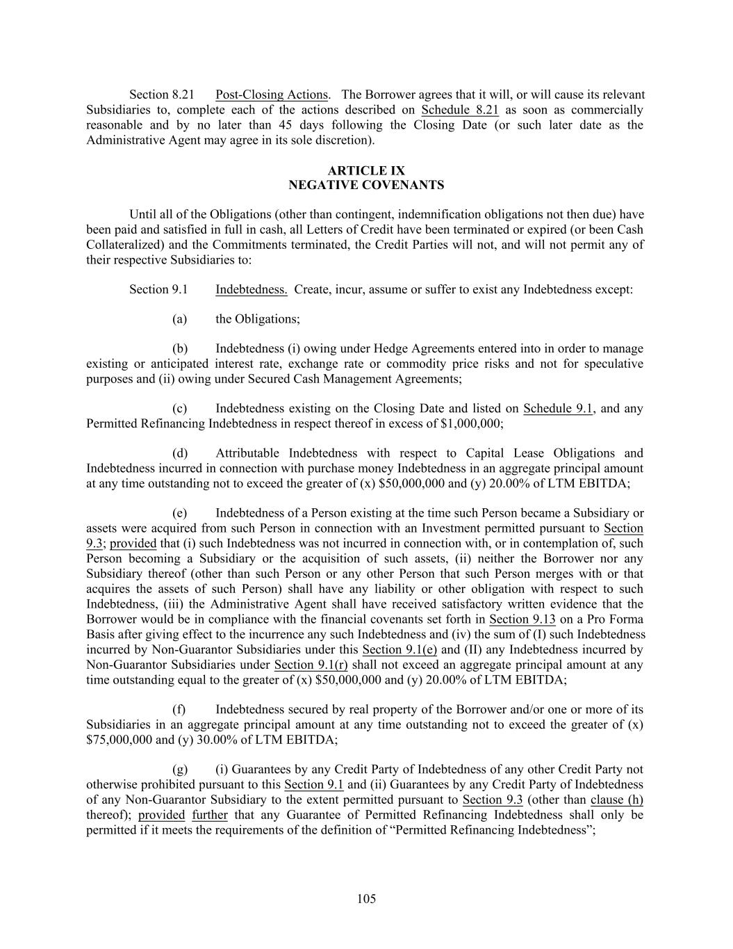 Section 8.21 Post-Closing Actions. The Borrower agrees that it will, or will cause its relevantSubsidiaries to, complete each of the actions described on Schedule 8.21 as soon as commerciallyreasonable and by no later than 45 days following the Closing Date (or such later date as theAdministrative Agent may agree in its sole discretion).ARTICLE IXNEGATIVE COVENANTSUntil all of the Obligations (other than contingent, indemnification obligations not then due) havebeen paid and satisfied in full in cash, all Letters of Credit have been terminated or expired (or been CashCollateralized) and the Commitments terminated, the Credit Parties will not, and will not permit any oftheir respective Subsidiaries to:Section 9.1 Indebtedness. Create, incur, assume or suffer to exist any Indebtedness except:(a) the Obligations;(b) Indebtedness (i) owing under Hedge Agreements entered into in order to manageexisting or anticipated interest rate, exchange rate or commodity price risks and not for speculativepurposes and (ii) owing under Secured Cash Management Agreements;(c) Indebtedness existing on the Closing Date and listed on Schedule 9.1, and anyPermitted Refinancing Indebtedness in respect thereof in excess of $1,000,000;(d) Attributable Indebtedness with respect to Capital Lease Obligations andIndebtedness incurred in connection with purchase money Indebtedness in an aggregate principal amountat any time outstanding not to exceed the greater of (x) $50,000,000 and (y) 20.00% of LTM EBITDA;(e) Indebtedness of a Person existing at the time such Person became a Subsidiary orassets were acquired from such Person in connection with an Investment permitted pursuant to Section9.3; provided that (i) such Indebtedness was not incurred in connection with, or in contemplation of, suchPerson becoming a Subsidiary or the acquisition of such assets, (ii) neither the Borrower nor anySubsidiary thereof (other than such Person or any other Person that such Person merges with or thatacquires the assets of such Person) shall have any liability or other obligation with respect to suchIndebtedness, (iii) the Administrative Agent shall have received satisfactory written evidence that theBorrower would be in compliance with the financial covenants set forth in Section 9.13 on a Pro FormaBasis after giving effect to the incurrence any such Indebtedness and (iv) the sum of (I) such Indebtednessincurred by Non-Guarantor Subsidiaries under this Section 9.1(e) and (II) any Indebtedness incurred byNon-Guarantor Subsidiaries under Section 9.1(r) shall not exceed an aggregate principal amount at anytime outstanding equal to the greater of (x) $50,000,000 and (y) 20.00% of LTM EBITDA;(f) Indebtedness secured by real property of the Borrower and/or one or more of itsSubsidiaries in an aggregate principal amount at any time outstanding not to exceed the greater of (x)$75,000,000 and (y) 30.00% of LTM EBITDA;(g) (i) Guarantees by any Credit Party of Indebtedness of any other Credit Party nototherwise prohibited pursuant to this Section 9.1 and (ii) Guarantees by any Credit Party of Indebtednessof any Non-Guarantor Subsidiary to the extent permitted pursuant to Section 9.3 (other than clause (h)thereof); provided further that any Guarantee of Permitted Refinancing Indebtedness shall only bepermitted if it meets the requirements of the definition of “Permitted Refinancing Indebtedness”;105