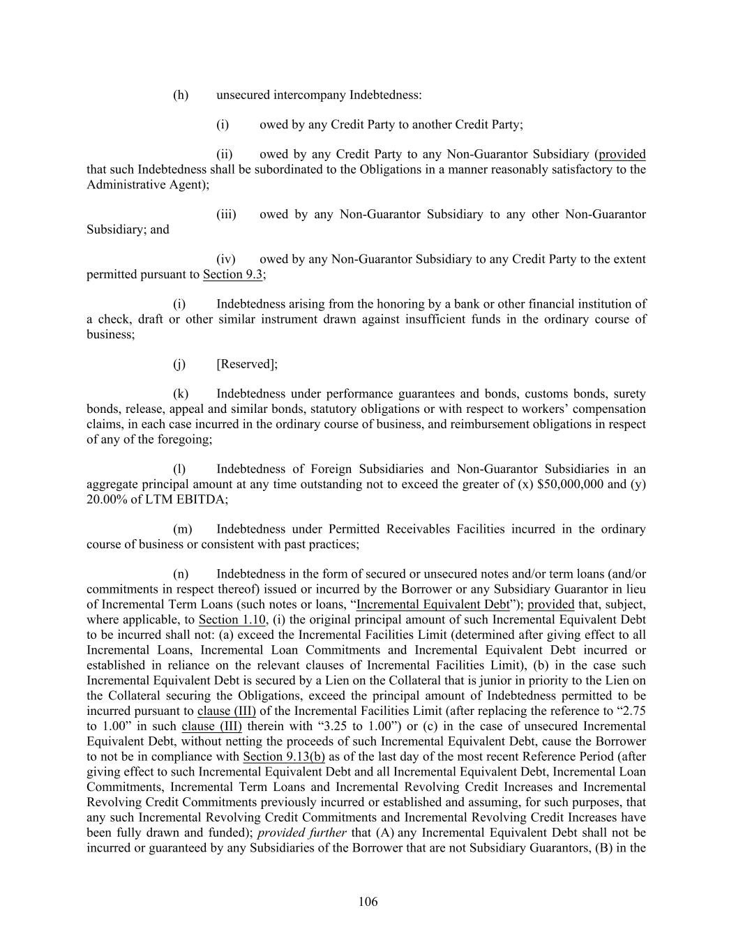 (h) unsecured intercompany Indebtedness:(i) owed by any Credit Party to another Credit Party;(ii) owed by any Credit Party to any Non-Guarantor Subsidiary (providedthat such Indebtedness shall be subordinated to the Obligations in a manner reasonably satisfactory to theAdministrative Agent); (iii) owed by any Non-Guarantor Subsidiary to any other Non-GuarantorSubsidiary; and (iv) owed by any Non-Guarantor Subsidiary to any Credit Party to the extentpermitted pursuant to Section 9.3;(i) Indebtedness arising from the honoring by a bank or other financial institution ofa check, draft or other similar instrument drawn against insufficient funds in the ordinary course ofbusiness; (j) [Reserved];(k) Indebtedness under performance guarantees and bonds, customs bonds, suretybonds, release, appeal and similar bonds, statutory obligations or with respect to workers’ compensationclaims, in each case incurred in the ordinary course of business, and reimbursement obligations in respectof any of the foregoing;(l) Indebtedness of Foreign Subsidiaries and Non-Guarantor Subsidiaries in anaggregate principal amount at any time outstanding not to exceed the greater of (x) $50,000,000 and (y)20.00% of LTM EBITDA;(m) Indebtedness under Permitted Receivables Facilities incurred in the ordinarycourse of business or consistent with past practices;(n) Indebtedness in the form of secured or unsecured notes and/or term loans (and/orcommitments in respect thereof) issued or incurred by the Borrower or any Subsidiary Guarantor in lieuof Incremental Term Loans (such notes or loans, “Incremental Equivalent Debt”); provided that, subject,where applicable, to Section 1.10, (i) the original principal amount of such Incremental Equivalent Debtto be incurred shall not: (a) exceed the Incremental Facilities Limit (determined after giving effect to allIncremental Loans, Incremental Loan Commitments and Incremental Equivalent Debt incurred orestablished in reliance on the relevant clauses of Incremental Facilities Limit), (b) in the case suchIncremental Equivalent Debt is secured by a Lien on the Collateral that is junior in priority to the Lien onthe Collateral securing the Obligations, exceed the principal amount of Indebtedness permitted to beincurred pursuant to clause (III) of the Incremental Facilities Limit (after replacing the reference to “2.75to 1.00” in such clause (III) therein with “3.25 to 1.00”) or (c) in the case of unsecured IncrementalEquivalent Debt, without netting the proceeds of such Incremental Equivalent Debt, cause the Borrowerto not be in compliance with Section 9.13(b) as of the last day of the most recent Reference Period (aftergiving effect to such Incremental Equivalent Debt and all Incremental Equivalent Debt, Incremental LoanCommitments, Incremental Term Loans and Incremental Revolving Credit Increases and IncrementalRevolving Credit Commitments previously incurred or established and assuming, for such purposes, thatany such Incremental Revolving Credit Commitments and Incremental Revolving Credit Increases havebeen fully drawn and funded); provided further that (A) any Incremental Equivalent Debt shall not beincurred or guaranteed by any Subsidiaries of the Borrower that are not Subsidiary Guarantors, (B) in the106