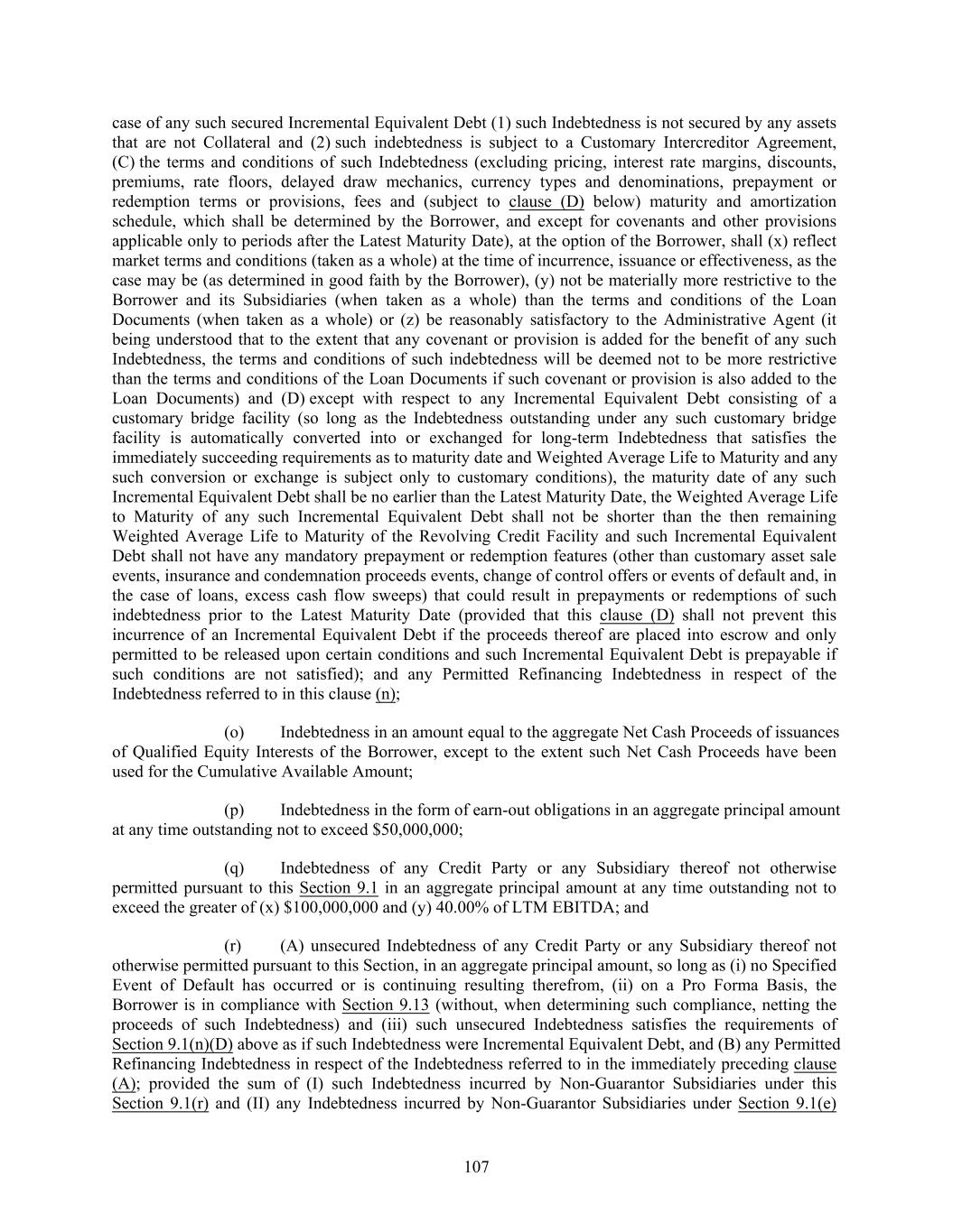 case of any such secured Incremental Equivalent Debt (1) such Indebtedness is not secured by any assetsthat are not Collateral and (2) such indebtedness is subject to a Customary Intercreditor Agreement,(C) the terms and conditions of such Indebtedness (excluding pricing, interest rate margins, discounts,premiums, rate floors, delayed draw mechanics, currency types and denominations, prepayment orredemption terms or provisions, fees and (subject to clause (D) below) maturity and amortizationschedule, which shall be determined by the Borrower, and except for covenants and other provisionsapplicable only to periods after the Latest Maturity Date), at the option of the Borrower, shall (x) reflectmarket terms and conditions (taken as a whole) at the time of incurrence, issuance or effectiveness, as thecase may be (as determined in good faith by the Borrower), (y) not be materially more restrictive to theBorrower and its Subsidiaries (when taken as a whole) than the terms and conditions of the LoanDocuments (when taken as a whole) or (z) be reasonably satisfactory to the Administrative Agent (itbeing understood that to the extent that any covenant or provision is added for the benefit of any suchIndebtedness, the terms and conditions of such indebtedness will be deemed not to be more restrictivethan the terms and conditions of the Loan Documents if such covenant or provision is also added to theLoan Documents) and (D) except with respect to any Incremental Equivalent Debt consisting of acustomary bridge facility (so long as the Indebtedness outstanding under any such customary bridgefacility is automatically converted into or exchanged for long-term Indebtedness that satisfies theimmediately succeeding requirements as to maturity date and Weighted Average Life to Maturity and anysuch conversion or exchange is subject only to customary conditions), the maturity date of any suchIncremental Equivalent Debt shall be no earlier than the Latest Maturity Date, the Weighted Average Lifeto Maturity of any such Incremental Equivalent Debt shall not be shorter than the then remainingWeighted Average Life to Maturity of the Revolving Credit Facility and such Incremental EquivalentDebt shall not have any mandatory prepayment or redemption features (other than customary asset saleevents, insurance and condemnation proceeds events, change of control offers or events of default and, inthe case of loans, excess cash flow sweeps) that could result in prepayments or redemptions of suchindebtedness prior to the Latest Maturity Date (provided that this clause (D) shall not prevent thisincurrence of an Incremental Equivalent Debt if the proceeds thereof are placed into escrow and onlypermitted to be released upon certain conditions and such Incremental Equivalent Debt is prepayable ifsuch conditions are not satisfied); and any Permitted Refinancing Indebtedness in respect of theIndebtedness referred to in this clause (n);(o) Indebtedness in an amount equal to the aggregate Net Cash Proceeds of issuancesof Qualified Equity Interests of the Borrower, except to the extent such Net Cash Proceeds have beenused for the Cumulative Available Amount;(p) Indebtedness in the form of earn-out obligations in an aggregate principal amountat any time outstanding not to exceed $50,000,000;(q) Indebtedness of any Credit Party or any Subsidiary thereof not otherwisepermitted pursuant to this Section 9.1 in an aggregate principal amount at any time outstanding not toexceed the greater of (x) $100,000,000 and (y) 40.00% of LTM EBITDA; and(r) (A) unsecured Indebtedness of any Credit Party or any Subsidiary thereof nototherwise permitted pursuant to this Section, in an aggregate principal amount, so long as (i) no SpecifiedEvent of Default has occurred or is continuing resulting therefrom, (ii) on a Pro Forma Basis, theBorrower is in compliance with Section 9.13 (without, when determining such compliance, netting theproceeds of such Indebtedness) and (iii) such unsecured Indebtedness satisfies the requirements ofSection 9.1(n)(D) above as if such Indebtedness were Incremental Equivalent Debt, and (B) any PermittedRefinancing Indebtedness in respect of the Indebtedness referred to in the immediately preceding clause(A); provided the sum of (I) such Indebtedness incurred by Non-Guarantor Subsidiaries under thisSection 9.1(r) and (II) any Indebtedness incurred by Non-Guarantor Subsidiaries under Section 9.1(e)107