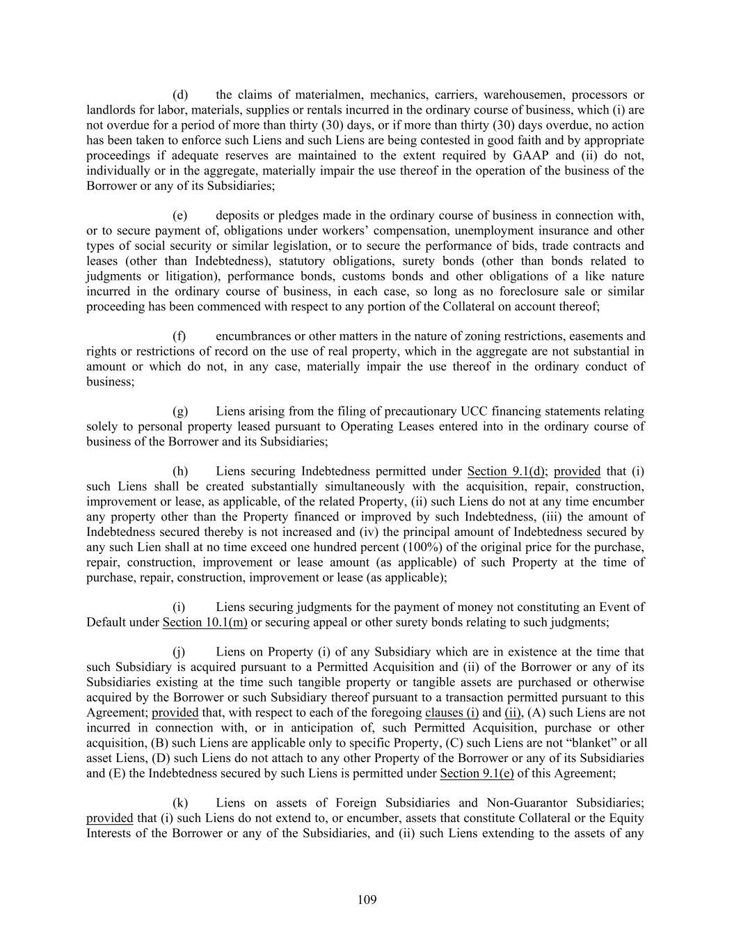 (d) the claims of materialmen, mechanics, carriers, warehousemen, processors orlandlords for labor, materials, supplies or rentals incurred in the ordinary course of business, which (i) arenot overdue for a period of more than thirty (30) days, or if more than thirty (30) days overdue, no actionhas been taken to enforce such Liens and such Liens are being contested in good faith and by appropriateproceedings if adequate reserves are maintained to the extent required by GAAP and (ii) do not,individually or in the aggregate, materially impair the use thereof in the operation of the business of theBorrower or any of its Subsidiaries;(e) deposits or pledges made in the ordinary course of business in connection with,or to secure payment of, obligations under workers’ compensation, unemployment insurance and othertypes of social security or similar legislation, or to secure the performance of bids, trade contracts andleases (other than Indebtedness), statutory obligations, surety bonds (other than bonds related tojudgments or litigation), performance bonds, customs bonds and other obligations of a like natureincurred in the ordinary course of business, in each case, so long as no foreclosure sale or similarproceeding has been commenced with respect to any portion of the Collateral on account thereof;(f) encumbrances or other matters in the nature of zoning restrictions, easements andrights or restrictions of record on the use of real property, which in the aggregate are not substantial inamount or which do not, in any case, materially impair the use thereof in the ordinary conduct ofbusiness; (g) Liens arising from the filing of precautionary UCC financing statements relatingsolely to personal property leased pursuant to Operating Leases entered into in the ordinary course ofbusiness of the Borrower and its Subsidiaries;(h) Liens securing Indebtedness permitted under Section 9.1(d); provided that (i)such Liens shall be created substantially simultaneously with the acquisition, repair, construction,improvement or lease, as applicable, of the related Property, (ii) such Liens do not at any time encumberany property other than the Property financed or improved by such Indebtedness, (iii) the amount ofIndebtedness secured thereby is not increased and (iv) the principal amount of Indebtedness secured byany such Lien shall at no time exceed one hundred percent (100%) of the original price for the purchase,repair, construction, improvement or lease amount (as applicable) of such Property at the time ofpurchase, repair, construction, improvement or lease (as applicable);(i) Liens securing judgments for the payment of money not constituting an Event ofDefault under Section 10.1(m) or securing appeal or other surety bonds relating to such judgments;(j) Liens on Property (i) of any Subsidiary which are in existence at the time thatsuch Subsidiary is acquired pursuant to a Permitted Acquisition and (ii) of the Borrower or any of itsSubsidiaries existing at the time such tangible property or tangible assets are purchased or otherwiseacquired by the Borrower or such Subsidiary thereof pursuant to a transaction permitted pursuant to thisAgreement; provided that, with respect to each of the foregoing clauses (i) and (ii), (A) such Liens are notincurred in connection with, or in anticipation of, such Permitted Acquisition, purchase or otheracquisition, (B) such Liens are applicable only to specific Property, (C) such Liens are not “blanket” or allasset Liens, (D) such Liens do not attach to any other Property of the Borrower or any of its Subsidiariesand (E) the Indebtedness secured by such Liens is permitted under Section 9.1(e) of this Agreement;(k) Liens on assets of Foreign Subsidiaries and Non-Guarantor Subsidiaries;provided that (i) such Liens do not extend to, or encumber, assets that constitute Collateral or the EquityInterests of the Borrower or any of the Subsidiaries, and (ii) such Liens extending to the assets of any109