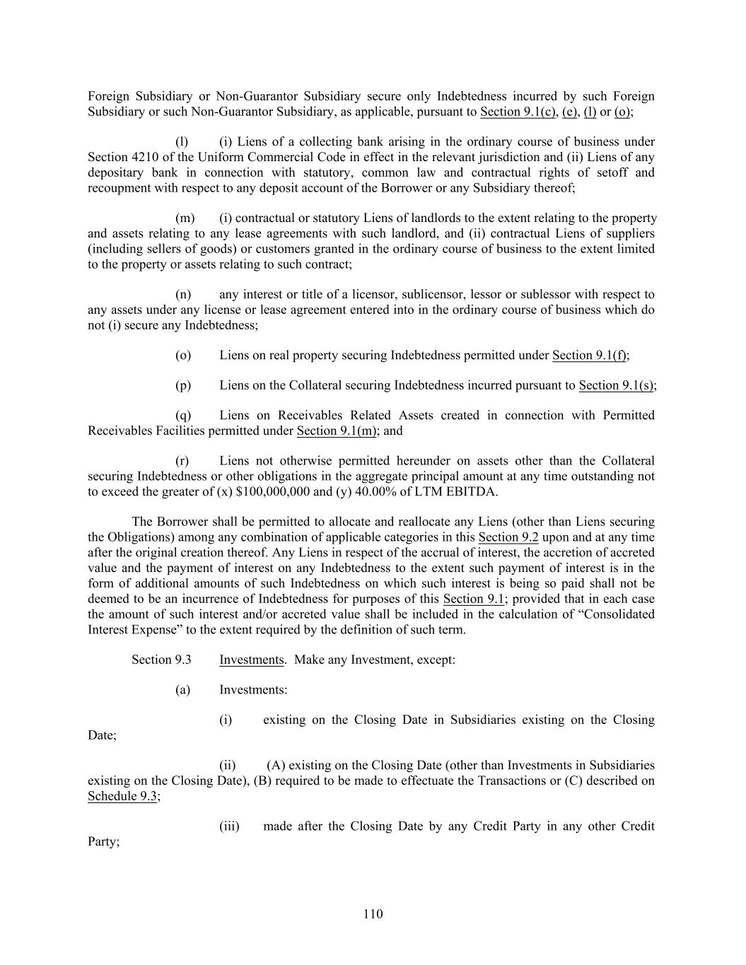 Foreign Subsidiary or Non-Guarantor Subsidiary secure only Indebtedness incurred by such ForeignSubsidiary or such Non-Guarantor Subsidiary, as applicable, pursuant to Section 9.1(c), (e), (l) or (o);(l) (i) Liens of a collecting bank arising in the ordinary course of business underSection 4210 of the Uniform Commercial Code in effect in the relevant jurisdiction and (ii) Liens of anydepositary bank in connection with statutory, common law and contractual rights of setoff andrecoupment with respect to any deposit account of the Borrower or any Subsidiary thereof;(m) (i) contractual or statutory Liens of landlords to the extent relating to the propertyand assets relating to any lease agreements with such landlord, and (ii) contractual Liens of suppliers(including sellers of goods) or customers granted in the ordinary course of business to the extent limitedto the property or assets relating to such contract;(n) any interest or title of a licensor, sublicensor, lessor or sublessor with respect toany assets under any license or lease agreement entered into in the ordinary course of business which donot (i) secure any Indebtedness;(o) Liens on real property securing Indebtedness permitted under Section 9.1(f);(p) Liens on the Collateral securing Indebtedness incurred pursuant to Section 9.1(s);(q) Liens on Receivables Related Assets created in connection with PermittedReceivables Facilities permitted under Section 9.1(m); and(r) Liens not otherwise permitted hereunder on assets other than the Collateralsecuring Indebtedness or other obligations in the aggregate principal amount at any time outstanding notto exceed the greater of (x) $100,000,000 and (y) 40.00% of LTM EBITDA.The Borrower shall be permitted to allocate and reallocate any Liens (other than Liens securingthe Obligations) among any combination of applicable categories in this Section 9.2 upon and at any timeafter the original creation thereof. Any Liens in respect of the accrual of interest, the accretion of accretedvalue and the payment of interest on any Indebtedness to the extent such payment of interest is in theform of additional amounts of such Indebtedness on which such interest is being so paid shall not bedeemed to be an incurrence of Indebtedness for purposes of this Section 9.1; provided that in each casethe amount of such interest and/or accreted value shall be included in the calculation of “ConsolidatedInterest Expense” to the extent required by the definition of such term.Section 9.3 Investments. Make any Investment, except:(a) Investments:(i) existing on the Closing Date in Subsidiaries existing on the ClosingDate; (ii) (A) existing on the Closing Date (other than Investments in Subsidiariesexisting on the Closing Date), (B) required to be made to effectuate the Transactions or (C) described onSchedule 9.3; (iii) made after the Closing Date by any Credit Party in any other CreditParty; 110