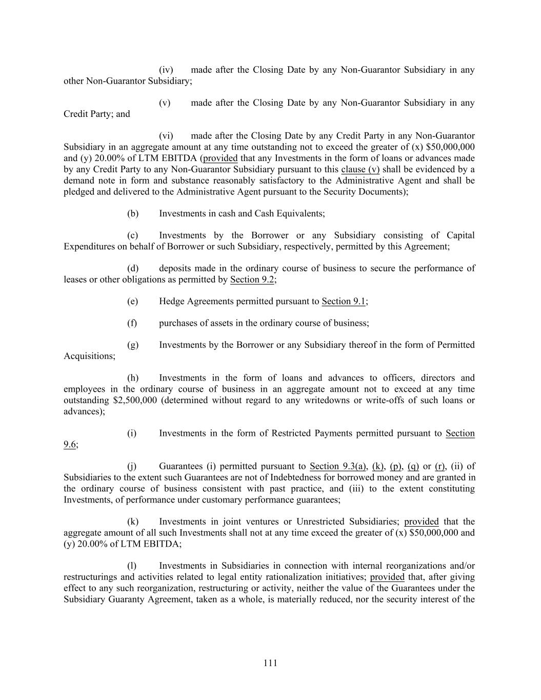 (iv) made after the Closing Date by any Non-Guarantor Subsidiary in anyother Non-Guarantor Subsidiary;(v) made after the Closing Date by any Non-Guarantor Subsidiary in anyCredit Party; and (vi) made after the Closing Date by any Credit Party in any Non-GuarantorSubsidiary in an aggregate amount at any time outstanding not to exceed the greater of (x) $50,000,000and (y) 20.00% of LTM EBITDA (provided that any Investments in the form of loans or advances madeby any Credit Party to any Non-Guarantor Subsidiary pursuant to this clause (v) shall be evidenced by ademand note in form and substance reasonably satisfactory to the Administrative Agent and shall bepledged and delivered to the Administrative Agent pursuant to the Security Documents);(b) Investments in cash and Cash Equivalents;(c) Investments by the Borrower or any Subsidiary consisting of CapitalExpenditures on behalf of Borrower or such Subsidiary, respectively, permitted by this Agreement;(d) deposits made in the ordinary course of business to secure the performance ofleases or other obligations as permitted by Section 9.2;(e) Hedge Agreements permitted pursuant to Section 9.1;(f) purchases of assets in the ordinary course of business;(g) Investments by the Borrower or any Subsidiary thereof in the form of PermittedAcquisitions; (h) Investments in the form of loans and advances to officers, directors andemployees in the ordinary course of business in an aggregate amount not to exceed at any timeoutstanding $2,500,000 (determined without regard to any writedowns or write-offs of such loans oradvances); (i) Investments in the form of Restricted Payments permitted pursuant to Section9.6; (j) Guarantees (i) permitted pursuant to Section 9.3(a), (k), (p), (q) or (r), (ii) ofSubsidiaries to the extent such Guarantees are not of Indebtedness for borrowed money and are granted inthe ordinary course of business consistent with past practice, and (iii) to the extent constitutingInvestments, of performance under customary performance guarantees;(k) Investments in joint ventures or Unrestricted Subsidiaries; provided that theaggregate amount of all such Investments shall not at any time exceed the greater of (x) $50,000,000 and(y) 20.00% of LTM EBITDA;(l) Investments in Subsidiaries in connection with internal reorganizations and/orrestructurings and activities related to legal entity rationalization initiatives; provided that, after givingeffect to any such reorganization, restructuring or activity, neither the value of the Guarantees under theSubsidiary Guaranty Agreement, taken as a whole, is materially reduced, nor the security interest of the111
