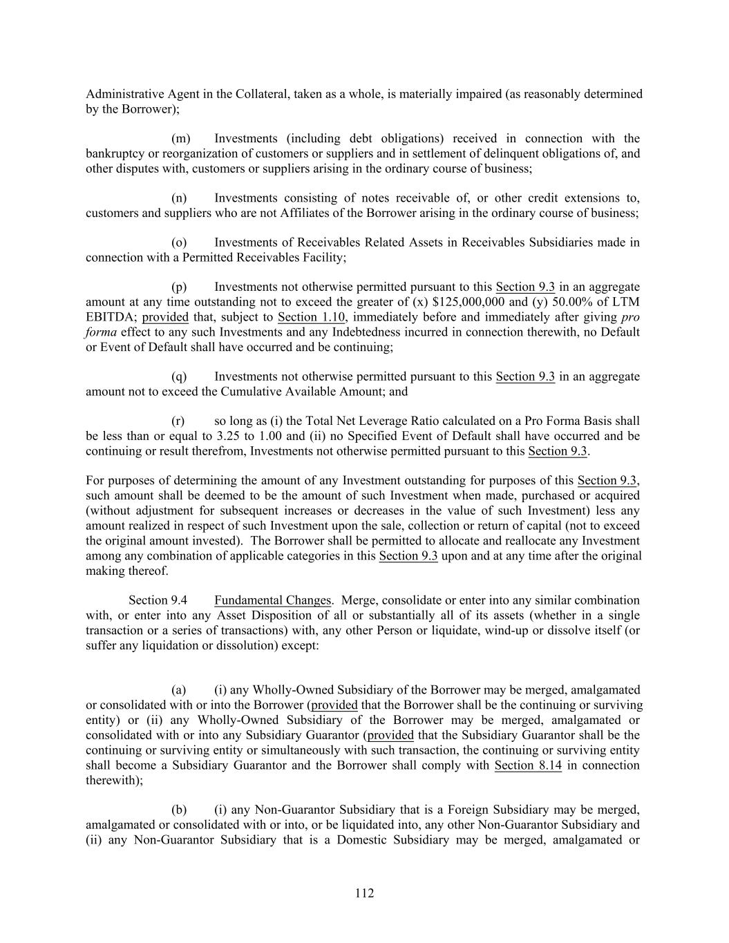 Administrative Agent in the Collateral, taken as a whole, is materially impaired (as reasonably determinedby the Borrower);(m) Investments (including debt obligations) received in connection with thebankruptcy or reorganization of customers or suppliers and in settlement of delinquent obligations of, andother disputes with, customers or suppliers arising in the ordinary course of business;(n) Investments consisting of notes receivable of, or other credit extensions to,customers and suppliers who are not Affiliates of the Borrower arising in the ordinary course of business;(o) Investments of Receivables Related Assets in Receivables Subsidiaries made inconnection with a Permitted Receivables Facility;(p) Investments not otherwise permitted pursuant to this Section 9.3 in an aggregateamount at any time outstanding not to exceed the greater of (x) $125,000,000 and (y) 50.00% of LTMEBITDA; provided that, subject to Section 1.10, immediately before and immediately after giving proforma effect to any such Investments and any Indebtedness incurred in connection therewith, no Defaultor Event of Default shall have occurred and be continuing;(q) Investments not otherwise permitted pursuant to this Section 9.3 in an aggregateamount not to exceed the Cumulative Available Amount; and(r) so long as (i) the Total Net Leverage Ratio calculated on a Pro Forma Basis shallbe less than or equal to 3.25 to 1.00 and (ii) no Specified Event of Default shall have occurred and becontinuing or result therefrom, Investments not otherwise permitted pursuant to this Section 9.3.For purposes of determining the amount of any Investment outstanding for purposes of this Section 9.3,such amount shall be deemed to be the amount of such Investment when made, purchased or acquired(without adjustment for subsequent increases or decreases in the value of such Investment) less anyamount realized in respect of such Investment upon the sale, collection or return of capital (not to exceedthe original amount invested). The Borrower shall be permitted to allocate and reallocate any Investmentamong any combination of applicable categories in this Section 9.3 upon and at any time after the originalmaking thereof.Section 9.4 Fundamental Changes. Merge, consolidate or enter into any similar combinationwith, or enter into any Asset Disposition of all or substantially all of its assets (whether in a singletransaction or a series of transactions) with, any other Person or liquidate, wind-up or dissolve itself (orsuffer any liquidation or dissolution) except:(a) (i) any Wholly-Owned Subsidiary of the Borrower may be merged, amalgamatedor consolidated with or into the Borrower (provided that the Borrower shall be the continuing or survivingentity) or (ii) any Wholly-Owned Subsidiary of the Borrower may be merged, amalgamated orconsolidated with or into any Subsidiary Guarantor (provided that the Subsidiary Guarantor shall be thecontinuing or surviving entity or simultaneously with such transaction, the continuing or surviving entityshall become a Subsidiary Guarantor and the Borrower shall comply with Section 8.14 in connectiontherewith); (b) (i) any Non-Guarantor Subsidiary that is a Foreign Subsidiary may be merged,amalgamated or consolidated with or into, or be liquidated into, any other Non-Guarantor Subsidiary and(ii) any Non-Guarantor Subsidiary that is a Domestic Subsidiary may be merged, amalgamated or112