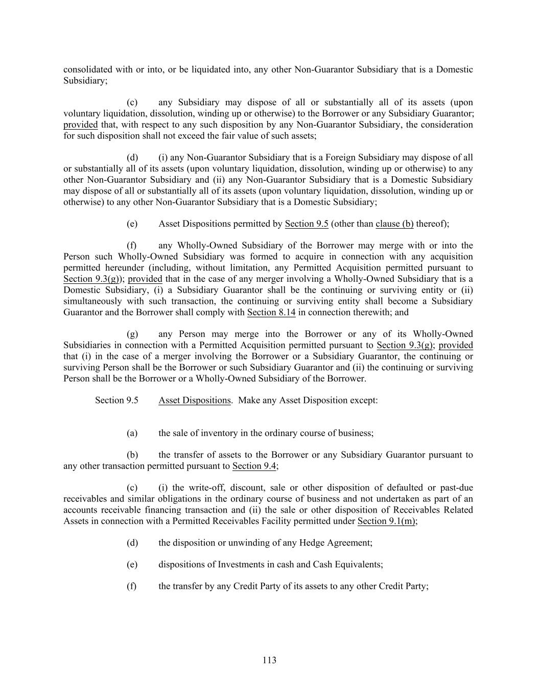 consolidated with or into, or be liquidated into, any other Non-Guarantor Subsidiary that is a DomesticSubsidiary; (c) any Subsidiary may dispose of all or substantially all of its assets (uponvoluntary liquidation, dissolution, winding up or otherwise) to the Borrower or any Subsidiary Guarantor;provided that, with respect to any such disposition by any Non-Guarantor Subsidiary, the considerationfor such disposition shall not exceed the fair value of such assets;(d) (i) any Non-Guarantor Subsidiary that is a Foreign Subsidiary may dispose of allor substantially all of its assets (upon voluntary liquidation, dissolution, winding up or otherwise) to anyother Non-Guarantor Subsidiary and (ii) any Non-Guarantor Subsidiary that is a Domestic Subsidiarymay dispose of all or substantially all of its assets (upon voluntary liquidation, dissolution, winding up orotherwise) to any other Non-Guarantor Subsidiary that is a Domestic Subsidiary;(e) Asset Dispositions permitted by Section 9.5 (other than clause (b) thereof);(f) any Wholly-Owned Subsidiary of the Borrower may merge with or into thePerson such Wholly-Owned Subsidiary was formed to acquire in connection with any acquisitionpermitted hereunder (including, without limitation, any Permitted Acquisition permitted pursuant toSection 9.3(g)); provided that in the case of any merger involving a Wholly-Owned Subsidiary that is aDomestic Subsidiary, (i) a Subsidiary Guarantor shall be the continuing or surviving entity or (ii)simultaneously with such transaction, the continuing or surviving entity shall become a SubsidiaryGuarantor and the Borrower shall comply with Section 8.14 in connection therewith; and(g) any Person may merge into the Borrower or any of its Wholly-OwnedSubsidiaries in connection with a Permitted Acquisition permitted pursuant to Section 9.3(g); providedthat (i) in the case of a merger involving the Borrower or a Subsidiary Guarantor, the continuing orsurviving Person shall be the Borrower or such Subsidiary Guarantor and (ii) the continuing or survivingPerson shall be the Borrower or a Wholly-Owned Subsidiary of the Borrower.Section 9.5 Asset Dispositions. Make any Asset Disposition except:(a) the sale of inventory in the ordinary course of business;(b) the transfer of assets to the Borrower or any Subsidiary Guarantor pursuant toany other transaction permitted pursuant to Section 9.4;(c) (i) the write-off, discount, sale or other disposition of defaulted or past-duereceivables and similar obligations in the ordinary course of business and not undertaken as part of anaccounts receivable financing transaction and (ii) the sale or other disposition of Receivables RelatedAssets in connection with a Permitted Receivables Facility permitted under Section 9.1(m);(d) the disposition or unwinding of any Hedge Agreement;(e) dispositions of Investments in cash and Cash Equivalents;(f) the transfer by any Credit Party of its assets to any other Credit Party;113