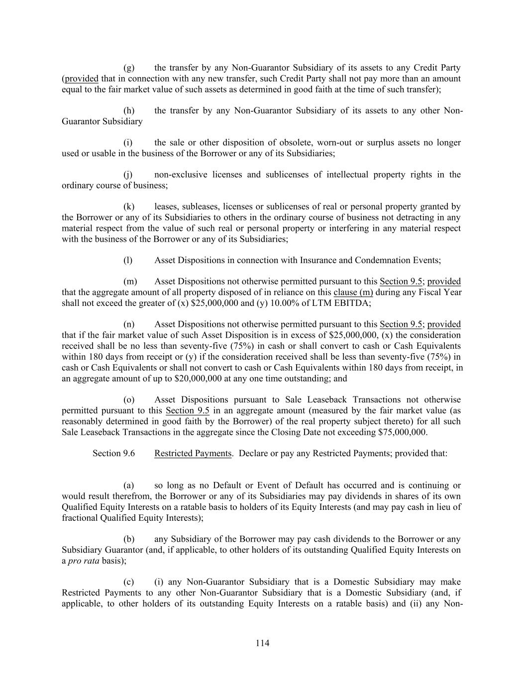 (g) the transfer by any Non-Guarantor Subsidiary of its assets to any Credit Party(provided that in connection with any new transfer, such Credit Party shall not pay more than an amountequal to the fair market value of such assets as determined in good faith at the time of such transfer);(h) the transfer by any Non-Guarantor Subsidiary of its assets to any other Non-Guarantor Subsidiary(i) the sale or other disposition of obsolete, worn-out or surplus assets no longerused or usable in the business of the Borrower or any of its Subsidiaries;(j) non-exclusive licenses and sublicenses of intellectual property rights in theordinary course of business;(k) leases, subleases, licenses or sublicenses of real or personal property granted bythe Borrower or any of its Subsidiaries to others in the ordinary course of business not detracting in anymaterial respect from the value of such real or personal property or interfering in any material respectwith the business of the Borrower or any of its Subsidiaries;(l) Asset Dispositions in connection with Insurance and Condemnation Events;(m) Asset Dispositions not otherwise permitted pursuant to this Section 9.5; providedthat the aggregate amount of all property disposed of in reliance on this clause (m) during any Fiscal Yearshall not exceed the greater of (x) $25,000,000 and (y) 10.00% of LTM EBITDA;(n) Asset Dispositions not otherwise permitted pursuant to this Section 9.5; providedthat if the fair market value of such Asset Disposition is in excess of $25,000,000, (x) the considerationreceived shall be no less than seventy-five (75%) in cash or shall convert to cash or Cash Equivalentswithin 180 days from receipt or (y) if the consideration received shall be less than seventy-five (75%) incash or Cash Equivalents or shall not convert to cash or Cash Equivalents within 180 days from receipt, inan aggregate amount of up to $20,000,000 at any one time outstanding; and(o) Asset Dispositions pursuant to Sale Leaseback Transactions not otherwisepermitted pursuant to this Section 9.5 in an aggregate amount (measured by the fair market value (asreasonably determined in good faith by the Borrower) of the real property subject thereto) for all suchSale Leaseback Transactions in the aggregate since the Closing Date not exceeding $75,000,000.Section 9.6 Restricted Payments. Declare or pay any Restricted Payments; provided that:(a) so long as no Default or Event of Default has occurred and is continuing orwould result therefrom, the Borrower or any of its Subsidiaries may pay dividends in shares of its ownQualified Equity Interests on a ratable basis to holders of its Equity Interests (and may pay cash in lieu offractional Qualified Equity Interests);(b) any Subsidiary of the Borrower may pay cash dividends to the Borrower or anySubsidiary Guarantor (and, if applicable, to other holders of its outstanding Qualified Equity Interests ona pro rata basis);(c) (i) any Non-Guarantor Subsidiary that is a Domestic Subsidiary may makeRestricted Payments to any other Non-Guarantor Subsidiary that is a Domestic Subsidiary (and, ifapplicable, to other holders of its outstanding Equity Interests on a ratable basis) and (ii) any Non-114