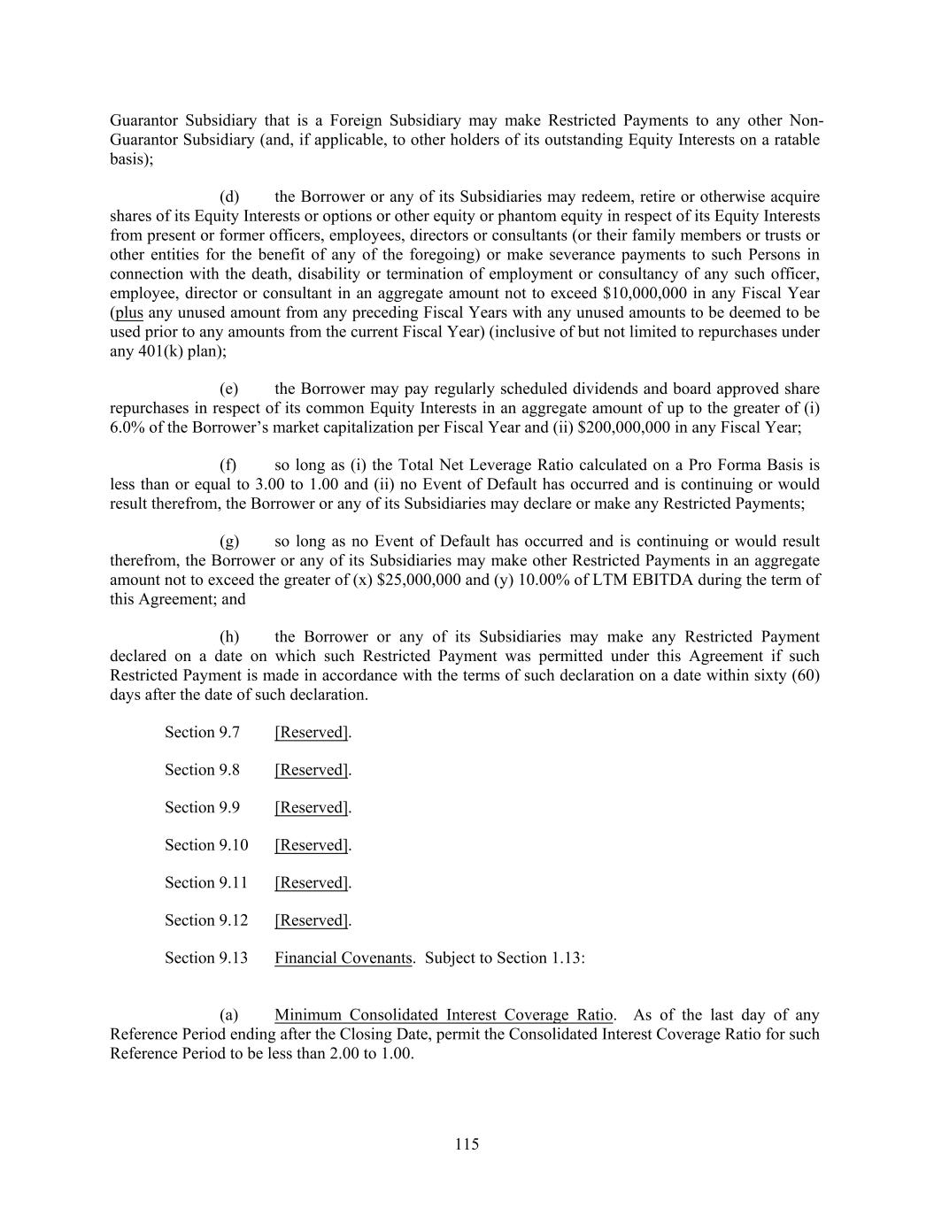 Guarantor Subsidiary that is a Foreign Subsidiary may make Restricted Payments to any other Non-Guarantor Subsidiary (and, if applicable, to other holders of its outstanding Equity Interests on a ratablebasis); (d) the Borrower or any of its Subsidiaries may redeem, retire or otherwise acquireshares of its Equity Interests or options or other equity or phantom equity in respect of its Equity Interestsfrom present or former officers, employees, directors or consultants (or their family members or trusts orother entities for the benefit of any of the foregoing) or make severance payments to such Persons inconnection with the death, disability or termination of employment or consultancy of any such officer,employee, director or consultant in an aggregate amount not to exceed $10,000,000 in any Fiscal Year(plus any unused amount from any preceding Fiscal Years with any unused amounts to be deemed to beused prior to any amounts from the current Fiscal Year) (inclusive of but not limited to repurchases underany 401(k) plan);(e) the Borrower may pay regularly scheduled dividends and board approved sharerepurchases in respect of its common Equity Interests in an aggregate amount of up to the greater of (i)6.0% of the Borrower’s market capitalization per Fiscal Year and (ii) $200,000,000 in any Fiscal Year;(f) so long as (i) the Total Net Leverage Ratio calculated on a Pro Forma Basis isless than or equal to 3.00 to 1.00 and (ii) no Event of Default has occurred and is continuing or wouldresult therefrom, the Borrower or any of its Subsidiaries may declare or make any Restricted Payments;(g) so long as no Event of Default has occurred and is continuing or would resulttherefrom, the Borrower or any of its Subsidiaries may make other Restricted Payments in an aggregateamount not to exceed the greater of (x) $25,000,000 and (y) 10.00% of LTM EBITDA during the term ofthis Agreement; and(h) the Borrower or any of its Subsidiaries may make any Restricted Paymentdeclared on a date on which such Restricted Payment was permitted under this Agreement if suchRestricted Payment is made in accordance with the terms of such declaration on a date within sixty (60)days after the date of such declaration.Section 9.7 [Reserved].Section 9.8 [Reserved].Section 9.9 [Reserved].Section 9.10 [Reserved].Section 9.11 [Reserved].Section 9.12 [Reserved].Section 9.13 Financial Covenants. Subject to Section 1.13:(a) Minimum Consolidated Interest Coverage Ratio. As of the last day of anyReference Period ending after the Closing Date, permit the Consolidated Interest Coverage Ratio for suchReference Period to be less than 2.00 to 1.00. 115
