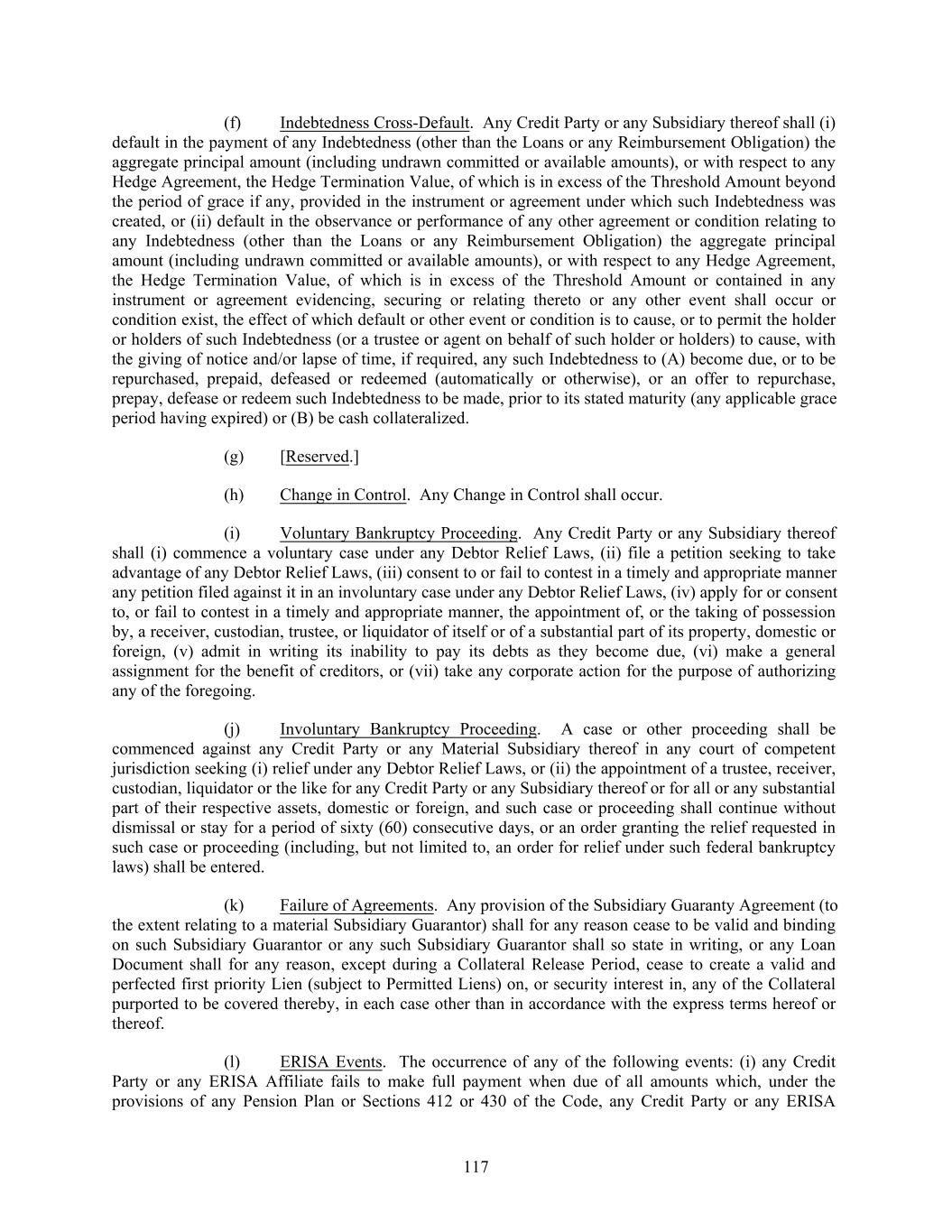 (f) Indebtedness Cross-Default. Any Credit Party or any Subsidiary thereof shall (i)default in the payment of any Indebtedness (other than the Loans or any Reimbursement Obligation) theaggregate principal amount (including undrawn committed or available amounts), or with respect to anyHedge Agreement, the Hedge Termination Value, of which is in excess of the Threshold Amount beyondthe period of grace if any, provided in the instrument or agreement under which such Indebtedness wascreated, or (ii) default in the observance or performance of any other agreement or condition relating toany Indebtedness (other than the Loans or any Reimbursement Obligation) the aggregate principalamount (including undrawn committed or available amounts), or with respect to any Hedge Agreement,the Hedge Termination Value, of which is in excess of the Threshold Amount or contained in anyinstrument or agreement evidencing, securing or relating thereto or any other event shall occur orcondition exist, the effect of which default or other event or condition is to cause, or to permit the holderor holders of such Indebtedness (or a trustee or agent on behalf of such holder or holders) to cause, withthe giving of notice and/or lapse of time, if required, any such Indebtedness to (A) become due, or to berepurchased, prepaid, defeased or redeemed (automatically or otherwise), or an offer to repurchase,prepay, defease or redeem such Indebtedness to be made, prior to its stated maturity (any applicable graceperiod having expired) or (B) be cash collateralized.(g) [Reserved.](h) Change in Control. Any Change in Control shall occur.(i) Voluntary Bankruptcy Proceeding. Any Credit Party or any Subsidiary thereofshall (i) commence a voluntary case under any Debtor Relief Laws, (ii) file a petition seeking to takeadvantage of any Debtor Relief Laws, (iii) consent to or fail to contest in a timely and appropriate mannerany petition filed against it in an involuntary case under any Debtor Relief Laws, (iv) apply for or consentto, or fail to contest in a timely and appropriate manner, the appointment of, or the taking of possessionby, a receiver, custodian, trustee, or liquidator of itself or of a substantial part of its property, domestic orforeign, (v) admit in writing its inability to pay its debts as they become due, (vi) make a generalassignment for the benefit of creditors, or (vii) take any corporate action for the purpose of authorizingany of the foregoing.(j) Involuntary Bankruptcy Proceeding. A case or other proceeding shall becommenced against any Credit Party or any Material Subsidiary thereof in any court of competentjurisdiction seeking (i) relief under any Debtor Relief Laws, or (ii) the appointment of a trustee, receiver,custodian, liquidator or the like for any Credit Party or any Subsidiary thereof or for all or any substantialpart of their respective assets, domestic or foreign, and such case or proceeding shall continue withoutdismissal or stay for a period of sixty (60) consecutive days, or an order granting the relief requested insuch case or proceeding (including, but not limited to, an order for relief under such federal bankruptcylaws) shall be entered.(k) Failure of Agreements. Any provision of the Subsidiary Guaranty Agreement (tothe extent relating to a material Subsidiary Guarantor) shall for any reason cease to be valid and bindingon such Subsidiary Guarantor or any such Subsidiary Guarantor shall so state in writing, or any LoanDocument shall for any reason, except during a Collateral Release Period, cease to create a valid andperfected first priority Lien (subject to Permitted Liens) on, or security interest in, any of the Collateralpurported to be covered thereby, in each case other than in accordance with the express terms hereof orthereof. (l) ERISA Events. The occurrence of any of the following events: (i) any CreditParty or any ERISA Affiliate fails to make full payment when due of all amounts which, under theprovisions of any Pension Plan or Sections 412 or 430 of the Code, any Credit Party or any ERISA117