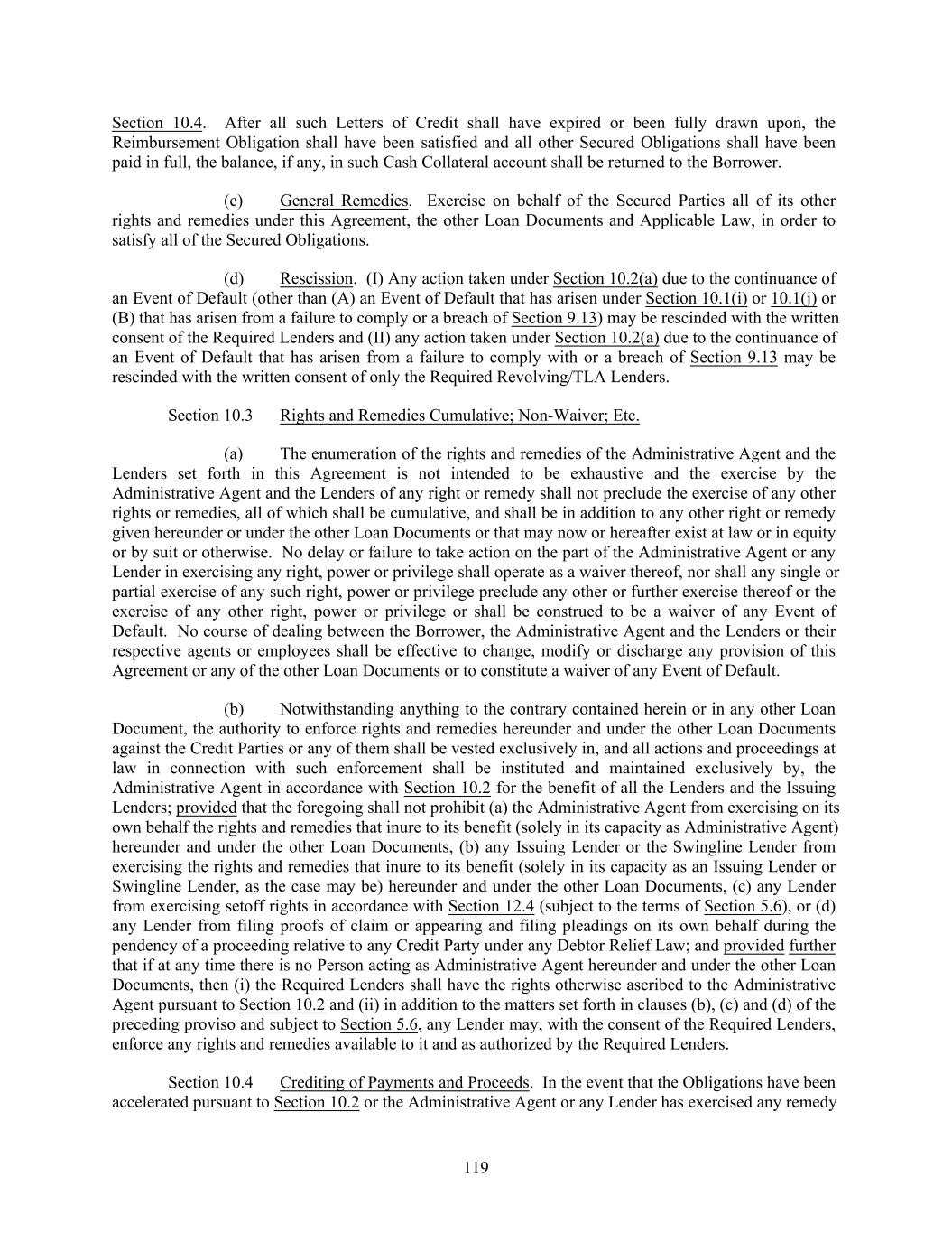 Section 10.4. After all such Letters of Credit shall have expired or been fully drawn upon, theReimbursement Obligation shall have been satisfied and all other Secured Obligations shall have beenpaid in full, the balance, if any, in such Cash Collateral account shall be returned to the Borrower.(c) General Remedies. Exercise on behalf of the Secured Parties all of its otherrights and remedies under this Agreement, the other Loan Documents and Applicable Law, in order tosatisfy all of the Secured Obligations.(d) Rescission. (I) Any action taken under Section 10.2(a) due to the continuance ofan Event of Default (other than (A) an Event of Default that has arisen under Section 10.1(i) or 10.1(j) or(B) that has arisen from a failure to comply or a breach of Section 9.13) may be rescinded with the writtenconsent of the Required Lenders and (II) any action taken under Section 10.2(a) due to the continuance ofan Event of Default that has arisen from a failure to comply with or a breach of Section 9.13 may berescinded with the written consent of only the Required Revolving/TLA Lenders.Section 10.3 Rights and Remedies Cumulative; Non-Waiver; Etc.(a) The enumeration of the rights and remedies of the Administrative Agent and theLenders set forth in this Agreement is not intended to be exhaustive and the exercise by theAdministrative Agent and the Lenders of any right or remedy shall not preclude the exercise of any otherrights or remedies, all of which shall be cumulative, and shall be in addition to any other right or remedygiven hereunder or under the other Loan Documents or that may now or hereafter exist at law or in equityor by suit or otherwise. No delay or failure to take action on the part of the Administrative Agent or anyLender in exercising any right, power or privilege shall operate as a waiver thereof, nor shall any single orpartial exercise of any such right, power or privilege preclude any other or further exercise thereof or theexercise of any other right, power or privilege or shall be construed to be a waiver of any Event ofDefault. No course of dealing between the Borrower, the Administrative Agent and the Lenders or theirrespective agents or employees shall be effective to change, modify or discharge any provision of thisAgreement or any of the other Loan Documents or to constitute a waiver of any Event of Default.(b) Notwithstanding anything to the contrary contained herein or in any other LoanDocument, the authority to enforce rights and remedies hereunder and under the other Loan Documentsagainst the Credit Parties or any of them shall be vested exclusively in, and all actions and proceedings atlaw in connection with such enforcement shall be instituted and maintained exclusively by, theAdministrative Agent in accordance with Section 10.2 for the benefit of all the Lenders and the IssuingLenders; provided that the foregoing shall not prohibit (a) the Administrative Agent from exercising on itsown behalf the rights and remedies that inure to its benefit (solely in its capacity as Administrative Agent)hereunder and under the other Loan Documents, (b) any Issuing Lender or the Swingline Lender fromexercising the rights and remedies that inure to its benefit (solely in its capacity as an Issuing Lender orSwingline Lender, as the case may be) hereunder and under the other Loan Documents, (c) any Lenderfrom exercising setoff rights in accordance with Section 12.4 (subject to the terms of Section 5.6), or (d)any Lender from filing proofs of claim or appearing and filing pleadings on its own behalf during thependency of a proceeding relative to any Credit Party under any Debtor Relief Law; and provided furtherthat if at any time there is no Person acting as Administrative Agent hereunder and under the other LoanDocuments, then (i) the Required Lenders shall have the rights otherwise ascribed to the AdministrativeAgent pursuant to Section 10.2 and (ii) in addition to the matters set forth in clauses (b), (c) and (d) of thepreceding proviso and subject to Section 5.6, any Lender may, with the consent of the Required Lenders,enforce any rights and remedies available to it and as authorized by the Required Lenders.Section 10.4 Crediting of Payments and Proceeds. In the event that the Obligations have beenaccelerated pursuant to Section 10.2 or the Administrative Agent or any Lender has exercised any remedy119