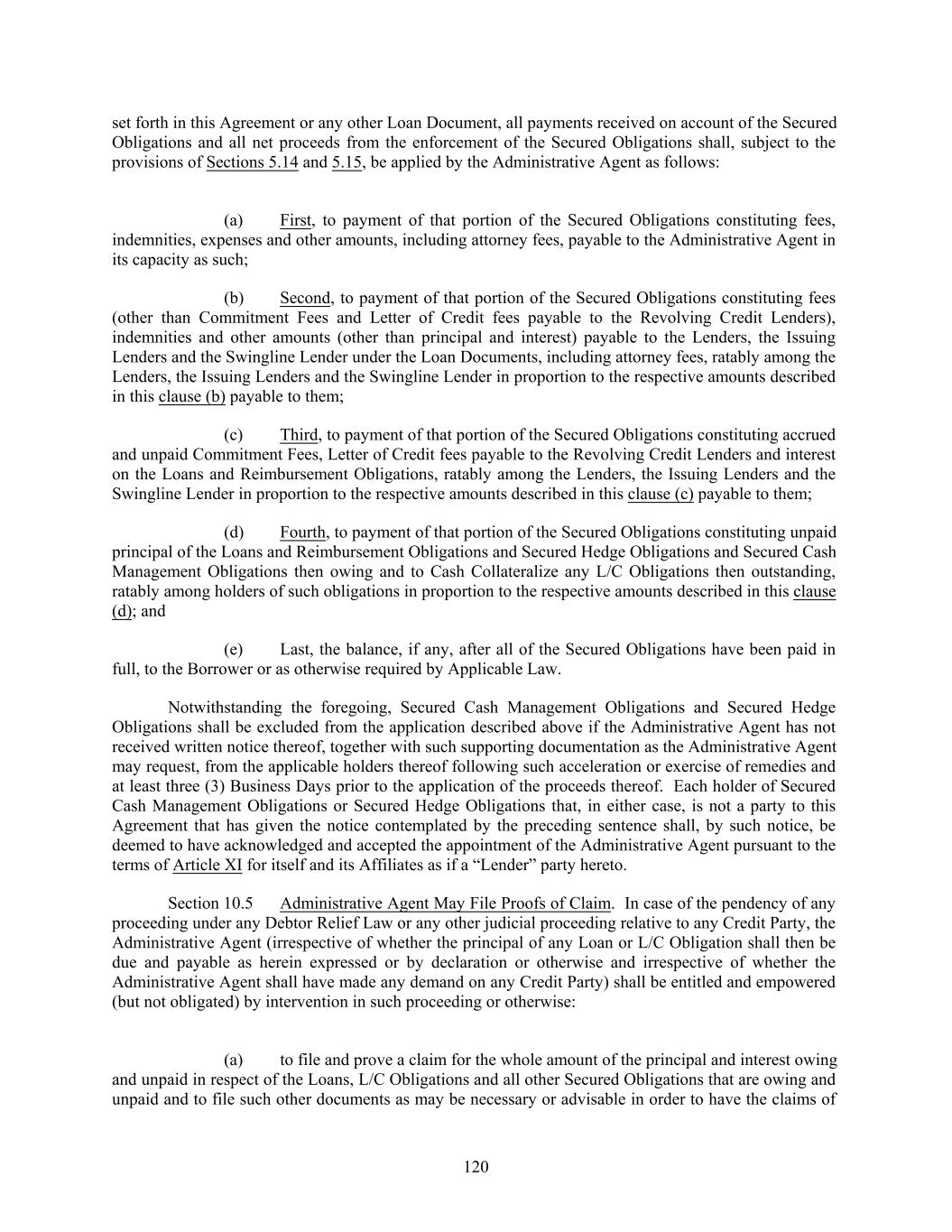set forth in this Agreement or any other Loan Document, all payments received on account of the SecuredObligations and all net proceeds from the enforcement of the Secured Obligations shall, subject to theprovisions of Sections 5.14 and 5.15, be applied by the Administrative Agent as follows:(a) First, to payment of that portion of the Secured Obligations constituting fees,indemnities, expenses and other amounts, including attorney fees, payable to the Administrative Agent inits capacity as such;(b) Second, to payment of that portion of the Secured Obligations constituting fees(other than Commitment Fees and Letter of Credit fees payable to the Revolving Credit Lenders),indemnities and other amounts (other than principal and interest) payable to the Lenders, the IssuingLenders and the Swingline Lender under the Loan Documents, including attorney fees, ratably among theLenders, the Issuing Lenders and the Swingline Lender in proportion to the respective amounts describedin this clause (b) payable to them;(c) Third, to payment of that portion of the Secured Obligations constituting accruedand unpaid Commitment Fees, Letter of Credit fees payable to the Revolving Credit Lenders and intereston the Loans and Reimbursement Obligations, ratably among the Lenders, the Issuing Lenders and theSwingline Lender in proportion to the respective amounts described in this clause (c) payable to them;(d) Fourth, to payment of that portion of the Secured Obligations constituting unpaidprincipal of the Loans and Reimbursement Obligations and Secured Hedge Obligations and Secured CashManagement Obligations then owing and to Cash Collateralize any L/C Obligations then outstanding,ratably among holders of such obligations in proportion to the respective amounts described in this clause(d); and (e) Last, the balance, if any, after all of the Secured Obligations have been paid infull, to the Borrower or as otherwise required by Applicable Law.Notwithstanding the foregoing, Secured Cash Management Obligations and Secured HedgeObligations shall be excluded from the application described above if the Administrative Agent has notreceived written notice thereof, together with such supporting documentation as the Administrative Agentmay request, from the applicable holders thereof following such acceleration or exercise of remedies andat least three (3) Business Days prior to the application of the proceeds thereof. Each holder of SecuredCash Management Obligations or Secured Hedge Obligations that, in either case, is not a party to thisAgreement that has given the notice contemplated by the preceding sentence shall, by such notice, bedeemed to have acknowledged and accepted the appointment of the Administrative Agent pursuant to theterms of Article XI for itself and its Affiliates as if a “Lender” party hereto.Section 10.5 Administrative Agent May File Proofs of Claim. In case of the pendency of anyproceeding under any Debtor Relief Law or any other judicial proceeding relative to any Credit Party, theAdministrative Agent (irrespective of whether the principal of any Loan or L/C Obligation shall then bedue and payable as herein expressed or by declaration or otherwise and irrespective of whether theAdministrative Agent shall have made any demand on any Credit Party) shall be entitled and empowered(but not obligated) by intervention in such proceeding or otherwise:(a) to file and prove a claim for the whole amount of the principal and interest owingand unpaid in respect of the Loans, L/C Obligations and all other Secured Obligations that are owing andunpaid and to file such other documents as may be necessary or advisable in order to have the claims of120