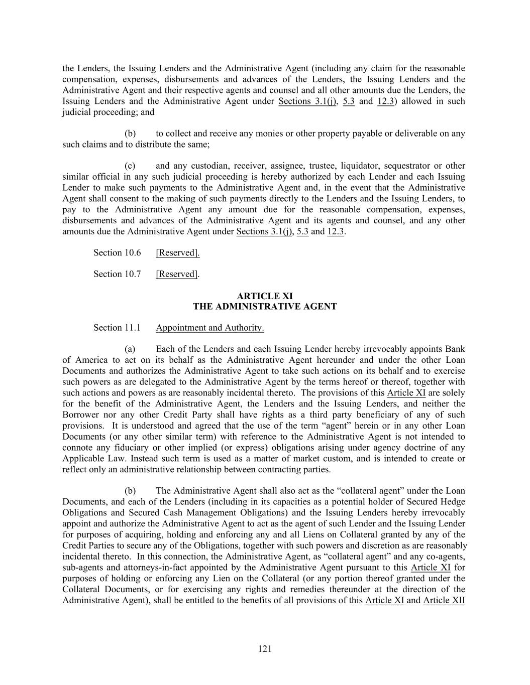 the Lenders, the Issuing Lenders and the Administrative Agent (including any claim for the reasonablecompensation, expenses, disbursements and advances of the Lenders, the Issuing Lenders and theAdministrative Agent and their respective agents and counsel and all other amounts due the Lenders, theIssuing Lenders and the Administrative Agent under Sections 3.1(j), 5.3 and 12.3) allowed in suchjudicial proceeding; and(b) to collect and receive any monies or other property payable or deliverable on anysuch claims and to distribute the same;(c) and any custodian, receiver, assignee, trustee, liquidator, sequestrator or othersimilar official in any such judicial proceeding is hereby authorized by each Lender and each IssuingLender to make such payments to the Administrative Agent and, in the event that the AdministrativeAgent shall consent to the making of such payments directly to the Lenders and the Issuing Lenders, topay to the Administrative Agent any amount due for the reasonable compensation, expenses,disbursements and advances of the Administrative Agent and its agents and counsel, and any otheramounts due the Administrative Agent under Sections 3.1(j), 5.3 and 12.3.Section 10.6 [Reserved].Section 10.7 [Reserved]. ARTICLE XITHE ADMINISTRATIVE AGENTSection 11.1 Appointment and Authority.(a) Each of the Lenders and each Issuing Lender hereby irrevocably appoints Bankof America to act on its behalf as the Administrative Agent hereunder and under the other LoanDocuments and authorizes the Administrative Agent to take such actions on its behalf and to exercisesuch powers as are delegated to the Administrative Agent by the terms hereof or thereof, together withsuch actions and powers as are reasonably incidental thereto. The provisions of this Article XI are solelyfor the benefit of the Administrative Agent, the Lenders and the Issuing Lenders, and neither theBorrower nor any other Credit Party shall have rights as a third party beneficiary of any of suchprovisions. It is understood and agreed that the use of the term “agent” herein or in any other LoanDocuments (or any other similar term) with reference to the Administrative Agent is not intended toconnote any fiduciary or other implied (or express) obligations arising under agency doctrine of anyApplicable Law. Instead such term is used as a matter of market custom, and is intended to create orreflect only an administrative relationship between contracting parties.(b) The Administrative Agent shall also act as the “collateral agent” under the LoanDocuments, and each of the Lenders (including in its capacities as a potential holder of Secured HedgeObligations and Secured Cash Management Obligations) and the Issuing Lenders hereby irrevocablyappoint and authorize the Administrative Agent to act as the agent of such Lender and the Issuing Lenderfor purposes of acquiring, holding and enforcing any and all Liens on Collateral granted by any of theCredit Parties to secure any of the Obligations, together with such powers and discretion as are reasonablyincidental thereto. In this connection, the Administrative Agent, as “collateral agent” and any co-agents,sub-agents and attorneys-in-fact appointed by the Administrative Agent pursuant to this Article XI forpurposes of holding or enforcing any Lien on the Collateral (or any portion thereof granted under theCollateral Documents, or for exercising any rights and remedies thereunder at the direction of theAdministrative Agent), shall be entitled to the benefits of all provisions of this Article XI and Article XII121