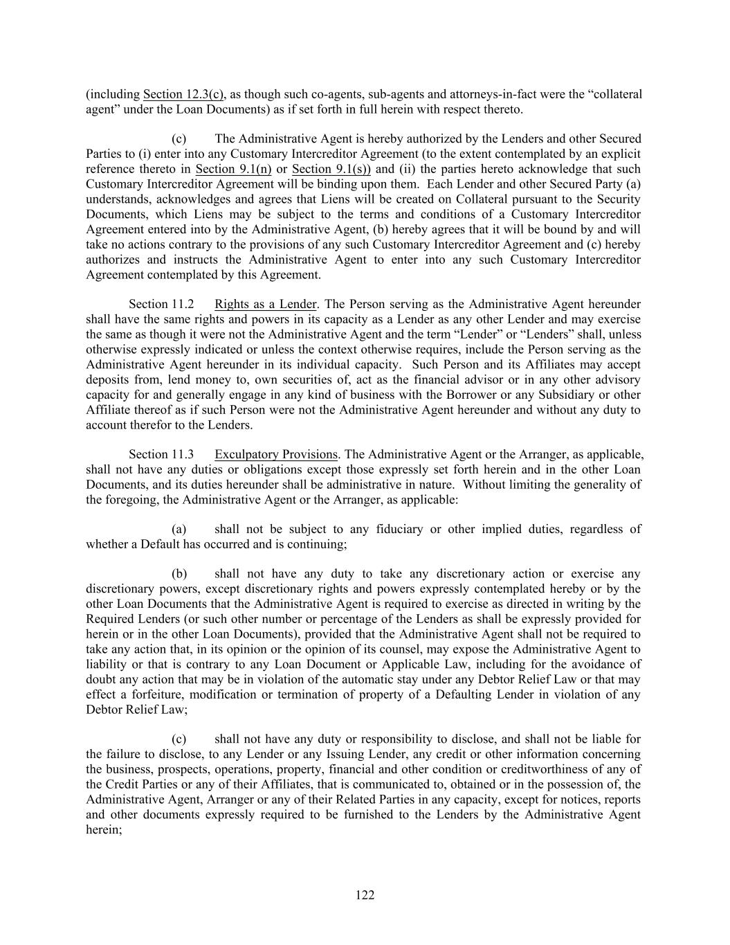 (including Section 12.3(c), as though such co-agents, sub-agents and attorneys-in-fact were the “collateralagent” under the Loan Documents) as if set forth in full herein with respect thereto.(c) The Administrative Agent is hereby authorized by the Lenders and other SecuredParties to (i) enter into any Customary Intercreditor Agreement (to the extent contemplated by an explicitreference thereto in Section 9.1(n) or Section 9.1(s)) and (ii) the parties hereto acknowledge that suchCustomary Intercreditor Agreement will be binding upon them. Each Lender and other Secured Party (a)understands, acknowledges and agrees that Liens will be created on Collateral pursuant to the SecurityDocuments, which Liens may be subject to the terms and conditions of a Customary IntercreditorAgreement entered into by the Administrative Agent, (b) hereby agrees that it will be bound by and willtake no actions contrary to the provisions of any such Customary Intercreditor Agreement and (c) herebyauthorizes and instructs the Administrative Agent to enter into any such Customary IntercreditorAgreement contemplated by this Agreement.Section 11.2 Rights as a Lender. The Person serving as the Administrative Agent hereundershall have the same rights and powers in its capacity as a Lender as any other Lender and may exercisethe same as though it were not the Administrative Agent and the term “Lender” or “Lenders” shall, unlessotherwise expressly indicated or unless the context otherwise requires, include the Person serving as theAdministrative Agent hereunder in its individual capacity. Such Person and its Affiliates may acceptdeposits from, lend money to, own securities of, act as the financial advisor or in any other advisorycapacity for and generally engage in any kind of business with the Borrower or any Subsidiary or otherAffiliate thereof as if such Person were not the Administrative Agent hereunder and without any duty toaccount therefor to the Lenders.Section 11.3 Exculpatory Provisions. The Administrative Agent or the Arranger, as applicable,shall not have any duties or obligations except those expressly set forth herein and in the other LoanDocuments, and its duties hereunder shall be administrative in nature. Without limiting the generality ofthe foregoing, the Administrative Agent or the Arranger, as applicable:(a) shall not be subject to any fiduciary or other implied duties, regardless ofwhether a Default has occurred and is continuing;(b) shall not have any duty to take any discretionary action or exercise anydiscretionary powers, except discretionary rights and powers expressly contemplated hereby or by theother Loan Documents that the Administrative Agent is required to exercise as directed in writing by theRequired Lenders (or such other number or percentage of the Lenders as shall be expressly provided forherein or in the other Loan Documents), provided that the Administrative Agent shall not be required totake any action that, in its opinion or the opinion of its counsel, may expose the Administrative Agent toliability or that is contrary to any Loan Document or Applicable Law, including for the avoidance ofdoubt any action that may be in violation of the automatic stay under any Debtor Relief Law or that mayeffect a forfeiture, modification or termination of property of a Defaulting Lender in violation of anyDebtor Relief Law;(c) shall not have any duty or responsibility to disclose, and shall not be liable forthe failure to disclose, to any Lender or any Issuing Lender, any credit or other information concerningthe business, prospects, operations, property, financial and other condition or creditworthiness of any ofthe Credit Parties or any of their Affiliates, that is communicated to, obtained or in the possession of, theAdministrative Agent, Arranger or any of their Related Parties in any capacity, except for notices, reportsand other documents expressly required to be furnished to the Lenders by the Administrative Agentherein; 122