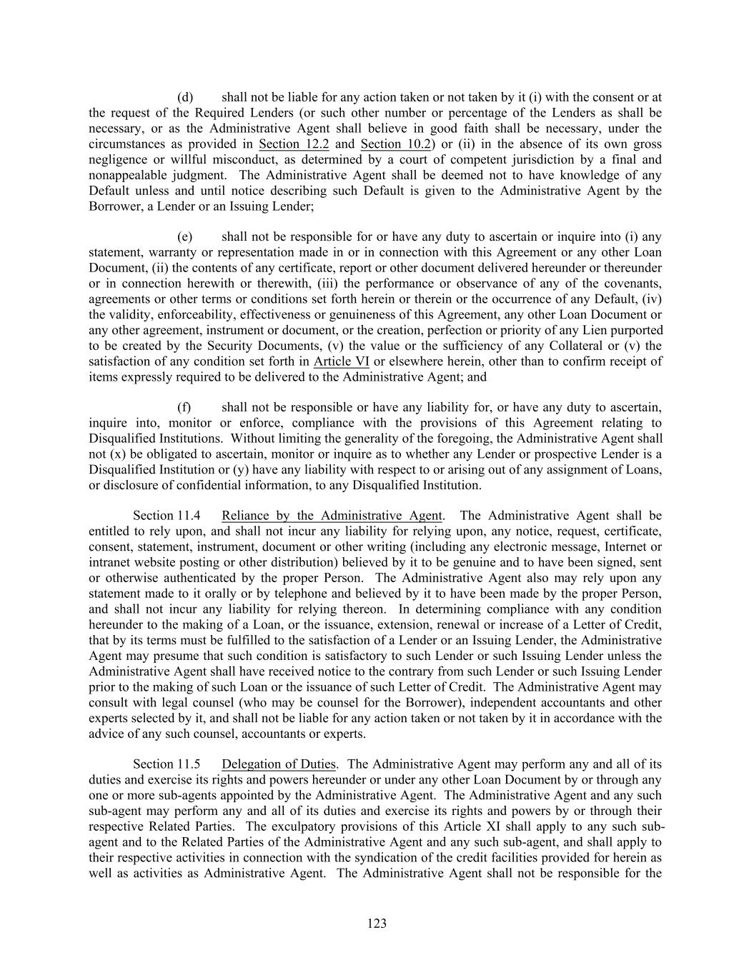 (d) shall not be liable for any action taken or not taken by it (i) with the consent or atthe request of the Required Lenders (or such other number or percentage of the Lenders as shall benecessary, or as the Administrative Agent shall believe in good faith shall be necessary, under thecircumstances as provided in Section 12.2 and Section 10.2) or (ii) in the absence of its own grossnegligence or willful misconduct, as determined by a court of competent jurisdiction by a final andnonappealable judgment. The Administrative Agent shall be deemed not to have knowledge of anyDefault unless and until notice describing such Default is given to the Administrative Agent by theBorrower, a Lender or an Issuing Lender;(e) shall not be responsible for or have any duty to ascertain or inquire into (i) anystatement, warranty or representation made in or in connection with this Agreement or any other LoanDocument, (ii) the contents of any certificate, report or other document delivered hereunder or thereunderor in connection herewith or therewith, (iii) the performance or observance of any of the covenants,agreements or other terms or conditions set forth herein or therein or the occurrence of any Default, (iv)the validity, enforceability, effectiveness or genuineness of this Agreement, any other Loan Document orany other agreement, instrument or document, or the creation, perfection or priority of any Lien purportedto be created by the Security Documents, (v) the value or the sufficiency of any Collateral or (v) thesatisfaction of any condition set forth in Article VI or elsewhere herein, other than to confirm receipt ofitems expressly required to be delivered to the Administrative Agent; and(f) shall not be responsible or have any liability for, or have any duty to ascertain,inquire into, monitor or enforce, compliance with the provisions of this Agreement relating toDisqualified Institutions. Without limiting the generality of the foregoing, the Administrative Agent shallnot (x) be obligated to ascertain, monitor or inquire as to whether any Lender or prospective Lender is aDisqualified Institution or (y) have any liability with respect to or arising out of any assignment of Loans,or disclosure of confidential information, to any Disqualified Institution.Section 11.4 Reliance by the Administrative Agent. The Administrative Agent shall beentitled to rely upon, and shall not incur any liability for relying upon, any notice, request, certificate,consent, statement, instrument, document or other writing (including any electronic message, Internet orintranet website posting or other distribution) believed by it to be genuine and to have been signed, sentor otherwise authenticated by the proper Person. The Administrative Agent also may rely upon anystatement made to it orally or by telephone and believed by it to have been made by the proper Person,and shall not incur any liability for relying thereon. In determining compliance with any conditionhereunder to the making of a Loan, or the issuance, extension, renewal or increase of a Letter of Credit,that by its terms must be fulfilled to the satisfaction of a Lender or an Issuing Lender, the AdministrativeAgent may presume that such condition is satisfactory to such Lender or such Issuing Lender unless theAdministrative Agent shall have received notice to the contrary from such Lender or such Issuing Lenderprior to the making of such Loan or the issuance of such Letter of Credit. The Administrative Agent mayconsult with legal counsel (who may be counsel for the Borrower), independent accountants and otherexperts selected by it, and shall not be liable for any action taken or not taken by it in accordance with theadvice of any such counsel, accountants or experts.Section 11.5 Delegation of Duties. The Administrative Agent may perform any and all of itsduties and exercise its rights and powers hereunder or under any other Loan Document by or through anyone or more sub-agents appointed by the Administrative Agent. The Administrative Agent and any suchsub-agent may perform any and all of its duties and exercise its rights and powers by or through theirrespective Related Parties. The exculpatory provisions of this Article XI shall apply to any such sub-agent and to the Related Parties of the Administrative Agent and any such sub-agent, and shall apply totheir respective activities in connection with the syndication of the credit facilities provided for herein aswell as activities as Administrative Agent. The Administrative Agent shall not be responsible for the123