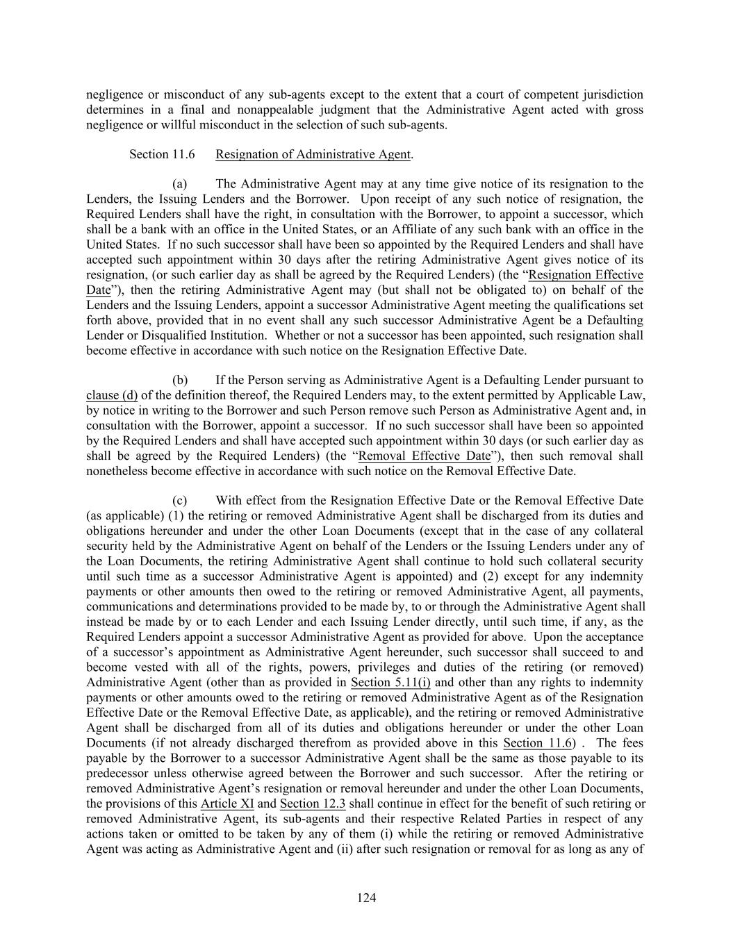negligence or misconduct of any sub-agents except to the extent that a court of competent jurisdictiondetermines in a final and nonappealable judgment that the Administrative Agent acted with grossnegligence or willful misconduct in the selection of such sub-agents.Section 11.6 Resignation of Administrative Agent.(a) The Administrative Agent may at any time give notice of its resignation to theLenders, the Issuing Lenders and the Borrower. Upon receipt of any such notice of resignation, theRequired Lenders shall have the right, in consultation with the Borrower, to appoint a successor, whichshall be a bank with an office in the United States, or an Affiliate of any such bank with an office in theUnited States. If no such successor shall have been so appointed by the Required Lenders and shall haveaccepted such appointment within 30 days after the retiring Administrative Agent gives notice of itsresignation, (or such earlier day as shall be agreed by the Required Lenders) (the “Resignation EffectiveDate”), then the retiring Administrative Agent may (but shall not be obligated to) on behalf of theLenders and the Issuing Lenders, appoint a successor Administrative Agent meeting the qualifications setforth above, provided that in no event shall any such successor Administrative Agent be a DefaultingLender or Disqualified Institution. Whether or not a successor has been appointed, such resignation shallbecome effective in accordance with such notice on the Resignation Effective Date.(b) If the Person serving as Administrative Agent is a Defaulting Lender pursuant toclause (d) of the definition thereof, the Required Lenders may, to the extent permitted by Applicable Law,by notice in writing to the Borrower and such Person remove such Person as Administrative Agent and, inconsultation with the Borrower, appoint a successor. If no such successor shall have been so appointedby the Required Lenders and shall have accepted such appointment within 30 days (or such earlier day asshall be agreed by the Required Lenders) (the “Removal Effective Date”), then such removal shallnonetheless become effective in accordance with such notice on the Removal Effective Date.(c) With effect from the Resignation Effective Date or the Removal Effective Date(as applicable) (1) the retiring or removed Administrative Agent shall be discharged from its duties andobligations hereunder and under the other Loan Documents (except that in the case of any collateralsecurity held by the Administrative Agent on behalf of the Lenders or the Issuing Lenders under any ofthe Loan Documents, the retiring Administrative Agent shall continue to hold such collateral securityuntil such time as a successor Administrative Agent is appointed) and (2) except for any indemnitypayments or other amounts then owed to the retiring or removed Administrative Agent, all payments,communications and determinations provided to be made by, to or through the Administrative Agent shallinstead be made by or to each Lender and each Issuing Lender directly, until such time, if any, as theRequired Lenders appoint a successor Administrative Agent as provided for above. Upon the acceptanceof a successor’s appointment as Administrative Agent hereunder, such successor shall succeed to andbecome vested with all of the rights, powers, privileges and duties of the retiring (or removed)Administrative Agent (other than as provided in Section 5.11(i) and other than any rights to indemnitypayments or other amounts owed to the retiring or removed Administrative Agent as of the ResignationEffective Date or the Removal Effective Date, as applicable), and the retiring or removed AdministrativeAgent shall be discharged from all of its duties and obligations hereunder or under the other LoanDocuments (if not already discharged therefrom as provided above in this Section 11.6) . The feespayable by the Borrower to a successor Administrative Agent shall be the same as those payable to itspredecessor unless otherwise agreed between the Borrower and such successor. After the retiring orremoved Administrative Agent’s resignation or removal hereunder and under the other Loan Documents,the provisions of this Article XI and Section 12.3 shall continue in effect for the benefit of such retiring orremoved Administrative Agent, its sub-agents and their respective Related Parties in respect of anyactions taken or omitted to be taken by any of them (i) while the retiring or removed AdministrativeAgent was acting as Administrative Agent and (ii) after such resignation or removal for as long as any of124
