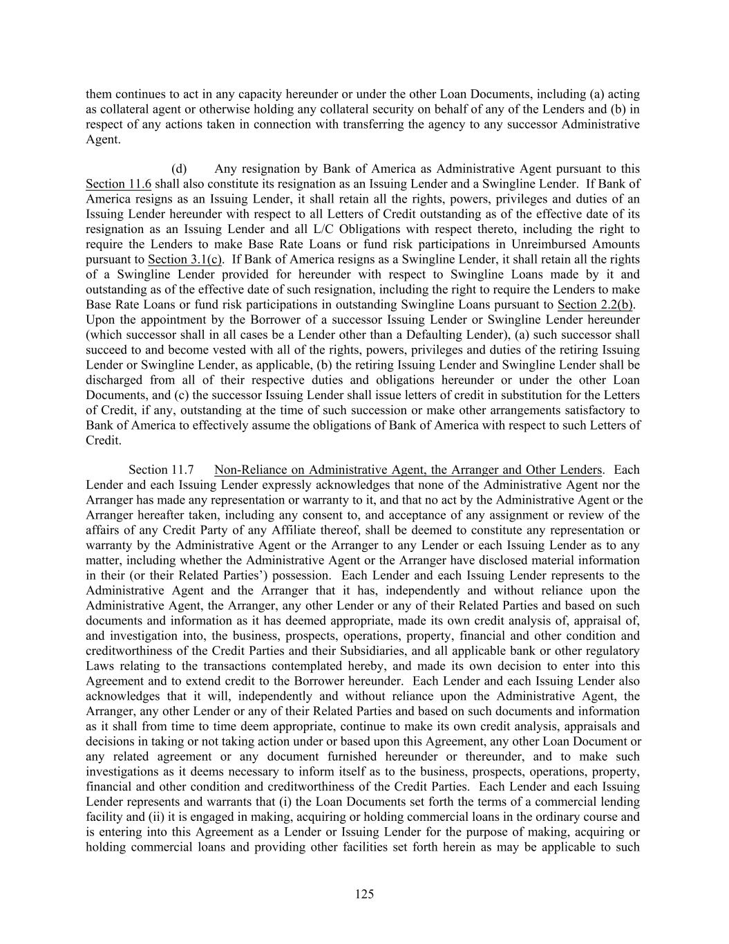 them continues to act in any capacity hereunder or under the other Loan Documents, including (a) actingas collateral agent or otherwise holding any collateral security on behalf of any of the Lenders and (b) inrespect of any actions taken in connection with transferring the agency to any successor AdministrativeAgent. (d) Any resignation by Bank of America as Administrative Agent pursuant to thisSection 11.6 shall also constitute its resignation as an Issuing Lender and a Swingline Lender. If Bank ofAmerica resigns as an Issuing Lender, it shall retain all the rights, powers, privileges and duties of anIssuing Lender hereunder with respect to all Letters of Credit outstanding as of the effective date of itsresignation as an Issuing Lender and all L/C Obligations with respect thereto, including the right torequire the Lenders to make Base Rate Loans or fund risk participations in Unreimbursed Amountspursuant to Section 3.1(c). If Bank of America resigns as a Swingline Lender, it shall retain all the rightsof a Swingline Lender provided for hereunder with respect to Swingline Loans made by it andoutstanding as of the effective date of such resignation, including the right to require the Lenders to makeBase Rate Loans or fund risk participations in outstanding Swingline Loans pursuant to Section 2.2(b).Upon the appointment by the Borrower of a successor Issuing Lender or Swingline Lender hereunder(which successor shall in all cases be a Lender other than a Defaulting Lender), (a) such successor shallsucceed to and become vested with all of the rights, powers, privileges and duties of the retiring IssuingLender or Swingline Lender, as applicable, (b) the retiring Issuing Lender and Swingline Lender shall bedischarged from all of their respective duties and obligations hereunder or under the other LoanDocuments, and (c) the successor Issuing Lender shall issue letters of credit in substitution for the Lettersof Credit, if any, outstanding at the time of such succession or make other arrangements satisfactory toBank of America to effectively assume the obligations of Bank of America with respect to such Letters ofCredit. Section 11.7 Non-Reliance on Administrative Agent, the Arranger and Other Lenders. EachLender and each Issuing Lender expressly acknowledges that none of the Administrative Agent nor theArranger has made any representation or warranty to it, and that no act by the Administrative Agent or theArranger hereafter taken, including any consent to, and acceptance of any assignment or review of theaffairs of any Credit Party of any Affiliate thereof, shall be deemed to constitute any representation orwarranty by the Administrative Agent or the Arranger to any Lender or each Issuing Lender as to anymatter, including whether the Administrative Agent or the Arranger have disclosed material informationin their (or their Related Parties’) possession. Each Lender and each Issuing Lender represents to theAdministrative Agent and the Arranger that it has, independently and without reliance upon theAdministrative Agent, the Arranger, any other Lender or any of their Related Parties and based on suchdocuments and information as it has deemed appropriate, made its own credit analysis of, appraisal of,and investigation into, the business, prospects, operations, property, financial and other condition andcreditworthiness of the Credit Parties and their Subsidiaries, and all applicable bank or other regulatoryLaws relating to the transactions contemplated hereby, and made its own decision to enter into thisAgreement and to extend credit to the Borrower hereunder. Each Lender and each Issuing Lender alsoacknowledges that it will, independently and without reliance upon the Administrative Agent, theArranger, any other Lender or any of their Related Parties and based on such documents and informationas it shall from time to time deem appropriate, continue to make its own credit analysis, appraisals anddecisions in taking or not taking action under or based upon this Agreement, any other Loan Document orany related agreement or any document furnished hereunder or thereunder, and to make suchinvestigations as it deems necessary to inform itself as to the business, prospects, operations, property,financial and other condition and creditworthiness of the Credit Parties. Each Lender and each IssuingLender represents and warrants that (i) the Loan Documents set forth the terms of a commercial lendingfacility and (ii) it is engaged in making, acquiring or holding commercial loans in the ordinary course andis entering into this Agreement as a Lender or Issuing Lender for the purpose of making, acquiring orholding commercial loans and providing other facilities set forth herein as may be applicable to such125