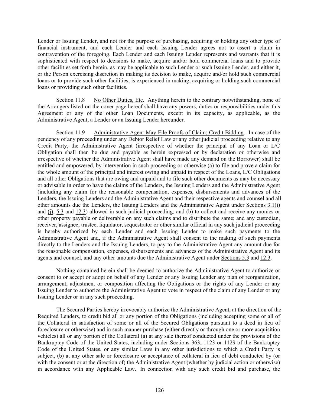 Lender or Issuing Lender, and not for the purpose of purchasing, acquiring or holding any other type offinancial instrument, and each Lender and each Issuing Lender agrees not to assert a claim incontravention of the foregoing. Each Lender and each Issuing Lender represents and warrants that it issophisticated with respect to decisions to make, acquire and/or hold commercial loans and to provideother facilities set forth herein, as may be applicable to such Lender or such Issuing Lender, and either it,or the Person exercising discretion in making its decision to make, acquire and/or hold such commercialloans or to provide such other facilities, is experienced in making, acquiring or holding such commercialloans or providing such other facilities.Section 11.8 No Other Duties, Etc. Anything herein to the contrary notwithstanding, none ofthe Arrangers listed on the cover page hereof shall have any powers, duties or responsibilities under thisAgreement or any of the other Loan Documents, except in its capacity, as applicable, as theAdministrative Agent, a Lender or an Issuing Lender hereunder.Section 11.9 Administrative Agent May File Proofs of Claim; Credit Bidding. In case of thependency of any proceeding under any Debtor Relief Law or any other judicial proceeding relative to anyCredit Party, the Administrative Agent (irrespective of whether the principal of any Loan or L/CObligation shall then be due and payable as herein expressed or by declaration or otherwise andirrespective of whether the Administrative Agent shall have made any demand on the Borrower) shall beentitled and empowered, by intervention in such proceeding or otherwise (a) to file and prove a claim forthe whole amount of the principal and interest owing and unpaid in respect of the Loans, L/C Obligationsand all other Obligations that are owing and unpaid and to file such other documents as may be necessaryor advisable in order to have the claims of the Lenders, the Issuing Lenders and the Administrative Agent(including any claim for the reasonable compensation, expenses, disbursements and advances of theLenders, the Issuing Lenders and the Administrative Agent and their respective agents and counsel and allother amounts due the Lenders, the Issuing Lenders and the Administrative Agent under Sections 3.1(i)and (j), 5.3 and 12.3) allowed in such judicial proceeding; and (b) to collect and receive any monies orother property payable or deliverable on any such claims and to distribute the same; and any custodian,receiver, assignee, trustee, liquidator, sequestrator or other similar official in any such judicial proceedingis hereby authorized by each Lender and each Issuing Lender to make such payments to theAdministrative Agent and, if the Administrative Agent shall consent to the making of such paymentsdirectly to the Lenders and the Issuing Lenders, to pay to the Administrative Agent any amount due forthe reasonable compensation, expenses, disbursements and advances of the Administrative Agent and itsagents and counsel, and any other amounts due the Administrative Agent under Sections 5.3 and 12.3.Nothing contained herein shall be deemed to authorize the Administrative Agent to authorize orconsent to or accept or adopt on behalf of any Lender or any Issuing Lender any plan of reorganization,arrangement, adjustment or composition affecting the Obligations or the rights of any Lender or anyIssuing Lender to authorize the Administrative Agent to vote in respect of the claim of any Lender or anyIssuing Lender or in any such proceeding.The Secured Parties hereby irrevocably authorize the Administrative Agent, at the direction of theRequired Lenders, to credit bid all or any portion of the Obligations (including accepting some or all ofthe Collateral in satisfaction of some or all of the Secured Obligations pursuant to a deed in lieu offoreclosure or otherwise) and in such manner purchase (either directly or through one or more acquisitionvehicles) all or any portion of the Collateral (a) at any sale thereof conducted under the provisions of theBankruptcy Code of the United States, including under Sections 363, 1123 or 1129 of the BankruptcyCode of the United States, or any similar Laws in any other jurisdictions to which a Credit Party issubject, (b) at any other sale or foreclosure or acceptance of collateral in lieu of debt conducted by (orwith the consent or at the direction of) the Administrative Agent (whether by judicial action or otherwise)in accordance with any Applicable Law. In connection with any such credit bid and purchase, the126