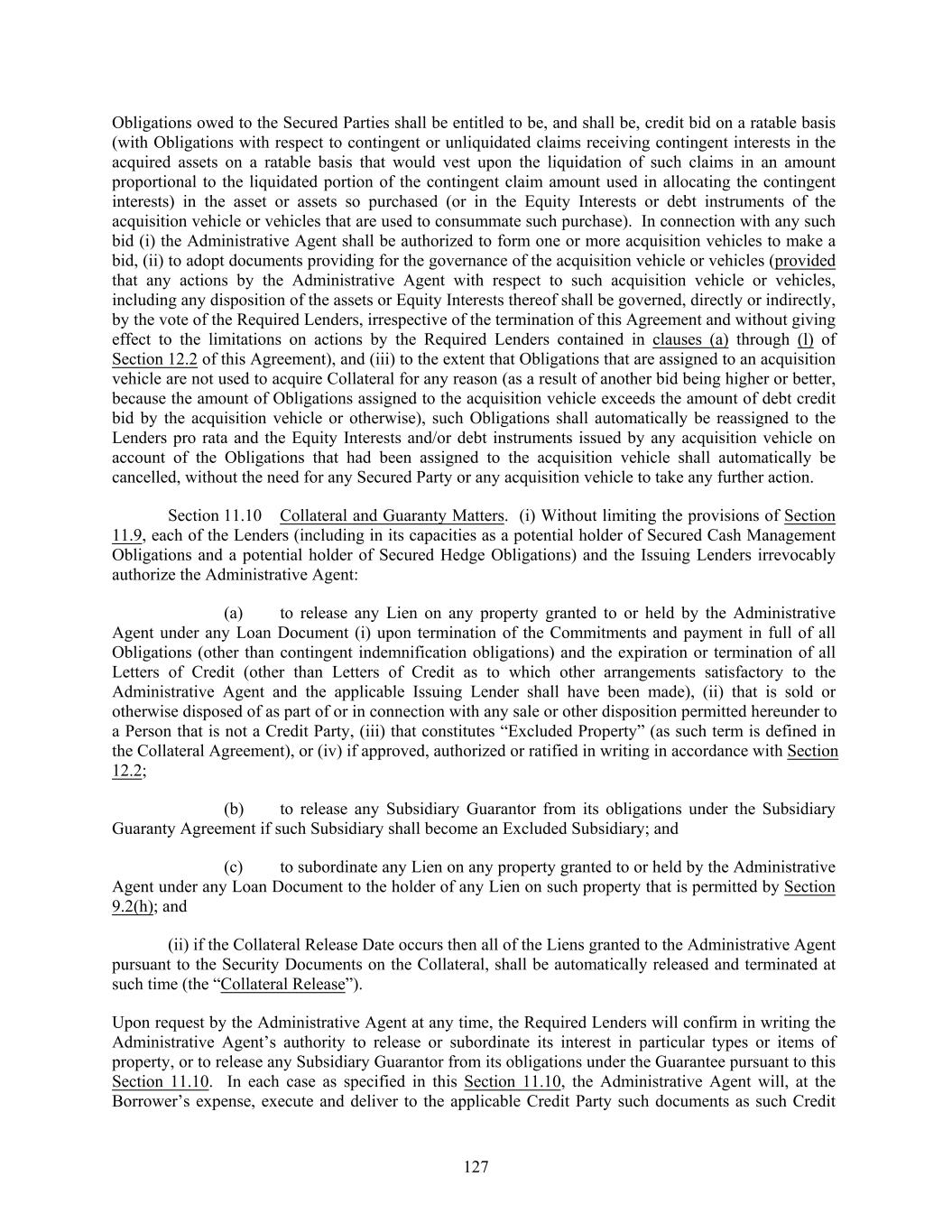 Obligations owed to the Secured Parties shall be entitled to be, and shall be, credit bid on a ratable basis(with Obligations with respect to contingent or unliquidated claims receiving contingent interests in theacquired assets on a ratable basis that would vest upon the liquidation of such claims in an amountproportional to the liquidated portion of the contingent claim amount used in allocating the contingentinterests) in the asset or assets so purchased (or in the Equity Interests or debt instruments of theacquisition vehicle or vehicles that are used to consummate such purchase). In connection with any suchbid (i) the Administrative Agent shall be authorized to form one or more acquisition vehicles to make abid, (ii) to adopt documents providing for the governance of the acquisition vehicle or vehicles (providedthat any actions by the Administrative Agent with respect to such acquisition vehicle or vehicles,including any disposition of the assets or Equity Interests thereof shall be governed, directly or indirectly,by the vote of the Required Lenders, irrespective of the termination of this Agreement and without givingeffect to the limitations on actions by the Required Lenders contained in clauses (a) through (l) ofSection 12.2 of this Agreement), and (iii) to the extent that Obligations that are assigned to an acquisitionvehicle are not used to acquire Collateral for any reason (as a result of another bid being higher or better,because the amount of Obligations assigned to the acquisition vehicle exceeds the amount of debt creditbid by the acquisition vehicle or otherwise), such Obligations shall automatically be reassigned to theLenders pro rata and the Equity Interests and/or debt instruments issued by any acquisition vehicle onaccount of the Obligations that had been assigned to the acquisition vehicle shall automatically becancelled, without the need for any Secured Party or any acquisition vehicle to take any further action.Section 11.10 Collateral and Guaranty Matters. (i) Without limiting the provisions of Section11.9, each of the Lenders (including in its capacities as a potential holder of Secured Cash ManagementObligations and a potential holder of Secured Hedge Obligations) and the Issuing Lenders irrevocablyauthorize the Administrative Agent:(a) to release any Lien on any property granted to or held by the AdministrativeAgent under any Loan Document (i) upon termination of the Commitments and payment in full of allObligations (other than contingent indemnification obligations) and the expiration or termination of allLetters of Credit (other than Letters of Credit as to which other arrangements satisfactory to theAdministrative Agent and the applicable Issuing Lender shall have been made), (ii) that is sold orotherwise disposed of as part of or in connection with any sale or other disposition permitted hereunder toa Person that is not a Credit Party, (iii) that constitutes “Excluded Property” (as such term is defined inthe Collateral Agreement), or (iv) if approved, authorized or ratified in writing in accordance with Section12.2; (b) to release any Subsidiary Guarantor from its obligations under the SubsidiaryGuaranty Agreement if such Subsidiary shall become an Excluded Subsidiary; and(c) to subordinate any Lien on any property granted to or held by the AdministrativeAgent under any Loan Document to the holder of any Lien on such property that is permitted by Section9.2(h); and(ii) if the Collateral Release Date occurs then all of the Liens granted to the Administrative Agentpursuant to the Security Documents on the Collateral, shall be automatically released and terminated atsuch time (the “Collateral Release”).Upon request by the Administrative Agent at any time, the Required Lenders will confirm in writing theAdministrative Agent’s authority to release or subordinate its interest in particular types or items ofproperty, or to release any Subsidiary Guarantor from its obligations under the Guarantee pursuant to thisSection 11.10. In each case as specified in this Section 11.10, the Administrative Agent will, at theBorrower’s expense, execute and deliver to the applicable Credit Party such documents as such Credit127