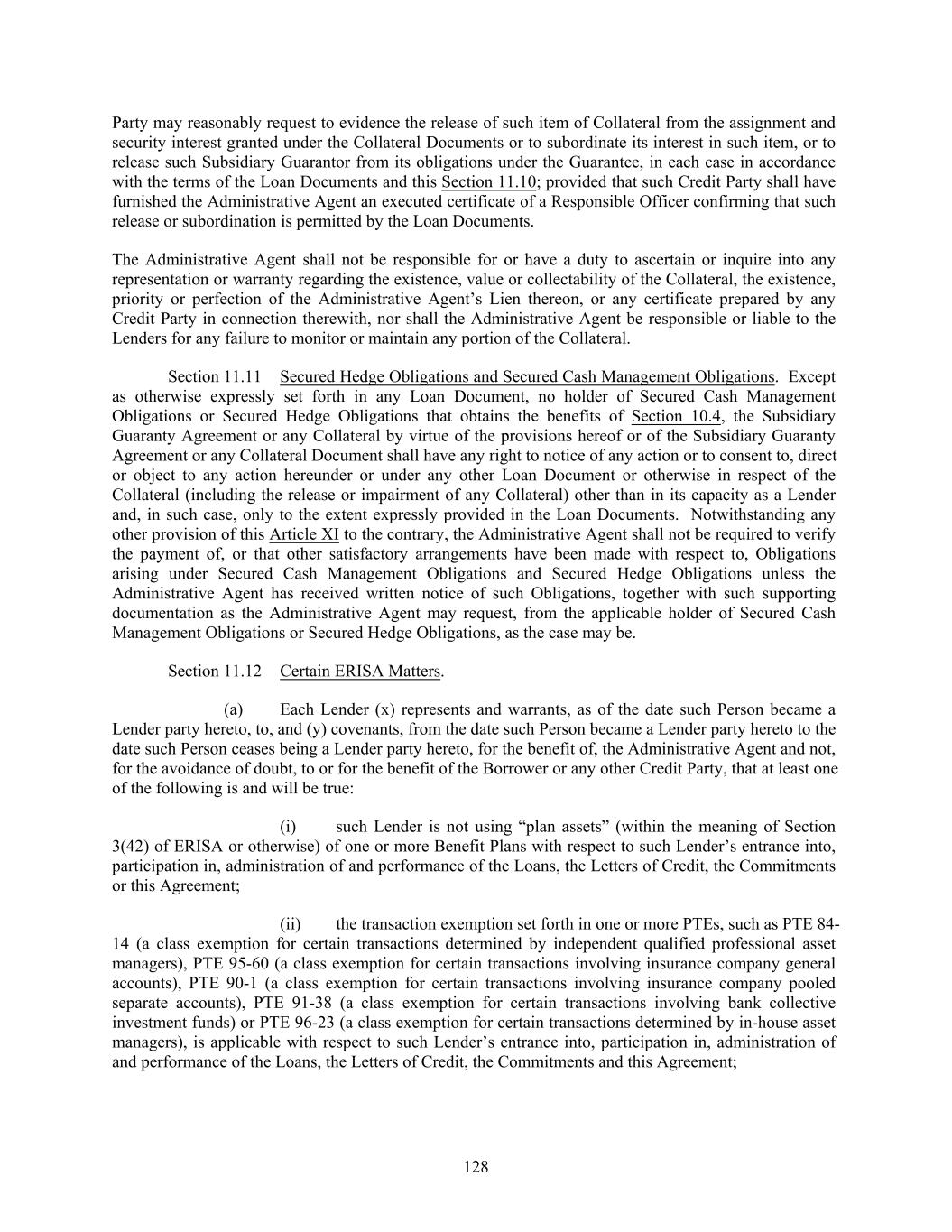 Party may reasonably request to evidence the release of such item of Collateral from the assignment andsecurity interest granted under the Collateral Documents or to subordinate its interest in such item, or torelease such Subsidiary Guarantor from its obligations under the Guarantee, in each case in accordancewith the terms of the Loan Documents and this Section 11.10; provided that such Credit Party shall havefurnished the Administrative Agent an executed certificate of a Responsible Officer confirming that suchrelease or subordination is permitted by the Loan Documents.The Administrative Agent shall not be responsible for or have a duty to ascertain or inquire into anyrepresentation or warranty regarding the existence, value or collectability of the Collateral, the existence,priority or perfection of the Administrative Agent’s Lien thereon, or any certificate prepared by anyCredit Party in connection therewith, nor shall the Administrative Agent be responsible or liable to theLenders for any failure to monitor or maintain any portion of the Collateral.Section 11.11 Secured Hedge Obligations and Secured Cash Management Obligations. Exceptas otherwise expressly set forth in any Loan Document, no holder of Secured Cash ManagementObligations or Secured Hedge Obligations that obtains the benefits of Section 10.4, the SubsidiaryGuaranty Agreement or any Collateral by virtue of the provisions hereof or of the Subsidiary GuarantyAgreement or any Collateral Document shall have any right to notice of any action or to consent to, director object to any action hereunder or under any other Loan Document or otherwise in respect of theCollateral (including the release or impairment of any Collateral) other than in its capacity as a Lenderand, in such case, only to the extent expressly provided in the Loan Documents. Notwithstanding anyother provision of this Article XI to the contrary, the Administrative Agent shall not be required to verifythe payment of, or that other satisfactory arrangements have been made with respect to, Obligationsarising under Secured Cash Management Obligations and Secured Hedge Obligations unless theAdministrative Agent has received written notice of such Obligations, together with such supportingdocumentation as the Administrative Agent may request, from the applicable holder of Secured CashManagement Obligations or Secured Hedge Obligations, as the case may be.Section 11.12 Certain ERISA Matters.(a) Each Lender (x) represents and warrants, as of the date such Person became aLender party hereto, to, and (y) covenants, from the date such Person became a Lender party hereto to thedate such Person ceases being a Lender party hereto, for the benefit of, the Administrative Agent and not,for the avoidance of doubt, to or for the benefit of the Borrower or any other Credit Party, that at least oneof the following is and will be true:(i) such Lender is not using “plan assets” (within the meaning of Section3(42) of ERISA or otherwise) of one or more Benefit Plans with respect to such Lender’s entrance into,participation in, administration of and performance of the Loans, the Letters of Credit, the Commitmentsor this Agreement; (ii) the transaction exemption set forth in one or more PTEs, such as PTE 84-14 (a class exemption for certain transactions determined by independent qualified professional assetmanagers), PTE 95-60 (a class exemption for certain transactions involving insurance company generalaccounts), PTE 90-1 (a class exemption for certain transactions involving insurance company pooledseparate accounts), PTE 91-38 (a class exemption for certain transactions involving bank collectiveinvestment funds) or PTE 96-23 (a class exemption for certain transactions determined by in-house assetmanagers), is applicable with respect to such Lender’s entrance into, participation in, administration ofand performance of the Loans, the Letters of Credit, the Commitments and this Agreement;128