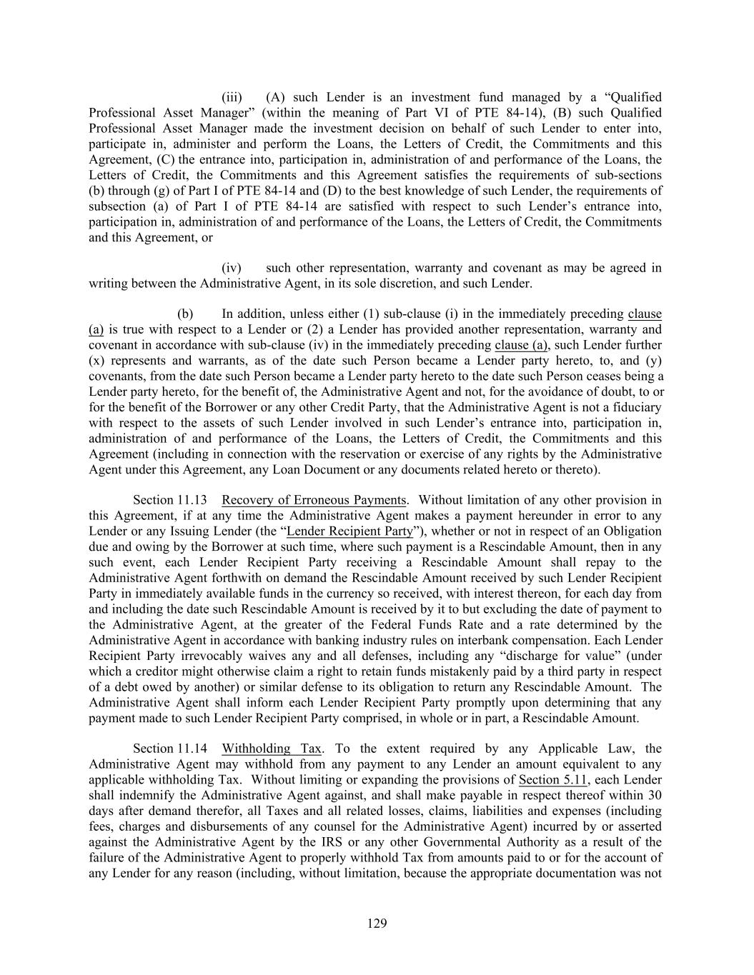 (iii) (A) such Lender is an investment fund managed by a “QualifiedProfessional Asset Manager” (within the meaning of Part VI of PTE 84-14), (B) such QualifiedProfessional Asset Manager made the investment decision on behalf of such Lender to enter into,participate in, administer and perform the Loans, the Letters of Credit, the Commitments and thisAgreement, (C) the entrance into, participation in, administration of and performance of the Loans, theLetters of Credit, the Commitments and this Agreement satisfies the requirements of sub-sections(b) through (g) of Part I of PTE 84-14 and (D) to the best knowledge of such Lender, the requirements ofsubsection (a) of Part I of PTE 84-14 are satisfied with respect to such Lender’s entrance into,participation in, administration of and performance of the Loans, the Letters of Credit, the Commitmentsand this Agreement, or (iv) such other representation, warranty and covenant as may be agreed inwriting between the Administrative Agent, in its sole discretion, and such Lender.(b) In addition, unless either (1) sub-clause (i) in the immediately preceding clause(a) is true with respect to a Lender or (2) a Lender has provided another representation, warranty andcovenant in accordance with sub-clause (iv) in the immediately preceding clause (a), such Lender further(x) represents and warrants, as of the date such Person became a Lender party hereto, to, and (y)covenants, from the date such Person became a Lender party hereto to the date such Person ceases being aLender party hereto, for the benefit of, the Administrative Agent and not, for the avoidance of doubt, to orfor the benefit of the Borrower or any other Credit Party, that the Administrative Agent is not a fiduciarywith respect to the assets of such Lender involved in such Lender’s entrance into, participation in,administration of and performance of the Loans, the Letters of Credit, the Commitments and thisAgreement (including in connection with the reservation or exercise of any rights by the AdministrativeAgent under this Agreement, any Loan Document or any documents related hereto or thereto).Section 11.13 Recovery of Erroneous Payments. Without limitation of any other provision inthis Agreement, if at any time the Administrative Agent makes a payment hereunder in error to anyLender or any Issuing Lender (the “Lender Recipient Party”), whether or not in respect of an Obligationdue and owing by the Borrower at such time, where such payment is a Rescindable Amount, then in anysuch event, each Lender Recipient Party receiving a Rescindable Amount shall repay to theAdministrative Agent forthwith on demand the Rescindable Amount received by such Lender RecipientParty in immediately available funds in the currency so received, with interest thereon, for each day fromand including the date such Rescindable Amount is received by it to but excluding the date of payment tothe Administrative Agent, at the greater of the Federal Funds Rate and a rate determined by theAdministrative Agent in accordance with banking industry rules on interbank compensation. Each LenderRecipient Party irrevocably waives any and all defenses, including any “discharge for value” (underwhich a creditor might otherwise claim a right to retain funds mistakenly paid by a third party in respectof a debt owed by another) or similar defense to its obligation to return any Rescindable Amount. TheAdministrative Agent shall inform each Lender Recipient Party promptly upon determining that anypayment made to such Lender Recipient Party comprised, in whole or in part, a Rescindable Amount.Section 11.14 Withholding Tax. To the extent required by any Applicable Law, theAdministrative Agent may withhold from any payment to any Lender an amount equivalent to anyapplicable withholding Tax. Without limiting or expanding the provisions of Section 5.11, each Lendershall indemnify the Administrative Agent against, and shall make payable in respect thereof within 30days after demand therefor, all Taxes and all related losses, claims, liabilities and expenses (includingfees, charges and disbursements of any counsel for the Administrative Agent) incurred by or assertedagainst the Administrative Agent by the IRS or any other Governmental Authority as a result of thefailure of the Administrative Agent to properly withhold Tax from amounts paid to or for the account ofany Lender for any reason (including, without limitation, because the appropriate documentation was not129