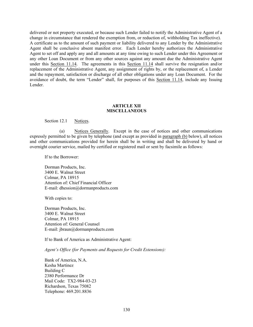 delivered or not property executed, or because such Lender failed to notify the Administrative Agent of achange in circumstance that rendered the exemption from, or reduction of, withholding Tax ineffective).A certificate as to the amount of such payment or liability delivered to any Lender by the AdministrativeAgent shall be conclusive absent manifest error. Each Lender hereby authorizes the AdministrativeAgent to set off and apply any and all amounts at any time owing to such Lender under this Agreement orany other Loan Document or from any other sources against any amount due the Administrative Agentunder this Section 11.14. The agreements in this Section 11.14 shall survive the resignation and/orreplacement of the Administrative Agent, any assignment of rights by, or the replacement of, a Lenderand the repayment, satisfaction or discharge of all other obligations under any Loan Document. For theavoidance of doubt, the term “Lender” shall, for purposes of this Section 11.14, include any IssuingLender. ARTICLE XIIMISCELLANEOUSSection 12.1 Notices.(a) Notices Generally. Except in the case of notices and other communicationsexpressly permitted to be given by telephone (and except as provided in paragraph (b) below), all noticesand other communications provided for herein shall be in writing and shall be delivered by hand orovernight courier service, mailed by certified or registered mail or sent by facsimile as follows:If to the Borrower:Dorman Products, Inc.3400 E. Walnut StreetColmar, PA 18915Attention of: Chief Financial OfficerE-mail: dhession@dormanproducts.comWith copies to:Dorman Products, Inc.3400 E. Walnut StreetColmar, PA 18915Attention of: General CounselE-mail: jbraun@dormanproducts.comIf to Bank of America as Administrative Agent:Agent’s Office (for Payments and Requests for Credit Extensions):Bank of America, N.A.Kesha MartinezBuilding C2380 Performance DrMail Code: TX2-984-03-23Richardson, Texas 75082Telephone: 469.201.8836 130