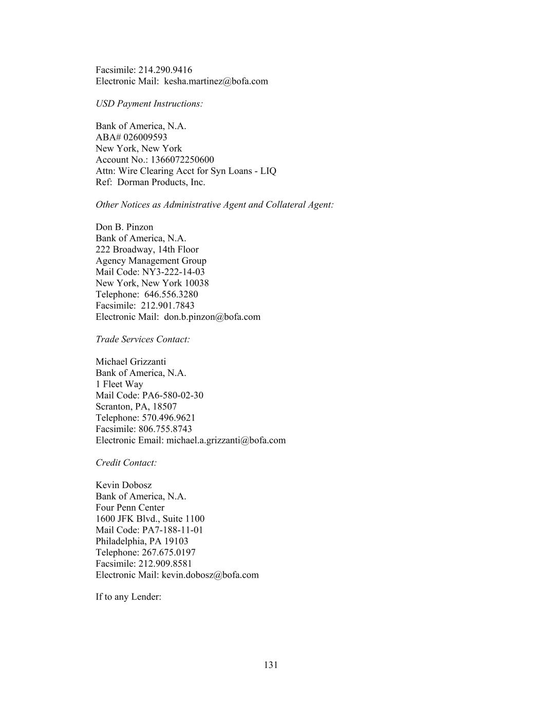 Facsimile: 214.290.9416Electronic Mail: kesha.martinez@bofa.comUSD Payment Instructions:Bank of America, N.A.ABA# 026009593New York, New YorkAccount No.: 1366072250600Attn: Wire Clearing Acct for Syn Loans - LIQRef: Dorman Products, Inc.Other Notices as Administrative Agent and Collateral Agent:Don B. PinzonBank of America, N.A.222 Broadway, 14th FloorAgency Management GroupMail Code: NY3-222-14-03New York, New York 10038Telephone: 646.556.3280Facsimile: 212.901.7843Electronic Mail: don.b.pinzon@bofa.comTrade Services Contact:Michael GrizzantiBank of America, N.A.1 Fleet WayMail Code: PA6-580-02-30Scranton, PA, 18507Telephone: 570.496.9621Facsimile: 806.755.8743Electronic Email: michael.a.grizzanti@bofa.comCredit Contact:Kevin DoboszBank of America, N.A.Four Penn Center1600 JFK Blvd., Suite 1100Mail Code: PA7-188-11-01Philadelphia, PA 19103Telephone: 267.675.0197Facsimile: 212.909.8581Electronic Mail: kevin.dobosz@bofa.comIf to any Lender: 131