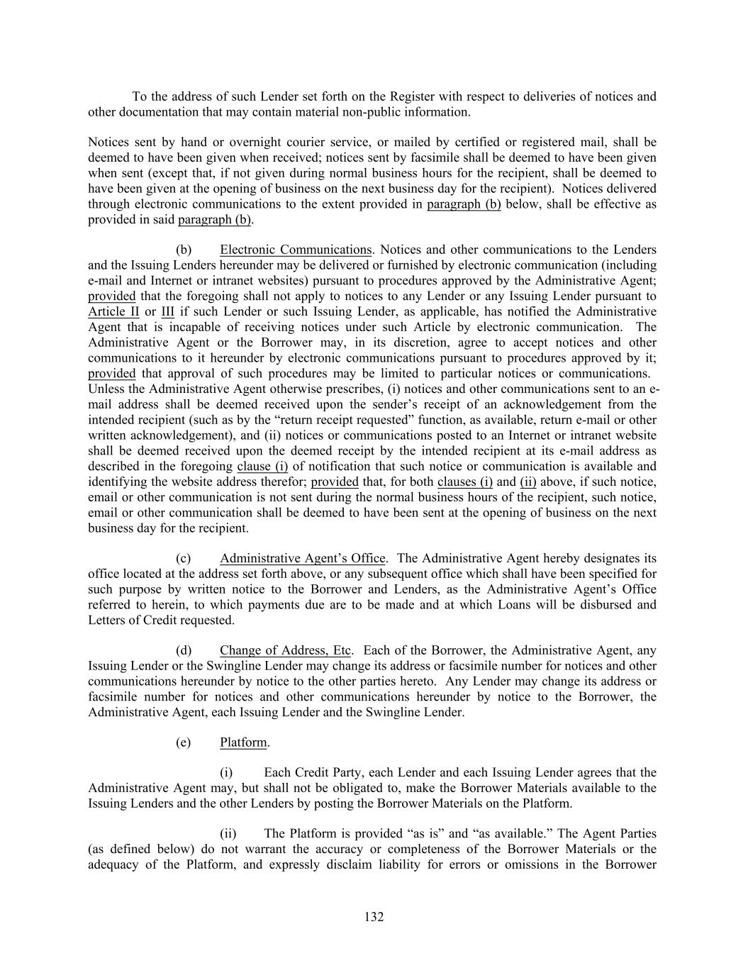 To the address of such Lender set forth on the Register with respect to deliveries of notices andother documentation that may contain material non-public information.Notices sent by hand or overnight courier service, or mailed by certified or registered mail, shall bedeemed to have been given when received; notices sent by facsimile shall be deemed to have been givenwhen sent (except that, if not given during normal business hours for the recipient, shall be deemed tohave been given at the opening of business on the next business day for the recipient). Notices deliveredthrough electronic communications to the extent provided in paragraph (b) below, shall be effective asprovided in said paragraph (b).(b) Electronic Communications. Notices and other communications to the Lendersand the Issuing Lenders hereunder may be delivered or furnished by electronic communication (includinge-mail and Internet or intranet websites) pursuant to procedures approved by the Administrative Agent;provided that the foregoing shall not apply to notices to any Lender or any Issuing Lender pursuant toArticle II or III if such Lender or such Issuing Lender, as applicable, has notified the AdministrativeAgent that is incapable of receiving notices under such Article by electronic communication. TheAdministrative Agent or the Borrower may, in its discretion, agree to accept notices and othercommunications to it hereunder by electronic communications pursuant to procedures approved by it;provided that approval of such procedures may be limited to particular notices or communications.Unless the Administrative Agent otherwise prescribes, (i) notices and other communications sent to an e-mail address shall be deemed received upon the sender’s receipt of an acknowledgement from theintended recipient (such as by the “return receipt requested” function, as available, return e-mail or otherwritten acknowledgement), and (ii) notices or communications posted to an Internet or intranet websiteshall be deemed received upon the deemed receipt by the intended recipient at its e-mail address asdescribed in the foregoing clause (i) of notification that such notice or communication is available andidentifying the website address therefor; provided that, for both clauses (i) and (ii) above, if such notice,email or other communication is not sent during the normal business hours of the recipient, such notice,email or other communication shall be deemed to have been sent at the opening of business on the nextbusiness day for the recipient.(c) Administrative Agent’s Office. The Administrative Agent hereby designates itsoffice located at the address set forth above, or any subsequent office which shall have been specified forsuch purpose by written notice to the Borrower and Lenders, as the Administrative Agent’s Officereferred to herein, to which payments due are to be made and at which Loans will be disbursed andLetters of Credit requested.(d) Change of Address, Etc. Each of the Borrower, the Administrative Agent, anyIssuing Lender or the Swingline Lender may change its address or facsimile number for notices and othercommunications hereunder by notice to the other parties hereto. Any Lender may change its address orfacsimile number for notices and other communications hereunder by notice to the Borrower, theAdministrative Agent, each Issuing Lender and the Swingline Lender.(e) Platform.(i) Each Credit Party, each Lender and each Issuing Lender agrees that theAdministrative Agent may, but shall not be obligated to, make the Borrower Materials available to theIssuing Lenders and the other Lenders by posting the Borrower Materials on the Platform.(ii) The Platform is provided “as is” and “as available.” The Agent Parties(as defined below) do not warrant the accuracy or completeness of the Borrower Materials or theadequacy of the Platform, and expressly disclaim liability for errors or omissions in the Borrower132