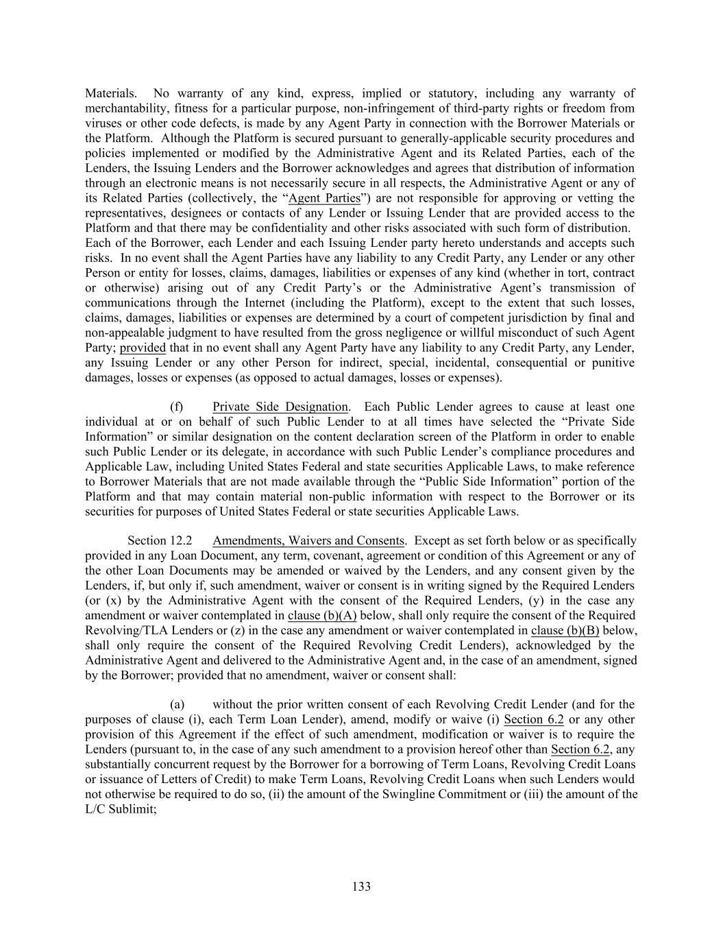 Materials. No warranty of any kind, express, implied or statutory, including any warranty ofmerchantability, fitness for a particular purpose, non-infringement of third-party rights or freedom fromviruses or other code defects, is made by any Agent Party in connection with the Borrower Materials orthe Platform. Although the Platform is secured pursuant to generally-applicable security procedures andpolicies implemented or modified by the Administrative Agent and its Related Parties, each of theLenders, the Issuing Lenders and the Borrower acknowledges and agrees that distribution of informationthrough an electronic means is not necessarily secure in all respects, the Administrative Agent or any ofits Related Parties (collectively, the “Agent Parties”) are not responsible for approving or vetting therepresentatives, designees or contacts of any Lender or Issuing Lender that are provided access to thePlatform and that there may be confidentiality and other risks associated with such form of distribution.Each of the Borrower, each Lender and each Issuing Lender party hereto understands and accepts suchrisks. In no event shall the Agent Parties have any liability to any Credit Party, any Lender or any otherPerson or entity for losses, claims, damages, liabilities or expenses of any kind (whether in tort, contractor otherwise) arising out of any Credit Party’s or the Administrative Agent’s transmission ofcommunications through the Internet (including the Platform), except to the extent that such losses,claims, damages, liabilities or expenses are determined by a court of competent jurisdiction by final andnon-appealable judgment to have resulted from the gross negligence or willful misconduct of such AgentParty; provided that in no event shall any Agent Party have any liability to any Credit Party, any Lender,any Issuing Lender or any other Person for indirect, special, incidental, consequential or punitivedamages, losses or expenses (as opposed to actual damages, losses or expenses).(f) Private Side Designation. Each Public Lender agrees to cause at least oneindividual at or on behalf of such Public Lender to at all times have selected the “Private SideInformation” or similar designation on the content declaration screen of the Platform in order to enablesuch Public Lender or its delegate, in accordance with such Public Lender’s compliance procedures andApplicable Law, including United States Federal and state securities Applicable Laws, to make referenceto Borrower Materials that are not made available through the “Public Side Information” portion of thePlatform and that may contain material non-public information with respect to the Borrower or itssecurities for purposes of United States Federal or state securities Applicable Laws.Section 12.2 Amendments, Waivers and Consents. Except as set forth below or as specificallyprovided in any Loan Document, any term, covenant, agreement or condition of this Agreement or any ofthe other Loan Documents may be amended or waived by the Lenders, and any consent given by theLenders, if, but only if, such amendment, waiver or consent is in writing signed by the Required Lenders(or (x) by the Administrative Agent with the consent of the Required Lenders, (y) in the case anyamendment or waiver contemplated in clause (b)(A) below, shall only require the consent of the RequiredRevolving/TLA Lenders or (z) in the case any amendment or waiver contemplated in clause (b)(B) below,shall only require the consent of the Required Revolving Credit Lenders), acknowledged by theAdministrative Agent and delivered to the Administrative Agent and, in the case of an amendment, signedby the Borrower; provided that no amendment, waiver or consent shall:(a) without the prior written consent of each Revolving Credit Lender (and for thepurposes of clause (i), each Term Loan Lender), amend, modify or waive (i) Section 6.2 or any otherprovision of this Agreement if the effect of such amendment, modification or waiver is to require theLenders (pursuant to, in the case of any such amendment to a provision hereof other than Section 6.2, anysubstantially concurrent request by the Borrower for a borrowing of Term Loans, Revolving Credit Loansor issuance of Letters of Credit) to make Term Loans, Revolving Credit Loans when such Lenders wouldnot otherwise be required to do so, (ii) the amount of the Swingline Commitment or (iii) the amount of theL/C Sublimit; 133
