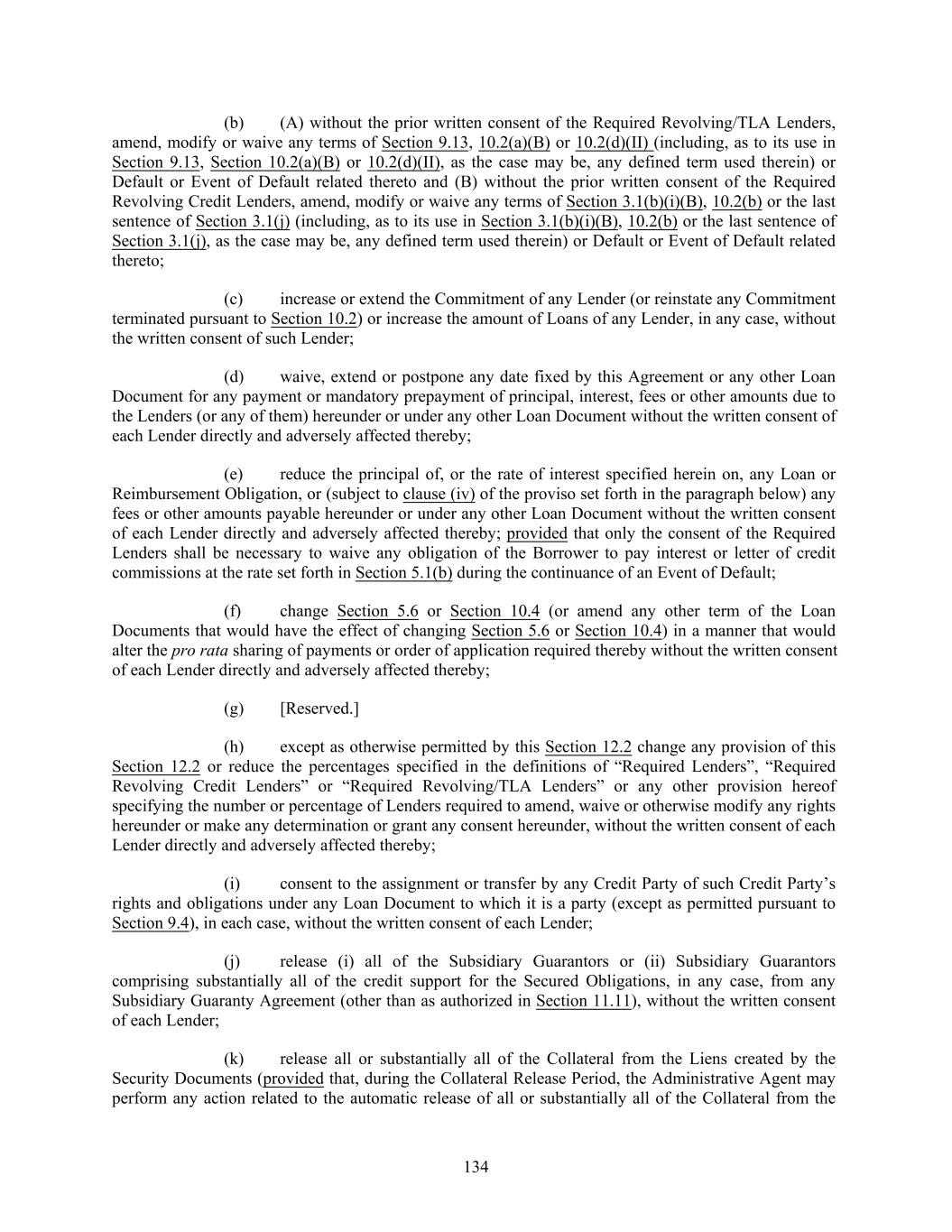 (b) (A) without the prior written consent of the Required Revolving/TLA Lenders,amend, modify or waive any terms of Section 9.13, 10.2(a)(B) or 10.2(d)(II) (including, as to its use inSection 9.13, Section 10.2(a)(B) or 10.2(d)(II), as the case may be, any defined term used therein) orDefault or Event of Default related thereto and (B) without the prior written consent of the RequiredRevolving Credit Lenders, amend, modify or waive any terms of Section 3.1(b)(i)(B), 10.2(b) or the lastsentence of Section 3.1(j) (including, as to its use in Section 3.1(b)(i)(B), 10.2(b) or the last sentence ofSection 3.1(j), as the case may be, any defined term used therein) or Default or Event of Default relatedthereto; (c) increase or extend the Commitment of any Lender (or reinstate any Commitmentterminated pursuant to Section 10.2) or increase the amount of Loans of any Lender, in any case, withoutthe written consent of such Lender;(d) waive, extend or postpone any date fixed by this Agreement or any other LoanDocument for any payment or mandatory prepayment of principal, interest, fees or other amounts due tothe Lenders (or any of them) hereunder or under any other Loan Document without the written consent ofeach Lender directly and adversely affected thereby;(e) reduce the principal of, or the rate of interest specified herein on, any Loan orReimbursement Obligation, or (subject to clause (iv) of the proviso set forth in the paragraph below) anyfees or other amounts payable hereunder or under any other Loan Document without the written consentof each Lender directly and adversely affected thereby; provided that only the consent of the RequiredLenders shall be necessary to waive any obligation of the Borrower to pay interest or letter of creditcommissions at the rate set forth in Section 5.1(b) during the continuance of an Event of Default;(f) change Section 5.6 or Section 10.4 (or amend any other term of the LoanDocuments that would have the effect of changing Section 5.6 or Section 10.4) in a manner that wouldalter the pro rata sharing of payments or order of application required thereby without the written consentof each Lender directly and adversely affected thereby;(g) [Reserved.](h) except as otherwise permitted by this Section 12.2 change any provision of thisSection 12.2 or reduce the percentages specified in the definitions of “Required Lenders”, “RequiredRevolving Credit Lenders” or “Required Revolving/TLA Lenders” or any other provision hereofspecifying the number or percentage of Lenders required to amend, waive or otherwise modify any rightshereunder or make any determination or grant any consent hereunder, without the written consent of eachLender directly and adversely affected thereby;(i) consent to the assignment or transfer by any Credit Party of such Credit Party’srights and obligations under any Loan Document to which it is a party (except as permitted pursuant toSection 9.4), in each case, without the written consent of each Lender;(j) release (i) all of the Subsidiary Guarantors or (ii) Subsidiary Guarantorscomprising substantially all of the credit support for the Secured Obligations, in any case, from anySubsidiary Guaranty Agreement (other than as authorized in Section 11.11), without the written consentof each Lender; (k) release all or substantially all of the Collateral from the Liens created by theSecurity Documents (provided that, during the Collateral Release Period, the Administrative Agent mayperform any action related to the automatic release of all or substantially all of the Collateral from the134