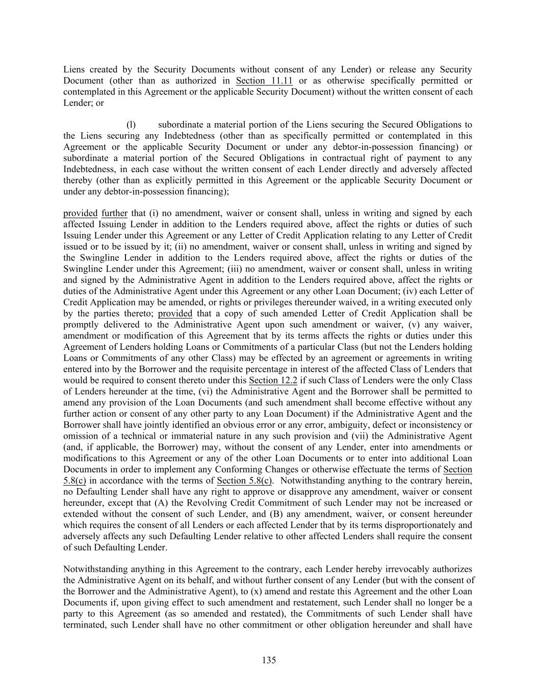 Liens created by the Security Documents without consent of any Lender) or release any SecurityDocument (other than as authorized in Section 11.11 or as otherwise specifically permitted orcontemplated in this Agreement or the applicable Security Document) without the written consent of eachLender; or (l) subordinate a material portion of the Liens securing the Secured Obligations tothe Liens securing any Indebtedness (other than as specifically permitted or contemplated in thisAgreement or the applicable Security Document or under any debtor-in-possession financing) orsubordinate a material portion of the Secured Obligations in contractual right of payment to anyIndebtedness, in each case without the written consent of each Lender directly and adversely affectedthereby (other than as explicitly permitted in this Agreement or the applicable Security Document orunder any debtor-in-possession financing);provided further that (i) no amendment, waiver or consent shall, unless in writing and signed by eachaffected Issuing Lender in addition to the Lenders required above, affect the rights or duties of suchIssuing Lender under this Agreement or any Letter of Credit Application relating to any Letter of Creditissued or to be issued by it; (ii) no amendment, waiver or consent shall, unless in writing and signed bythe Swingline Lender in addition to the Lenders required above, affect the rights or duties of theSwingline Lender under this Agreement; (iii) no amendment, waiver or consent shall, unless in writingand signed by the Administrative Agent in addition to the Lenders required above, affect the rights orduties of the Administrative Agent under this Agreement or any other Loan Document; (iv) each Letter ofCredit Application may be amended, or rights or privileges thereunder waived, in a writing executed onlyby the parties thereto; provided that a copy of such amended Letter of Credit Application shall bepromptly delivered to the Administrative Agent upon such amendment or waiver, (v) any waiver,amendment or modification of this Agreement that by its terms affects the rights or duties under thisAgreement of Lenders holding Loans or Commitments of a particular Class (but not the Lenders holdingLoans or Commitments of any other Class) may be effected by an agreement or agreements in writingentered into by the Borrower and the requisite percentage in interest of the affected Class of Lenders thatwould be required to consent thereto under this Section 12.2 if such Class of Lenders were the only Classof Lenders hereunder at the time, (vi) the Administrative Agent and the Borrower shall be permitted toamend any provision of the Loan Documents (and such amendment shall become effective without anyfurther action or consent of any other party to any Loan Document) if the Administrative Agent and theBorrower shall have jointly identified an obvious error or any error, ambiguity, defect or inconsistency oromission of a technical or immaterial nature in any such provision and (vii) the Administrative Agent(and, if applicable, the Borrower) may, without the consent of any Lender, enter into amendments ormodifications to this Agreement or any of the other Loan Documents or to enter into additional LoanDocuments in order to implement any Conforming Changes or otherwise effectuate the terms of Section5.8(c) in accordance with the terms of Section 5.8(c). Notwithstanding anything to the contrary herein,no Defaulting Lender shall have any right to approve or disapprove any amendment, waiver or consenthereunder, except that (A) the Revolving Credit Commitment of such Lender may not be increased orextended without the consent of such Lender, and (B) any amendment, waiver, or consent hereunderwhich requires the consent of all Lenders or each affected Lender that by its terms disproportionately andadversely affects any such Defaulting Lender relative to other affected Lenders shall require the consentof such Defaulting Lender.Notwithstanding anything in this Agreement to the contrary, each Lender hereby irrevocably authorizesthe Administrative Agent on its behalf, and without further consent of any Lender (but with the consent ofthe Borrower and the Administrative Agent), to (x) amend and restate this Agreement and the other LoanDocuments if, upon giving effect to such amendment and restatement, such Lender shall no longer be aparty to this Agreement (as so amended and restated), the Commitments of such Lender shall haveterminated, such Lender shall have no other commitment or other obligation hereunder and shall have135