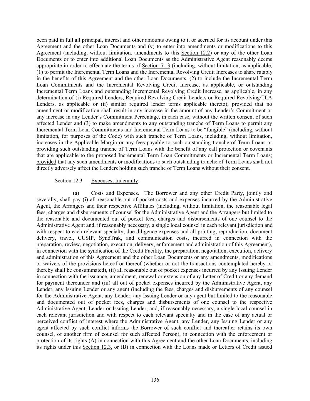 been paid in full all principal, interest and other amounts owing to it or accrued for its account under thisAgreement and the other Loan Documents and (y) to enter into amendments or modifications to thisAgreement (including, without limitation, amendments to this Section 12.2) or any of the other LoanDocuments or to enter into additional Loan Documents as the Administrative Agent reasonably deemsappropriate in order to effectuate the terms of Section 5.13 (including, without limitation, as applicable,(1) to permit the Incremental Term Loans and the Incremental Revolving Credit Increases to share ratablyin the benefits of this Agreement and the other Loan Documents, (2) to include the Incremental TermLoan Commitments and the Incremental Revolving Credit Increase, as applicable, or outstandingIncremental Term Loans and outstanding Incremental Revolving Credit Increase, as applicable, in anydetermination of (i) Required Lenders, Required Revolving Credit Lenders or Required Revolving/TLALenders, as applicable or (ii) similar required lender terms applicable thereto); provided that noamendment or modification shall result in any increase in the amount of any Lender’s Commitment orany increase in any Lender’s Commitment Percentage, in each case, without the written consent of suchaffected Lender and (3) to make amendments to any outstanding tranche of Term Loans to permit anyIncremental Term Loan Commitments and Incremental Term Loans to be “fungible” (including, withoutlimitation, for purposes of the Code) with such tranche of Term Loans, including, without limitation,increases in the Applicable Margin or any fees payable to such outstanding tranche of Term Loans orproviding such outstanding tranche of Term Loans with the benefit of any call protection or covenantsthat are applicable to the proposed Incremental Term Loan Commitments or Incremental Term Loans;provided that any such amendments or modifications to such outstanding tranche of Term Loans shall notdirectly adversely affect the Lenders holding such tranche of Term Loans without their consent.Section 12.3 Expenses; Indemnity.(a) Costs and Expenses. The Borrower and any other Credit Party, jointly andseverally, shall pay (i) all reasonable out of pocket costs and expenses incurred by the AdministrativeAgent, the Arrangers and their respective Affiliates (including, without limitation, the reasonable legalfees, charges and disbursements of counsel for the Administrative Agent and the Arrangers but limited tothe reasonable and documented out of pocket fees, charges and disbursements of one counsel to theAdministrative Agent and, if reasonably necessary, a single local counsel in each relevant jurisdiction andwith respect to each relevant specialty, due diligence expenses and all printing, reproduction, documentdelivery, travel, CUSIP, SyndTrak, and communication costs, incurred in connection with thepreparation, review, negotiation, execution, delivery, enforcement and administration of this Agreement),in connection with the syndication of the Credit Facility, the preparation, negotiation, execution, deliveryand administration of this Agreement and the other Loan Documents or any amendments, modificationsor waivers of the provisions hereof or thereof (whether or not the transactions contemplated hereby orthereby shall be consummated), (ii) all reasonable out of pocket expenses incurred by any Issuing Lenderin connection with the issuance, amendment, renewal or extension of any Letter of Credit or any demandfor payment thereunder and (iii) all out of pocket expenses incurred by the Administrative Agent, anyLender, any Issuing Lender or any agent (including the fees, charges and disbursements of any counselfor the Administrative Agent, any Lender, any Issuing Lender or any agent but limited to the reasonableand documented out of pocket fees, charges and disbursements of one counsel to the respectiveAdministrative Agent, Lender or Issuing Lender, and, if reasonably necessary, a single local counsel ineach relevant jurisdiction and with respect to each relevant specialty and in the case of any actual orperceived conflict of interest where the Administrative Agent, any Lender, any Issuing Lender or anyagent affected by such conflict informs the Borrower of such conflict and thereafter retains its owncounsel, of another firm of counsel for such affected Person), in connection with the enforcement orprotection of its rights (A) in connection with this Agreement and the other Loan Documents, includingits rights under this Section 12.3, or (B) in connection with the Loans made or Letters of Credit issued136