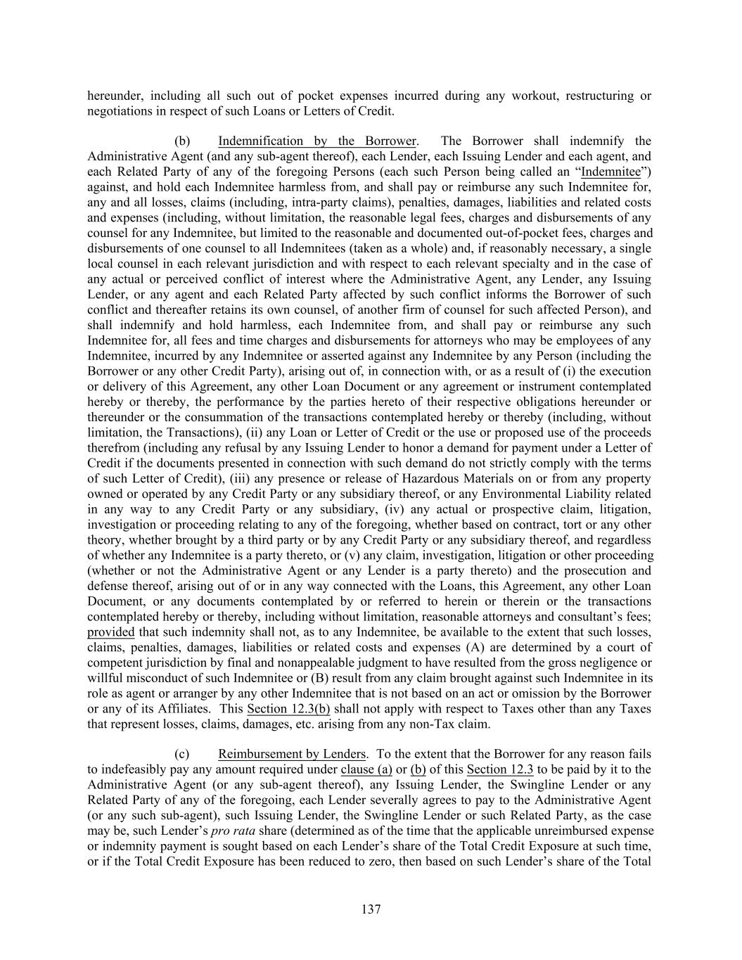 hereunder, including all such out of pocket expenses incurred during any workout, restructuring ornegotiations in respect of such Loans or Letters of Credit.(b) Indemnification by the Borrower. The Borrower shall indemnify theAdministrative Agent (and any sub-agent thereof), each Lender, each Issuing Lender and each agent, andeach Related Party of any of the foregoing Persons (each such Person being called an “Indemnitee”)against, and hold each Indemnitee harmless from, and shall pay or reimburse any such Indemnitee for,any and all losses, claims (including, intra-party claims), penalties, damages, liabilities and related costsand expenses (including, without limitation, the reasonable legal fees, charges and disbursements of anycounsel for any Indemnitee, but limited to the reasonable and documented out-of-pocket fees, charges anddisbursements of one counsel to all Indemnitees (taken as a whole) and, if reasonably necessary, a singlelocal counsel in each relevant jurisdiction and with respect to each relevant specialty and in the case ofany actual or perceived conflict of interest where the Administrative Agent, any Lender, any IssuingLender, or any agent and each Related Party affected by such conflict informs the Borrower of suchconflict and thereafter retains its own counsel, of another firm of counsel for such affected Person), andshall indemnify and hold harmless, each Indemnitee from, and shall pay or reimburse any suchIndemnitee for, all fees and time charges and disbursements for attorneys who may be employees of anyIndemnitee, incurred by any Indemnitee or asserted against any Indemnitee by any Person (including theBorrower or any other Credit Party), arising out of, in connection with, or as a result of (i) the executionor delivery of this Agreement, any other Loan Document or any agreement or instrument contemplatedhereby or thereby, the performance by the parties hereto of their respective obligations hereunder orthereunder or the consummation of the transactions contemplated hereby or thereby (including, withoutlimitation, the Transactions), (ii) any Loan or Letter of Credit or the use or proposed use of the proceedstherefrom (including any refusal by any Issuing Lender to honor a demand for payment under a Letter ofCredit if the documents presented in connection with such demand do not strictly comply with the termsof such Letter of Credit), (iii) any presence or release of Hazardous Materials on or from any propertyowned or operated by any Credit Party or any subsidiary thereof, or any Environmental Liability relatedin any way to any Credit Party or any subsidiary, (iv) any actual or prospective claim, litigation,investigation or proceeding relating to any of the foregoing, whether based on contract, tort or any othertheory, whether brought by a third party or by any Credit Party or any subsidiary thereof, and regardlessof whether any Indemnitee is a party thereto, or (v) any claim, investigation, litigation or other proceeding(whether or not the Administrative Agent or any Lender is a party thereto) and the prosecution anddefense thereof, arising out of or in any way connected with the Loans, this Agreement, any other LoanDocument, or any documents contemplated by or referred to herein or therein or the transactionscontemplated hereby or thereby, including without limitation, reasonable attorneys and consultant’s fees;provided that such indemnity shall not, as to any Indemnitee, be available to the extent that such losses,claims, penalties, damages, liabilities or related costs and expenses (A) are determined by a court ofcompetent jurisdiction by final and nonappealable judgment to have resulted from the gross negligence orwillful misconduct of such Indemnitee or (B) result from any claim brought against such Indemnitee in itsrole as agent or arranger by any other Indemnitee that is not based on an act or omission by the Borroweror any of its Affiliates. This Section 12.3(b) shall not apply with respect to Taxes other than any Taxesthat represent losses, claims, damages, etc. arising from any non-Tax claim.(c) Reimbursement by Lenders. To the extent that the Borrower for any reason failsto indefeasibly pay any amount required under clause (a) or (b) of this Section 12.3 to be paid by it to theAdministrative Agent (or any sub-agent thereof), any Issuing Lender, the Swingline Lender or anyRelated Party of any of the foregoing, each Lender severally agrees to pay to the Administrative Agent(or any such sub-agent), such Issuing Lender, the Swingline Lender or such Related Party, as the casemay be, such Lender’s pro rata share (determined as of the time that the applicable unreimbursed expenseor indemnity payment is sought based on each Lender’s share of the Total Credit Exposure at such time,or if the Total Credit Exposure has been reduced to zero, then based on such Lender’s share of the Total137