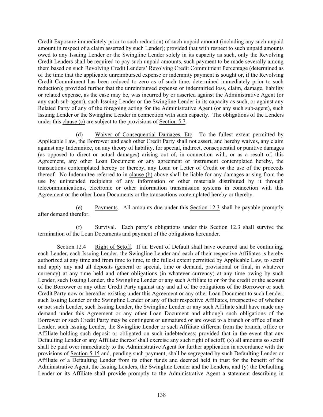 Credit Exposure immediately prior to such reduction) of such unpaid amount (including any such unpaidamount in respect of a claim asserted by such Lender); provided that with respect to such unpaid amountsowed to any Issuing Lender or the Swingline Lender solely in its capacity as such, only the RevolvingCredit Lenders shall be required to pay such unpaid amounts, such payment to be made severally amongthem based on such Revolving Credit Lenders’ Revolving Credit Commitment Percentage (determined asof the time that the applicable unreimbursed expense or indemnity payment is sought or, if the RevolvingCredit Commitment has been reduced to zero as of such time, determined immediately prior to suchreduction); provided further that the unreimbursed expense or indemnified loss, claim, damage, liabilityor related expense, as the case may be, was incurred by or asserted against the Administrative Agent (orany such sub-agent), such Issuing Lender or the Swingline Lender in its capacity as such, or against anyRelated Party of any of the foregoing acting for the Administrative Agent (or any such sub-agent), suchIssuing Lender or the Swingline Lender in connection with such capacity. The obligations of the Lendersunder this clause (c) are subject to the provisions of Section 5.7.(d) Waiver of Consequential Damages, Etc. To the fullest extent permitted byApplicable Law, the Borrower and each other Credit Party shall not assert, and hereby waives, any claimagainst any Indemnitee, on any theory of liability, for special, indirect, consequential or punitive damages(as opposed to direct or actual damages) arising out of, in connection with, or as a result of, thisAgreement, any other Loan Document or any agreement or instrument contemplated hereby, thetransactions contemplated hereby or thereby, any Loan or Letter of Credit or the use of the proceedsthereof. No Indemnitee referred to in clause (b) above shall be liable for any damages arising from theuse by unintended recipients of any information or other materials distributed by it throughtelecommunications, electronic or other information transmission systems in connection with thisAgreement or the other Loan Documents or the transactions contemplated hereby or thereby.(e) Payments. All amounts due under this Section 12.3 shall be payable promptlyafter demand therefor.(f) Survival. Each party’s obligations under this Section 12.3 shall survive thetermination of the Loan Documents and payment of the obligations hereunder.Section 12.4 Right of Setoff. If an Event of Default shall have occurred and be continuing,each Lender, each Issuing Lender, the Swingline Lender and each of their respective Affiliates is herebyauthorized at any time and from time to time, to the fullest extent permitted by Applicable Law, to setoffand apply any and all deposits (general or special, time or demand, provisional or final, in whatevercurrency) at any time held and other obligations (in whatever currency) at any time owing by suchLender, such Issuing Lender, the Swingline Lender or any such Affiliate to or for the credit or the accountof the Borrower or any other Credit Party against any and all of the obligations of the Borrower or suchCredit Party now or hereafter existing under this Agreement or any other Loan Document to such Lender,such Issuing Lender or the Swingline Lender or any of their respective Affiliates, irrespective of whetheror not such Lender, such Issuing Lender, the Swingline Lender or any such Affiliate shall have made anydemand under this Agreement or any other Loan Document and although such obligations of theBorrower or such Credit Party may be contingent or unmatured or are owed to a branch or office of suchLender, such Issuing Lender, the Swingline Lender or such Affiliate different from the branch, office orAffiliate holding such deposit or obligated on such indebtedness; provided that in the event that anyDefaulting Lender or any Affiliate thereof shall exercise any such right of setoff, (x) all amounts so setoffshall be paid over immediately to the Administrative Agent for further application in accordance with theprovisions of Section 5.15 and, pending such payment, shall be segregated by such Defaulting Lender orAffiliate of a Defaulting Lender from its other funds and deemed held in trust for the benefit of theAdministrative Agent, the Issuing Lenders, the Swingline Lender and the Lenders, and (y) the DefaultingLender or its Affiliate shall provide promptly to the Administrative Agent a statement describing in138