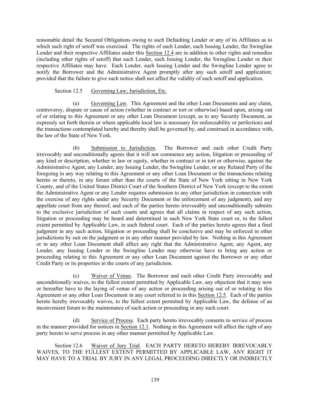reasonable detail the Secured Obligations owing to such Defaulting Lender or any of its Affiliates as towhich such right of setoff was exercised. The rights of each Lender, each Issuing Lender, the SwinglineLender and their respective Affiliates under this Section 12.4 are in addition to other rights and remedies(including other rights of setoff) that such Lender, such Issuing Lender, the Swingline Lender or theirrespective Affiliates may have. Each Lender, such Issuing Lender and the Swingline Lender agree tonotify the Borrower and the Administrative Agent promptly after any such setoff and application;provided that the failure to give such notice shall not affect the validity of such setoff and application.Section 12.5 Governing Law; Jurisdiction, Etc.(a) Governing Law. This Agreement and the other Loan Documents and any claim,controversy, dispute or cause of action (whether in contract or tort or otherwise) based upon, arising outof or relating to this Agreement or any other Loan Document (except, as to any Security Document, asexpressly set forth therein or where applicable local law is necessary for enforceability or perfection) andthe transactions contemplated hereby and thereby shall be governed by, and construed in accordance with,the law of the State of New York.(b) Submission to Jurisdiction. The Borrower and each other Credit Partyirrevocably and unconditionally agrees that it will not commence any action, litigation or proceeding ofany kind or description, whether in law or equity, whether in contract or in tort or otherwise, against theAdministrative Agent, any Lender, any Issuing Lender, the Swingline Lender, or any Related Party of theforegoing in any way relating to this Agreement or any other Loan Document or the transactions relatinghereto or thereto, in any forum other than the courts of the State of New York sitting in New YorkCounty, and of the United States District Court of the Southern District of New York (except to the extentthe Administrative Agent or any Lender requires submission to any other jurisdiction in connection withthe exercise of any rights under any Security Document or the enforcement of any judgment), and anyappellate court from any thereof, and each of the parties hereto irrevocably and unconditionally submitsto the exclusive jurisdiction of such courts and agrees that all claims in respect of any such action,litigation or proceeding may be heard and determined in such New York State court or, to the fullestextent permitted by Applicable Law, in such federal court. Each of the parties hereto agrees that a finaljudgment in any such action, litigation or proceeding shall be conclusive and may be enforced in otherjurisdictions by suit on the judgment or in any other manner provided by law. Nothing in this Agreementor in any other Loan Document shall affect any right that the Administrative Agent, any Agent, anyLender, any Issuing Lender or the Swingline Lender may otherwise have to bring any action orproceeding relating to this Agreement or any other Loan Document against the Borrower or any otherCredit Party or its properties in the courts of any jurisdiction.(c) Waiver of Venue. The Borrower and each other Credit Party irrevocably andunconditionally waives, to the fullest extent permitted by Applicable Law, any objection that it may nowor hereafter have to the laying of venue of any action or proceeding arising out of or relating to thisAgreement or any other Loan Document in any court referred to in this Section 12.5. Each of the partieshereto hereby irrevocably waives, to the fullest extent permitted by Applicable Law, the defense of aninconvenient forum to the maintenance of such action or proceeding in any such court.(d) Service of Process. Each party hereto irrevocably consents to service of processin the manner provided for notices in Section 12.1. Nothing in this Agreement will affect the right of anyparty hereto to serve process in any other manner permitted by Applicable Law.Section 12.6 Waiver of Jury Trial. EACH PARTY HERETO HEREBY IRREVOCABLYWAIVES, TO THE FULLEST EXTENT PERMITTED BY APPLICABLE LAW, ANY RIGHT ITMAY HAVE TO A TRIAL BY JURY IN ANY LEGAL PROCEEDING DIRECTLY OR INDIRECTLY139