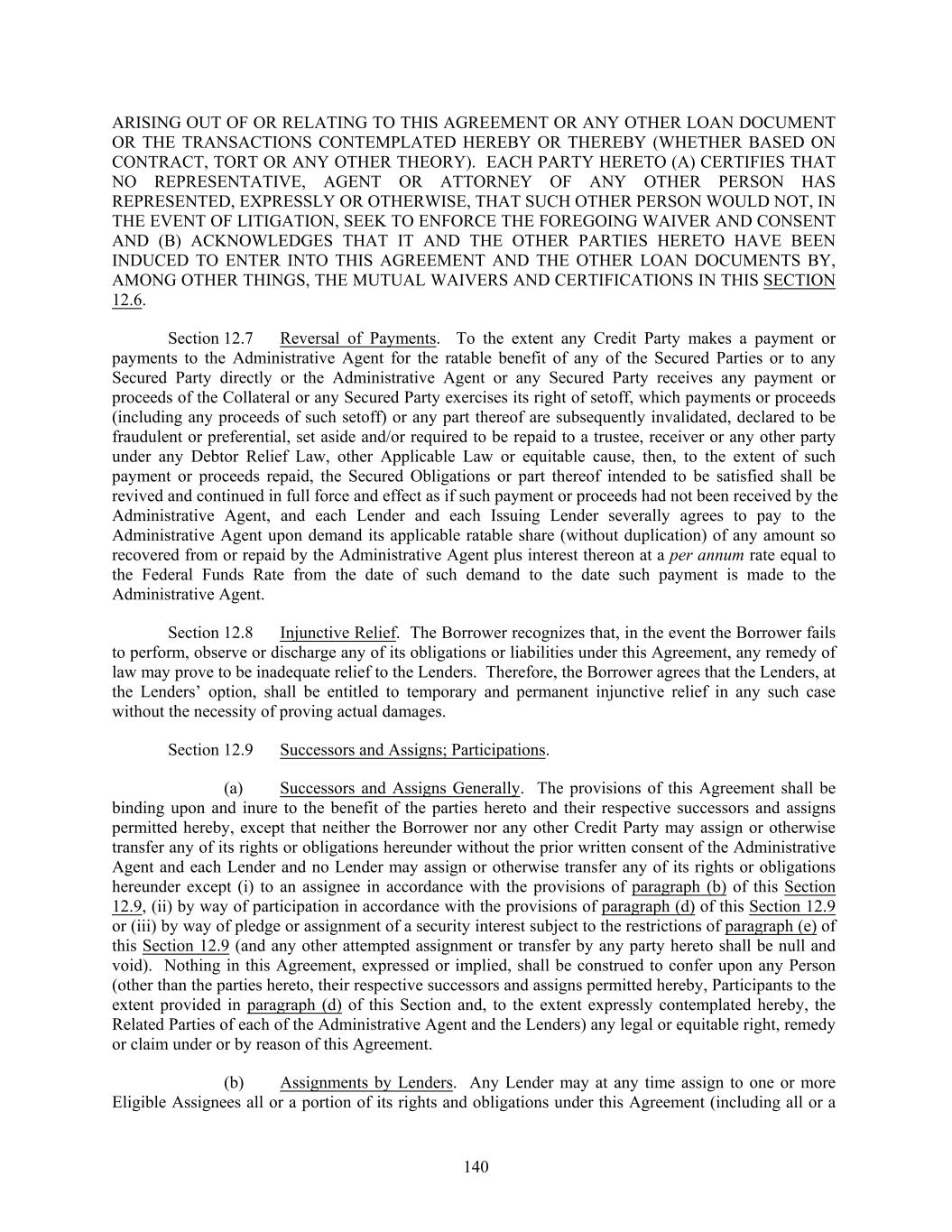ARISING OUT OF OR RELATING TO THIS AGREEMENT OR ANY OTHER LOAN DOCUMENTOR THE TRANSACTIONS CONTEMPLATED HEREBY OR THEREBY (WHETHER BASED ONCONTRACT, TORT OR ANY OTHER THEORY). EACH PARTY HERETO (A) CERTIFIES THATNO REPRESENTATIVE, AGENT OR ATTORNEY OF ANY OTHER PERSON HASREPRESENTED, EXPRESSLY OR OTHERWISE, THAT SUCH OTHER PERSON WOULD NOT, INTHE EVENT OF LITIGATION, SEEK TO ENFORCE THE FOREGOING WAIVER AND CONSENTAND (B) ACKNOWLEDGES THAT IT AND THE OTHER PARTIES HERETO HAVE BEENINDUCED TO ENTER INTO THIS AGREEMENT AND THE OTHER LOAN DOCUMENTS BY,AMONG OTHER THINGS, THE MUTUAL WAIVERS AND CERTIFICATIONS IN THIS SECTION12.6. Section 12.7 Reversal of Payments. To the extent any Credit Party makes a payment orpayments to the Administrative Agent for the ratable benefit of any of the Secured Parties or to anySecured Party directly or the Administrative Agent or any Secured Party receives any payment orproceeds of the Collateral or any Secured Party exercises its right of setoff, which payments or proceeds(including any proceeds of such setoff) or any part thereof are subsequently invalidated, declared to befraudulent or preferential, set aside and/or required to be repaid to a trustee, receiver or any other partyunder any Debtor Relief Law, other Applicable Law or equitable cause, then, to the extent of suchpayment or proceeds repaid, the Secured Obligations or part thereof intended to be satisfied shall berevived and continued in full force and effect as if such payment or proceeds had not been received by theAdministrative Agent, and each Lender and each Issuing Lender severally agrees to pay to theAdministrative Agent upon demand its applicable ratable share (without duplication) of any amount sorecovered from or repaid by the Administrative Agent plus interest thereon at a per annum rate equal tothe Federal Funds Rate from the date of such demand to the date such payment is made to theAdministrative Agent.Section 12.8 Injunctive Relief. The Borrower recognizes that, in the event the Borrower failsto perform, observe or discharge any of its obligations or liabilities under this Agreement, any remedy oflaw may prove to be inadequate relief to the Lenders. Therefore, the Borrower agrees that the Lenders, atthe Lenders’ option, shall be entitled to temporary and permanent injunctive relief in any such casewithout the necessity of proving actual damages.Section 12.9 Successors and Assigns; Participations.(a) Successors and Assigns Generally. The provisions of this Agreement shall bebinding upon and inure to the benefit of the parties hereto and their respective successors and assignspermitted hereby, except that neither the Borrower nor any other Credit Party may assign or otherwisetransfer any of its rights or obligations hereunder without the prior written consent of the AdministrativeAgent and each Lender and no Lender may assign or otherwise transfer any of its rights or obligationshereunder except (i) to an assignee in accordance with the provisions of paragraph (b) of this Section12.9, (ii) by way of participation in accordance with the provisions of paragraph (d) of this Section 12.9or (iii) by way of pledge or assignment of a security interest subject to the restrictions of paragraph (e) ofthis Section 12.9 (and any other attempted assignment or transfer by any party hereto shall be null andvoid). Nothing in this Agreement, expressed or implied, shall be construed to confer upon any Person(other than the parties hereto, their respective successors and assigns permitted hereby, Participants to theextent provided in paragraph (d) of this Section and, to the extent expressly contemplated hereby, theRelated Parties of each of the Administrative Agent and the Lenders) any legal or equitable right, remedyor claim under or by reason of this Agreement.(b) Assignments by Lenders. Any Lender may at any time assign to one or moreEligible Assignees all or a portion of its rights and obligations under this Agreement (including all or a140