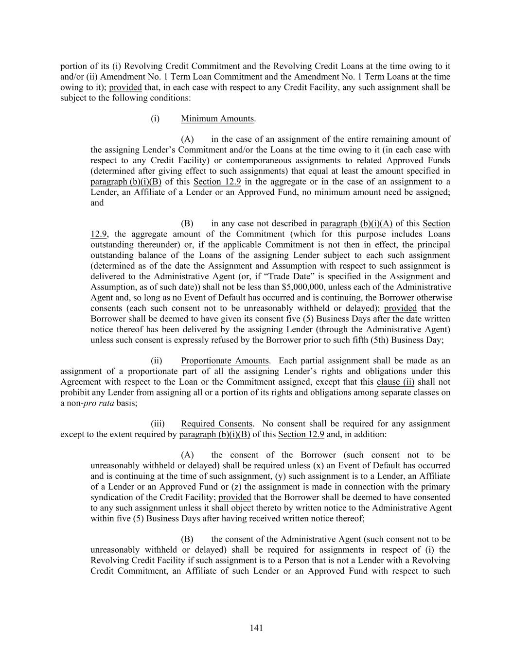 portion of its (i) Revolving Credit Commitment and the Revolving Credit Loans at the time owing to itand/or (ii) Amendment No. 1 Term Loan Commitment and the Amendment No. 1 Term Loans at the timeowing to it); provided that, in each case with respect to any Credit Facility, any such assignment shall besubject to the following conditions:(i) Minimum Amounts.(A) in the case of an assignment of the entire remaining amount ofthe assigning Lender’s Commitment and/or the Loans at the time owing to it (in each case withrespect to any Credit Facility) or contemporaneous assignments to related Approved Funds(determined after giving effect to such assignments) that equal at least the amount specified inparagraph (b)(i)(B) of this Section 12.9 in the aggregate or in the case of an assignment to aLender, an Affiliate of a Lender or an Approved Fund, no minimum amount need be assigned;and (B) in any case not described in paragraph (b)(i)(A) of this Section12.9, the aggregate amount of the Commitment (which for this purpose includes Loansoutstanding thereunder) or, if the applicable Commitment is not then in effect, the principaloutstanding balance of the Loans of the assigning Lender subject to each such assignment(determined as of the date the Assignment and Assumption with respect to such assignment isdelivered to the Administrative Agent (or, if “Trade Date” is specified in the Assignment andAssumption, as of such date)) shall not be less than $5,000,000, unless each of the AdministrativeAgent and, so long as no Event of Default has occurred and is continuing, the Borrower otherwiseconsents (each such consent not to be unreasonably withheld or delayed); provided that theBorrower shall be deemed to have given its consent five (5) Business Days after the date writtennotice thereof has been delivered by the assigning Lender (through the Administrative Agent)unless such consent is expressly refused by the Borrower prior to such fifth (5th) Business Day;(ii) Proportionate Amounts. Each partial assignment shall be made as anassignment of a proportionate part of all the assigning Lender’s rights and obligations under thisAgreement with respect to the Loan or the Commitment assigned, except that this clause (ii) shall notprohibit any Lender from assigning all or a portion of its rights and obligations among separate classes ona non-pro rata basis; (iii) Required Consents. No consent shall be required for any assignmentexcept to the extent required by paragraph (b)(i)(B) of this Section 12.9 and, in addition:(A) the consent of the Borrower (such consent not to beunreasonably withheld or delayed) shall be required unless (x) an Event of Default has occurredand is continuing at the time of such assignment, (y) such assignment is to a Lender, an Affiliateof a Lender or an Approved Fund or (z) the assignment is made in connection with the primarysyndication of the Credit Facility; provided that the Borrower shall be deemed to have consentedto any such assignment unless it shall object thereto by written notice to the Administrative Agentwithin five (5) Business Days after having received written notice thereof;(B) the consent of the Administrative Agent (such consent not to beunreasonably withheld or delayed) shall be required for assignments in respect of (i) theRevolving Credit Facility if such assignment is to a Person that is not a Lender with a RevolvingCredit Commitment, an Affiliate of such Lender or an Approved Fund with respect to such141