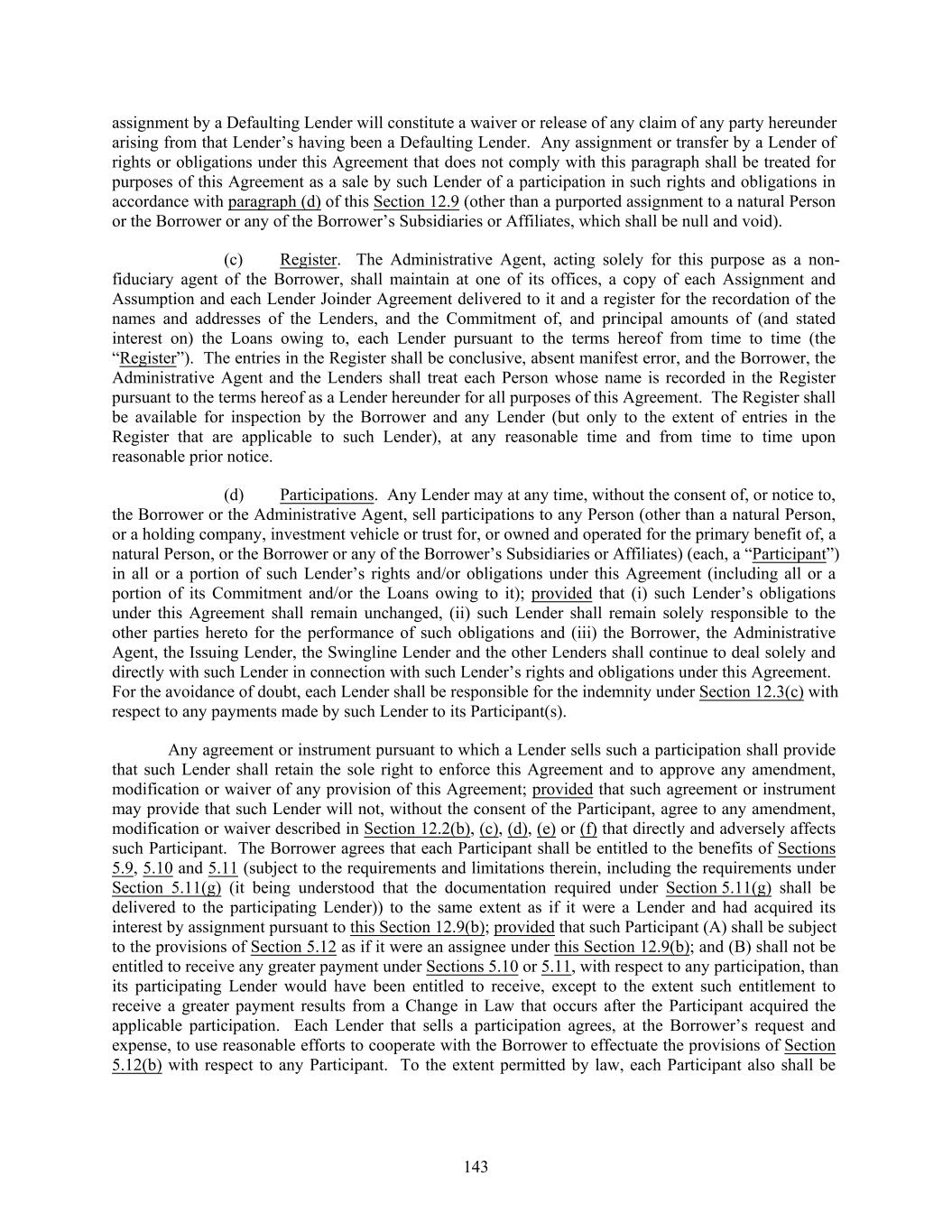 assignment by a Defaulting Lender will constitute a waiver or release of any claim of any party hereunderarising from that Lender’s having been a Defaulting Lender. Any assignment or transfer by a Lender ofrights or obligations under this Agreement that does not comply with this paragraph shall be treated forpurposes of this Agreement as a sale by such Lender of a participation in such rights and obligations inaccordance with paragraph (d) of this Section 12.9 (other than a purported assignment to a natural Personor the Borrower or any of the Borrower’s Subsidiaries or Affiliates, which shall be null and void).(c) Register. The Administrative Agent, acting solely for this purpose as a non-fiduciary agent of the Borrower, shall maintain at one of its offices, a copy of each Assignment andAssumption and each Lender Joinder Agreement delivered to it and a register for the recordation of thenames and addresses of the Lenders, and the Commitment of, and principal amounts of (and statedinterest on) the Loans owing to, each Lender pursuant to the terms hereof from time to time (the“Register”). The entries in the Register shall be conclusive, absent manifest error, and the Borrower, theAdministrative Agent and the Lenders shall treat each Person whose name is recorded in the Registerpursuant to the terms hereof as a Lender hereunder for all purposes of this Agreement. The Register shallbe available for inspection by the Borrower and any Lender (but only to the extent of entries in theRegister that are applicable to such Lender), at any reasonable time and from time to time uponreasonable prior notice.(d) Participations. Any Lender may at any time, without the consent of, or notice to,the Borrower or the Administrative Agent, sell participations to any Person (other than a natural Person,or a holding company, investment vehicle or trust for, or owned and operated for the primary benefit of, anatural Person, or the Borrower or any of the Borrower’s Subsidiaries or Affiliates) (each, a “Participant”)in all or a portion of such Lender’s rights and/or obligations under this Agreement (including all or aportion of its Commitment and/or the Loans owing to it); provided that (i) such Lender’s obligationsunder this Agreement shall remain unchanged, (ii) such Lender shall remain solely responsible to theother parties hereto for the performance of such obligations and (iii) the Borrower, the AdministrativeAgent, the Issuing Lender, the Swingline Lender and the other Lenders shall continue to deal solely anddirectly with such Lender in connection with such Lender’s rights and obligations under this Agreement.For the avoidance of doubt, each Lender shall be responsible for the indemnity under Section 12.3(c) withrespect to any payments made by such Lender to its Participant(s).Any agreement or instrument pursuant to which a Lender sells such a participation shall providethat such Lender shall retain the sole right to enforce this Agreement and to approve any amendment,modification or waiver of any provision of this Agreement; provided that such agreement or instrumentmay provide that such Lender will not, without the consent of the Participant, agree to any amendment,modification or waiver described in Section 12.2(b), (c), (d), (e) or (f) that directly and adversely affectssuch Participant. The Borrower agrees that each Participant shall be entitled to the benefits of Sections5.9, 5.10 and 5.11 (subject to the requirements and limitations therein, including the requirements underSection 5.11(g) (it being understood that the documentation required under Section 5.11(g) shall bedelivered to the participating Lender)) to the same extent as if it were a Lender and had acquired itsinterest by assignment pursuant to this Section 12.9(b); provided that such Participant (A) shall be subjectto the provisions of Section 5.12 as if it were an assignee under this Section 12.9(b); and (B) shall not beentitled to receive any greater payment under Sections 5.10 or 5.11, with respect to any participation, thanits participating Lender would have been entitled to receive, except to the extent such entitlement toreceive a greater payment results from a Change in Law that occurs after the Participant acquired theapplicable participation. Each Lender that sells a participation agrees, at the Borrower’s request andexpense, to use reasonable efforts to cooperate with the Borrower to effectuate the provisions of Section5.12(b) with respect to any Participant. To the extent permitted by law, each Participant also shall be143