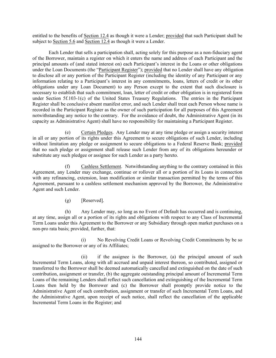 entitled to the benefits of Section 12.4 as though it were a Lender; provided that such Participant shall besubject to Section 5.6 and Section 12.4 as though it were a Lender.Each Lender that sells a participation shall, acting solely for this purpose as a non-fiduciary agentof the Borrower, maintain a register on which it enters the name and address of each Participant and theprincipal amounts of (and stated interest on) each Participant’s interest in the Loans or other obligationsunder the Loan Documents (the “Participant Register”); provided that no Lender shall have any obligationto disclose all or any portion of the Participant Register (including the identity of any Participant or anyinformation relating to a Participant’s interest in any commitments, loans, letters of credit or its otherobligations under any Loan Document) to any Person except to the extent that such disclosure isnecessary to establish that such commitment, loan, letter of credit or other obligation is in registered formunder Section 5f.103-1(c) of the United States Treasury Regulations. The entries in the ParticipantRegister shall be conclusive absent manifest error, and such Lender shall treat each Person whose name isrecorded in the Participant Register as the owner of such participation for all purposes of this Agreementnotwithstanding any notice to the contrary. For the avoidance of doubt, the Administrative Agent (in itscapacity as Administrative Agent) shall have no responsibility for maintaining a Participant Register.(e) Certain Pledges. Any Lender may at any time pledge or assign a security interestin all or any portion of its rights under this Agreement to secure obligations of such Lender, includingwithout limitation any pledge or assignment to secure obligations to a Federal Reserve Bank; providedthat no such pledge or assignment shall release such Lender from any of its obligations hereunder orsubstitute any such pledgee or assignee for such Lender as a party hereto.(f) Cashless Settlement. Notwithstanding anything to the contrary contained in thisAgreement, any Lender may exchange, continue or rollover all or a portion of its Loans in connectionwith any refinancing, extension, loan modification or similar transaction permitted by the terms of thisAgreement, pursuant to a cashless settlement mechanism approved by the Borrower, the AdministrativeAgent and such Lender.(g) [Reserved].(h) Any Lender may, so long as no Event of Default has occurred and is continuing,at any time, assign all or a portion of its rights and obligations with respect to any Class of IncrementalTerm Loans under this Agreement to the Borrower or any Subsidiary through open market purchases on anon-pro rata basis; provided, further, that:(i) No Revolving Credit Loans or Revolving Credit Commitments by be soassigned to the Borrower or any of its Affiliates;(ii) if the assignee is the Borrower, (a) the principal amount of suchIncremental Term Loans, along with all accrued and unpaid interest thereon, so contributed, assigned ortransferred to the Borrower shall be deemed automatically cancelled and extinguished on the date of suchcontribution, assignment or transfer, (b) the aggregate outstanding principal amount of Incremental TermLoans of the remaining Lenders shall reflect such cancellation and extinguishing of the Incremental TermLoans then held by the Borrower and (c) the Borrower shall promptly provide notice to theAdministrative Agent of such contribution, assignment or transfer of such Incremental Term Loans, andthe Administrative Agent, upon receipt of such notice, shall reflect the cancellation of the applicableIncremental Term Loans in the Register; and 144