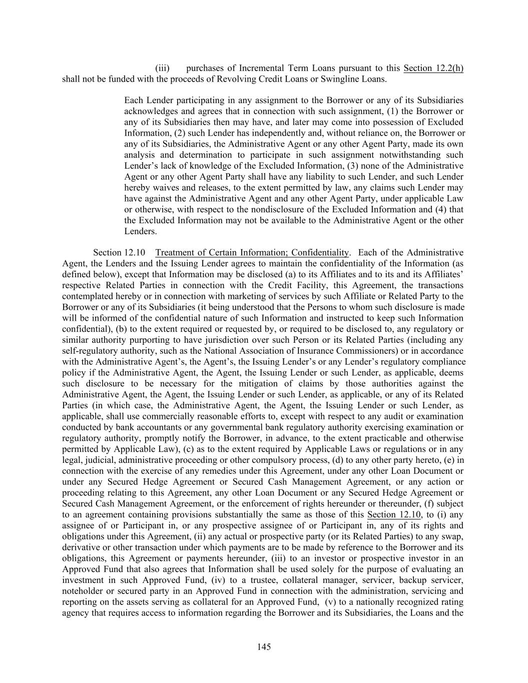 (iii) purchases of Incremental Term Loans pursuant to this Section 12.2(h)shall not be funded with the proceeds of Revolving Credit Loans or Swingline Loans.Each Lender participating in any assignment to the Borrower or any of its Subsidiariesacknowledges and agrees that in connection with such assignment, (1) the Borrower orany of its Subsidiaries then may have, and later may come into possession of ExcludedInformation, (2) such Lender has independently and, without reliance on, the Borrower orany of its Subsidiaries, the Administrative Agent or any other Agent Party, made its ownanalysis and determination to participate in such assignment notwithstanding suchLender’s lack of knowledge of the Excluded Information, (3) none of the AdministrativeAgent or any other Agent Party shall have any liability to such Lender, and such Lenderhereby waives and releases, to the extent permitted by law, any claims such Lender mayhave against the Administrative Agent and any other Agent Party, under applicable Lawor otherwise, with respect to the nondisclosure of the Excluded Information and (4) thatthe Excluded Information may not be available to the Administrative Agent or the otherLenders.Section 12.10 Treatment of Certain Information; Confidentiality. Each of the AdministrativeAgent, the Lenders and the Issuing Lender agrees to maintain the confidentiality of the Information (asdefined below), except that Information may be disclosed (a) to its Affiliates and to its and its Affiliates’respective Related Parties in connection with the Credit Facility, this Agreement, the transactionscontemplated hereby or in connection with marketing of services by such Affiliate or Related Party to theBorrower or any of its Subsidiaries (it being understood that the Persons to whom such disclosure is madewill be informed of the confidential nature of such Information and instructed to keep such Informationconfidential), (b) to the extent required or requested by, or required to be disclosed to, any regulatory orsimilar authority purporting to have jurisdiction over such Person or its Related Parties (including anyself-regulatory authority, such as the National Association of Insurance Commissioners) or in accordancewith the Administrative Agent’s, the Agent’s, the Issuing Lender’s or any Lender’s regulatory compliancepolicy if the Administrative Agent, the Agent, the Issuing Lender or such Lender, as applicable, deemssuch disclosure to be necessary for the mitigation of claims by those authorities against theAdministrative Agent, the Agent, the Issuing Lender or such Lender, as applicable, or any of its RelatedParties (in which case, the Administrative Agent, the Agent, the Issuing Lender or such Lender, asapplicable, shall use commercially reasonable efforts to, except with respect to any audit or examinationconducted by bank accountants or any governmental bank regulatory authority exercising examination orregulatory authority, promptly notify the Borrower, in advance, to the extent practicable and otherwisepermitted by Applicable Law), (c) as to the extent required by Applicable Laws or regulations or in anylegal, judicial, administrative proceeding or other compulsory process, (d) to any other party hereto, (e) inconnection with the exercise of any remedies under this Agreement, under any other Loan Document orunder any Secured Hedge Agreement or Secured Cash Management Agreement, or any action orproceeding relating to this Agreement, any other Loan Document or any Secured Hedge Agreement orSecured Cash Management Agreement, or the enforcement of rights hereunder or thereunder, (f) subjectto an agreement containing provisions substantially the same as those of this Section 12.10, to (i) anyassignee of or Participant in, or any prospective assignee of or Participant in, any of its rights andobligations under this Agreement, (ii) any actual or prospective party (or its Related Parties) to any swap,derivative or other transaction under which payments are to be made by reference to the Borrower and itsobligations, this Agreement or payments hereunder, (iii) to an investor or prospective investor in anApproved Fund that also agrees that Information shall be used solely for the purpose of evaluating aninvestment in such Approved Fund, (iv) to a trustee, collateral manager, servicer, backup servicer,noteholder or secured party in an Approved Fund in connection with the administration, servicing andreporting on the assets serving as collateral for an Approved Fund, (v) to a nationally recognized ratingagency that requires access to information regarding the Borrower and its Subsidiaries, the Loans and the145