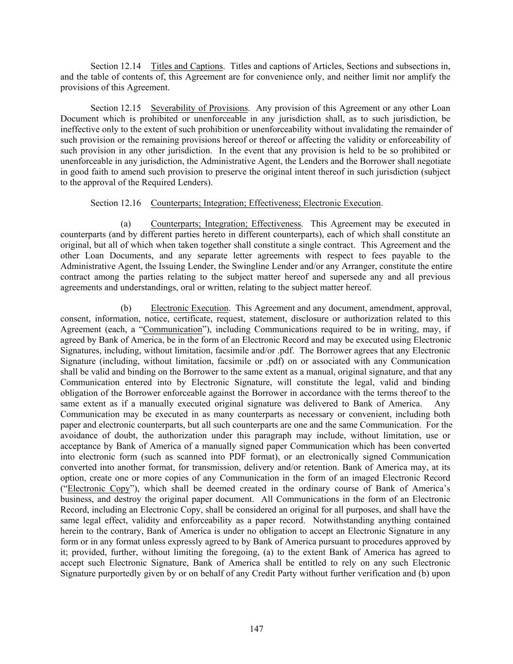 Section 12.14 Titles and Captions. Titles and captions of Articles, Sections and subsections in,and the table of contents of, this Agreement are for convenience only, and neither limit nor amplify theprovisions of this Agreement.Section 12.15 Severability of Provisions. Any provision of this Agreement or any other LoanDocument which is prohibited or unenforceable in any jurisdiction shall, as to such jurisdiction, beineffective only to the extent of such prohibition or unenforceability without invalidating the remainder ofsuch provision or the remaining provisions hereof or thereof or affecting the validity or enforceability ofsuch provision in any other jurisdiction. In the event that any provision is held to be so prohibited orunenforceable in any jurisdiction, the Administrative Agent, the Lenders and the Borrower shall negotiatein good faith to amend such provision to preserve the original intent thereof in such jurisdiction (subjectto the approval of the Required Lenders).Section 12.16 Counterparts; Integration; Effectiveness; Electronic Execution.(a) Counterparts; Integration; Effectiveness. This Agreement may be executed incounterparts (and by different parties hereto in different counterparts), each of which shall constitute anoriginal, but all of which when taken together shall constitute a single contract. This Agreement and theother Loan Documents, and any separate letter agreements with respect to fees payable to theAdministrative Agent, the Issuing Lender, the Swingline Lender and/or any Arranger, constitute the entirecontract among the parties relating to the subject matter hereof and supersede any and all previousagreements and understandings, oral or written, relating to the subject matter hereof.(b) Electronic Execution. This Agreement and any document, amendment, approval,consent, information, notice, certificate, request, statement, disclosure or authorization related to thisAgreement (each, a “Communication”), including Communications required to be in writing, may, ifagreed by Bank of America, be in the form of an Electronic Record and may be executed using ElectronicSignatures, including, without limitation, facsimile and/or .pdf. The Borrower agrees that any ElectronicSignature (including, without limitation, facsimile or .pdf) on or associated with any Communicationshall be valid and binding on the Borrower to the same extent as a manual, original signature, and that anyCommunication entered into by Electronic Signature, will constitute the legal, valid and bindingobligation of the Borrower enforceable against the Borrower in accordance with the terms thereof to thesame extent as if a manually executed original signature was delivered to Bank of America. AnyCommunication may be executed in as many counterparts as necessary or convenient, including bothpaper and electronic counterparts, but all such counterparts are one and the same Communication. For theavoidance of doubt, the authorization under this paragraph may include, without limitation, use oracceptance by Bank of America of a manually signed paper Communication which has been convertedinto electronic form (such as scanned into PDF format), or an electronically signed Communicationconverted into another format, for transmission, delivery and/or retention. Bank of America may, at itsoption, create one or more copies of any Communication in the form of an imaged Electronic Record(“Electronic Copy”), which shall be deemed created in the ordinary course of Bank of America’sbusiness, and destroy the original paper document. All Communications in the form of an ElectronicRecord, including an Electronic Copy, shall be considered an original for all purposes, and shall have thesame legal effect, validity and enforceability as a paper record. Notwithstanding anything containedherein to the contrary, Bank of America is under no obligation to accept an Electronic Signature in anyform or in any format unless expressly agreed to by Bank of America pursuant to procedures approved byit; provided, further, without limiting the foregoing, (a) to the extent Bank of America has agreed toaccept such Electronic Signature, Bank of America shall be entitled to rely on any such ElectronicSignature purportedly given by or on behalf of any Credit Party without further verification and (b) upon147