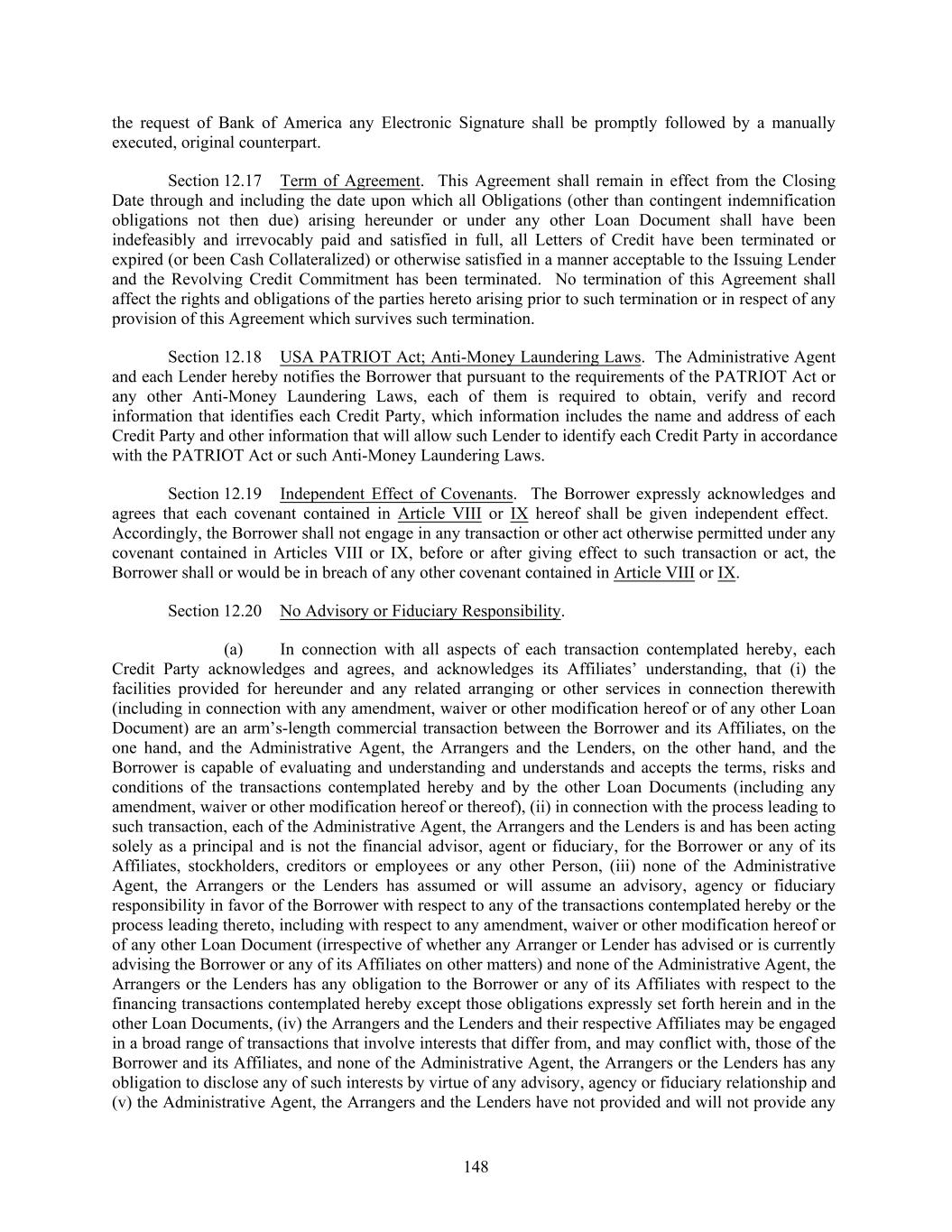 the request of Bank of America any Electronic Signature shall be promptly followed by a manuallyexecuted, original counterpart.Section 12.17 Term of Agreement. This Agreement shall remain in effect from the ClosingDate through and including the date upon which all Obligations (other than contingent indemnificationobligations not then due) arising hereunder or under any other Loan Document shall have beenindefeasibly and irrevocably paid and satisfied in full, all Letters of Credit have been terminated orexpired (or been Cash Collateralized) or otherwise satisfied in a manner acceptable to the Issuing Lenderand the Revolving Credit Commitment has been terminated. No termination of this Agreement shallaffect the rights and obligations of the parties hereto arising prior to such termination or in respect of anyprovision of this Agreement which survives such termination.Section 12.18 USA PATRIOT Act; Anti-Money Laundering Laws. The Administrative Agentand each Lender hereby notifies the Borrower that pursuant to the requirements of the PATRIOT Act orany other Anti-Money Laundering Laws, each of them is required to obtain, verify and recordinformation that identifies each Credit Party, which information includes the name and address of eachCredit Party and other information that will allow such Lender to identify each Credit Party in accordancewith the PATRIOT Act or such Anti-Money Laundering Laws.Section 12.19 Independent Effect of Covenants. The Borrower expressly acknowledges andagrees that each covenant contained in Article VIII or IX hereof shall be given independent effect.Accordingly, the Borrower shall not engage in any transaction or other act otherwise permitted under anycovenant contained in Articles VIII or IX, before or after giving effect to such transaction or act, theBorrower shall or would be in breach of any other covenant contained in Article VIII or IX.Section 12.20 No Advisory or Fiduciary Responsibility.(a) In connection with all aspects of each transaction contemplated hereby, eachCredit Party acknowledges and agrees, and acknowledges its Affiliates’ understanding, that (i) thefacilities provided for hereunder and any related arranging or other services in connection therewith(including in connection with any amendment, waiver or other modification hereof or of any other LoanDocument) are an arm’s-length commercial transaction between the Borrower and its Affiliates, on theone hand, and the Administrative Agent, the Arrangers and the Lenders, on the other hand, and theBorrower is capable of evaluating and understanding and understands and accepts the terms, risks andconditions of the transactions contemplated hereby and by the other Loan Documents (including anyamendment, waiver or other modification hereof or thereof), (ii) in connection with the process leading tosuch transaction, each of the Administrative Agent, the Arrangers and the Lenders is and has been actingsolely as a principal and is not the financial advisor, agent or fiduciary, for the Borrower or any of itsAffiliates, stockholders, creditors or employees or any other Person, (iii) none of the AdministrativeAgent, the Arrangers or the Lenders has assumed or will assume an advisory, agency or fiduciaryresponsibility in favor of the Borrower with respect to any of the transactions contemplated hereby or theprocess leading thereto, including with respect to any amendment, waiver or other modification hereof orof any other Loan Document (irrespective of whether any Arranger or Lender has advised or is currentlyadvising the Borrower or any of its Affiliates on other matters) and none of the Administrative Agent, theArrangers or the Lenders has any obligation to the Borrower or any of its Affiliates with respect to thefinancing transactions contemplated hereby except those obligations expressly set forth herein and in theother Loan Documents, (iv) the Arrangers and the Lenders and their respective Affiliates may be engagedin a broad range of transactions that involve interests that differ from, and may conflict with, those of theBorrower and its Affiliates, and none of the Administrative Agent, the Arrangers or the Lenders has anyobligation to disclose any of such interests by virtue of any advisory, agency or fiduciary relationship and(v) the Administrative Agent, the Arrangers and the Lenders have not provided and will not provide any148