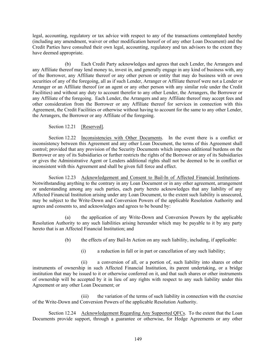 legal, accounting, regulatory or tax advice with respect to any of the transactions contemplated hereby(including any amendment, waiver or other modification hereof or of any other Loan Document) and theCredit Parties have consulted their own legal, accounting, regulatory and tax advisors to the extent theyhave deemed appropriate.(b) Each Credit Party acknowledges and agrees that each Lender, the Arrangers andany Affiliate thereof may lend money to, invest in, and generally engage in any kind of business with, anyof the Borrower, any Affiliate thereof or any other person or entity that may do business with or ownsecurities of any of the foregoing, all as if such Lender, Arranger or Affiliate thereof were not a Lender orArranger or an Affiliate thereof (or an agent or any other person with any similar role under the CreditFacilities) and without any duty to account therefor to any other Lender, the Arrangers, the Borrower orany Affiliate of the foregoing. Each Lender, the Arrangers and any Affiliate thereof may accept fees andother consideration from the Borrower or any Affiliate thereof for services in connection with thisAgreement, the Credit Facilities or otherwise without having to account for the same to any other Lender,the Arrangers, the Borrower or any Affiliate of the foregoing.Section 12.21 [Reserved].Section 12.22 Inconsistencies with Other Documents. In the event there is a conflict orinconsistency between this Agreement and any other Loan Document, the terms of this Agreement shallcontrol; provided that any provision of the Security Documents which imposes additional burdens on theBorrower or any of its Subsidiaries or further restricts the rights of the Borrower or any of its Subsidiariesor gives the Administrative Agent or Lenders additional rights shall not be deemed to be in conflict orinconsistent with this Agreement and shall be given full force and effect.Section 12.23 Acknowledgement and Consent to Bail-In of Affected Financial Institutions.Notwithstanding anything to the contrary in any Loan Document or in any other agreement, arrangementor understanding among any such parties, each party hereto acknowledges that any liability of anyAffected Financial Institution arising under any Loan Document, to the extent such liability is unsecured,may be subject to the Write-Down and Conversion Powers of the applicable Resolution Authority andagrees and consents to, and acknowledges and agrees to be bound by:(a) the application of any Write-Down and Conversion Powers by the applicableResolution Authority to any such liabilities arising hereunder which may be payable to it by any partyhereto that is an Affected Financial Institution; and(b) the effects of any Bail-In Action on any such liability, including, if applicable:(i) a reduction in full or in part or cancellation of any such liability;(ii) a conversion of all, or a portion of, such liability into shares or otherinstruments of ownership in such Affected Financial Institution, its parent undertaking, or a bridgeinstitution that may be issued to it or otherwise conferred on it, and that such shares or other instrumentsof ownership will be accepted by it in lieu of any rights with respect to any such liability under thisAgreement or any other Loan Document; or(iii) the variation of the terms of such liability in connection with the exerciseof the Write-Down and Conversion Powers of the applicable Resolution Authority.Section 12.24 Acknowledgement Regarding Any Supported QFCs. To the extent that the LoanDocuments provide support, through a guarantee or otherwise, for Hedge Agreements or any other149