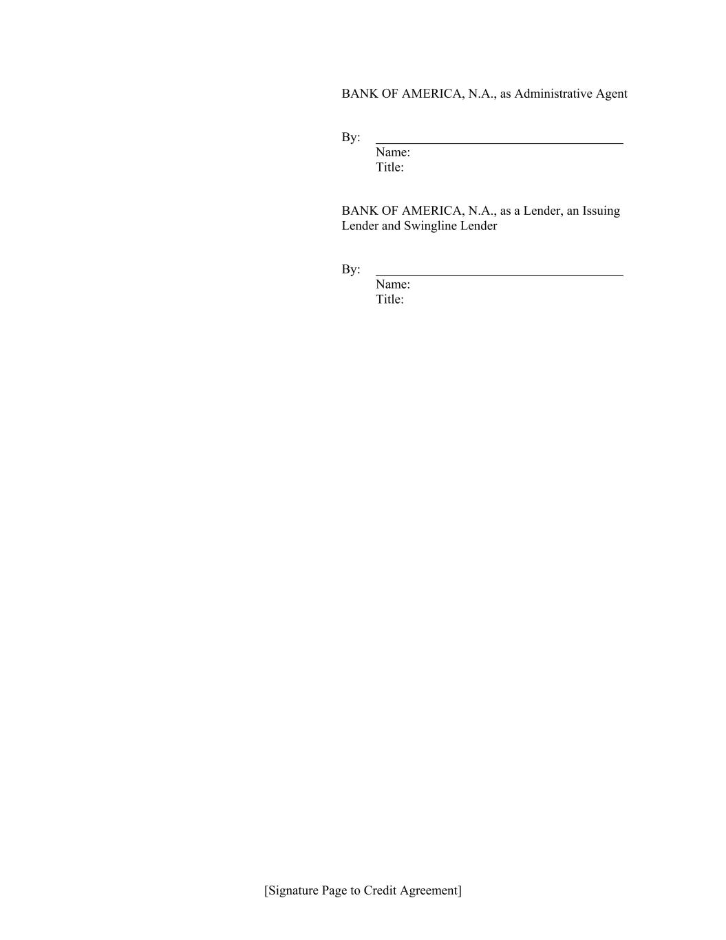 BANK OF AMERICA, N.A., as Administrative AgentBy: Name:Title:BANK OF AMERICA, N.A., as a Lender, an IssuingLender and Swingline LenderBy: Name:Title:[Signature Page to Credit Agreement]
