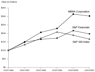 The following chart compares the total return on the Corporation’s common stock from December 31, 1996 through December 31, 2001 to the total return for the same periods of the S&P 500 and S&P Financial Indices. The graph assumes that the value of the investment in the Corporation’s common stock and each index was $100 at December 31, 1996 and that all dividends were reinvested. While total return comparisons may be useful to investors in gauging the performance of the Corporation’s common stock, in the opinion of the Corporation’s management and Board of Directors, the total return on the Corporation’s common stock may not necessarily relate directly to the performance of the Corporation’s management and should be used only as one of several important measures including, for example, net income, managed loans, new accounts, managed credit losses, customer retention, and operating efficiency.