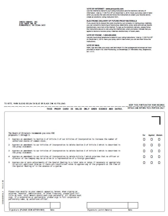 Important Notice Regarding the Availability of Proxy Materials for the Special Meeting: The Notice & Proxy Statement is available at www.proxyvote.com IMEDIA BRANDS, INC. Special Meeting of Shareholders December 3, 2019 This proxy is solicited by the Board of Directors The shareholder(s) hereby appoint(s) Tim Peterman, Michael Porter and James Spolar, or either of them, as proxies, each with the power to appoint his substitute, and hereby authorizes them to represent and to vote, as designated on the reverse side of this ballot, all of the shares of Common stock of IMEDIA BRANDS, INC. that the shareholder(s) are entitled to vote at the Special Meeting of Shareholder(s) to be held at 9:00 AM CDT on December 3, 2019, at the IMEDIA BRANDS, INC. corporate offices, 6690 Shady Oak Road, Eden Prairie, MN 55344, and any adjournment or postponement thereof. This proxy, when properly executed, will be voted in the manner directed herein. If no such direction is made, this proxy will be voted in accordance with the Board of Directors' recommendations. Continued and to be signed on reverse side 0000430954_2 R1.0.1.18