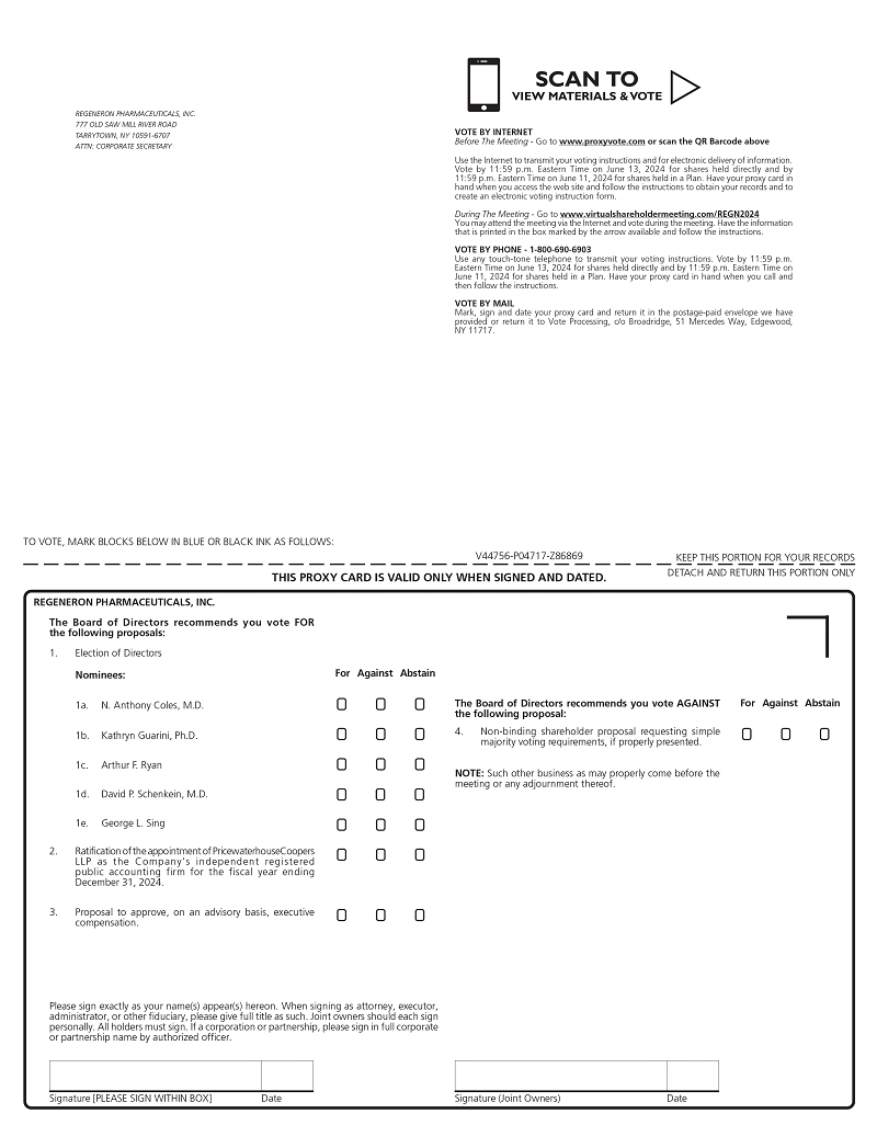 Pursuant to the rules of the Securities and Exchange Commission (the “SEC”), we have elected to use the “Notice and Access” method of providing our proxy materials over the Internet. Accordingly, we will mail, beginning on or about April 25, 2024, a Notice of Internet Availability of Proxy Materials to our shareholders of record and beneficial owners as of the record date (other than (i) those who previously elected to receive proxy materials by e-mail, (ii) those who have previously asked to receive paper copies of the proxy materials, and (iii) shareholders who participate and hold shares of common stock in the Regeneron Pharmaceuticals, Inc. 401(k) Savings Plan or the Regeneron Ireland Share Participation Plan). As of the date of mailing of the Notice of Internet Availability of Proxy Materials, all shareholders and beneficial owners will have the ability to access all of the proxy materials on a website referenced in the Notice of Internet Availability of Proxy Materials.