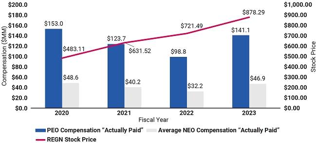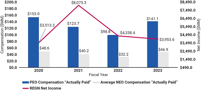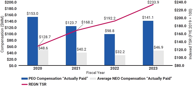 This proxy statement uses non-GAAP net income, non-GAAP net income per share, and total revenues excluding RonapreveTM, which are financial measures that are not calculated in accordance with U.S. Generally Accepted Accounting Principles (“GAAP”). These non-GAAP financial measures are computed by excluding certain non-cash and other items from the related GAAP financial measure. Non-GAAP adjustments also include the estimated income tax effect of reconciling items. The Company makes such adjustments for items the Company does not view as useful in evaluating its operating performance. For example, adjustments may be made for items that fluctuate from period to period based on factors that are not within the Company’s control (such as the Company’s stock price on the dates share-based grants are issued) or items that are not associated with normal, recurring operations (such as changes in applicable laws and regulations). Management uses these non-GAAP measures for planning, budgeting, forecasting, assessing historical performance, and making financial and operational decisions, and also provides forecasts to investors on this basis. Additionally, such non-GAAP measures provide investors with an enhanced understanding of the financial performance of the Company’s core business operations. However, there are limitations in the use of these and other non-GAAP financial measures as they exclude certain expenses that are recurring in nature. Furthermore, the Company’s non-GAAP financial measures may not be comparable with non-GAAP information provided by other companies. Any non-GAAP financial measure presented by Regeneron should be considered supplemental to, and not a substitute for, measures of financial performance prepared in accordance with GAAP. A reconciliation of the Company’s historical GAAP to non-GAAP results is included below.